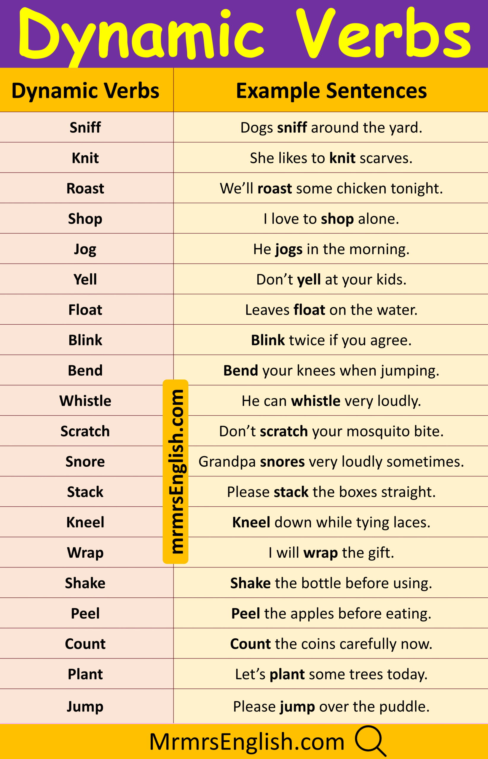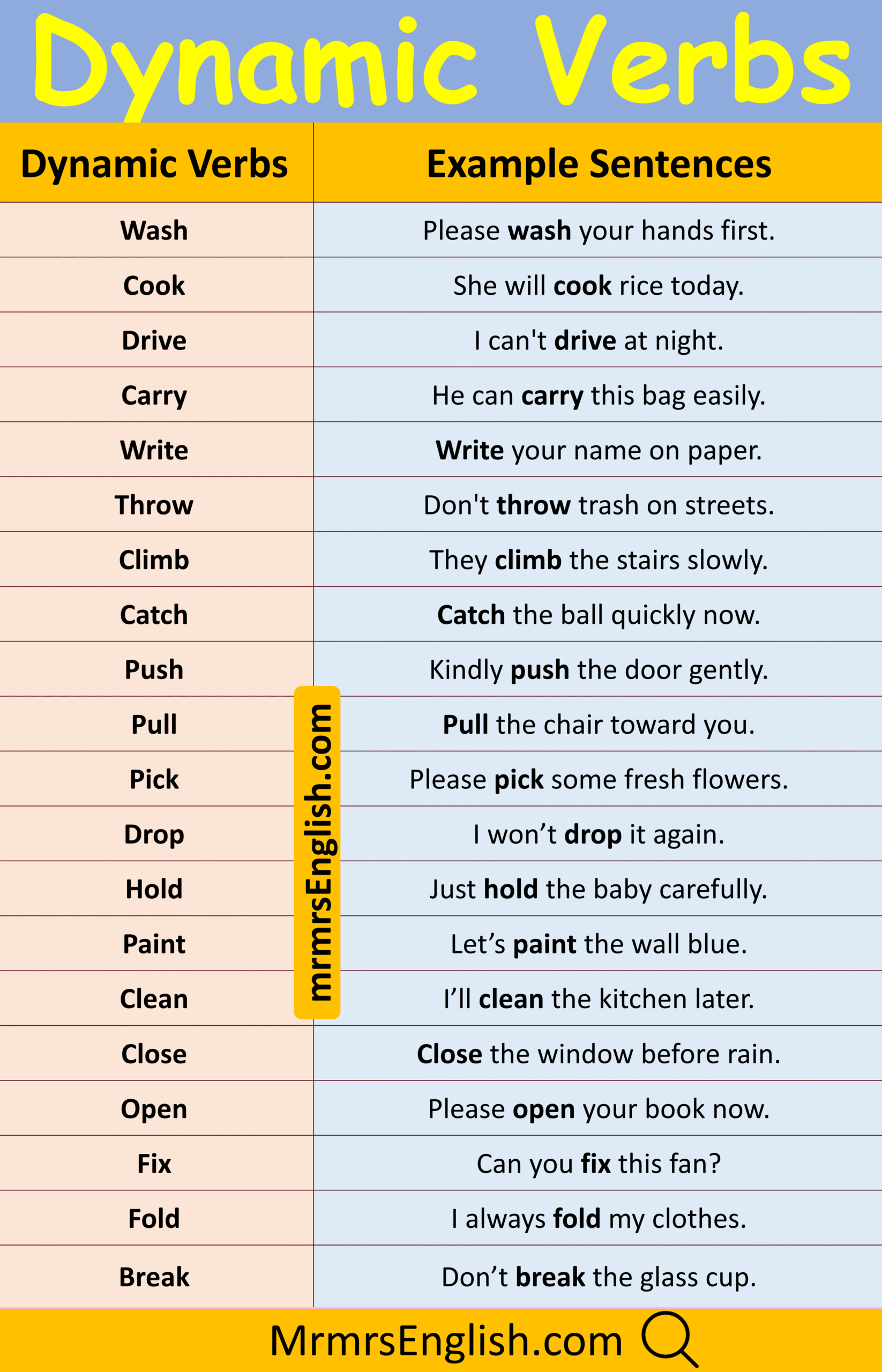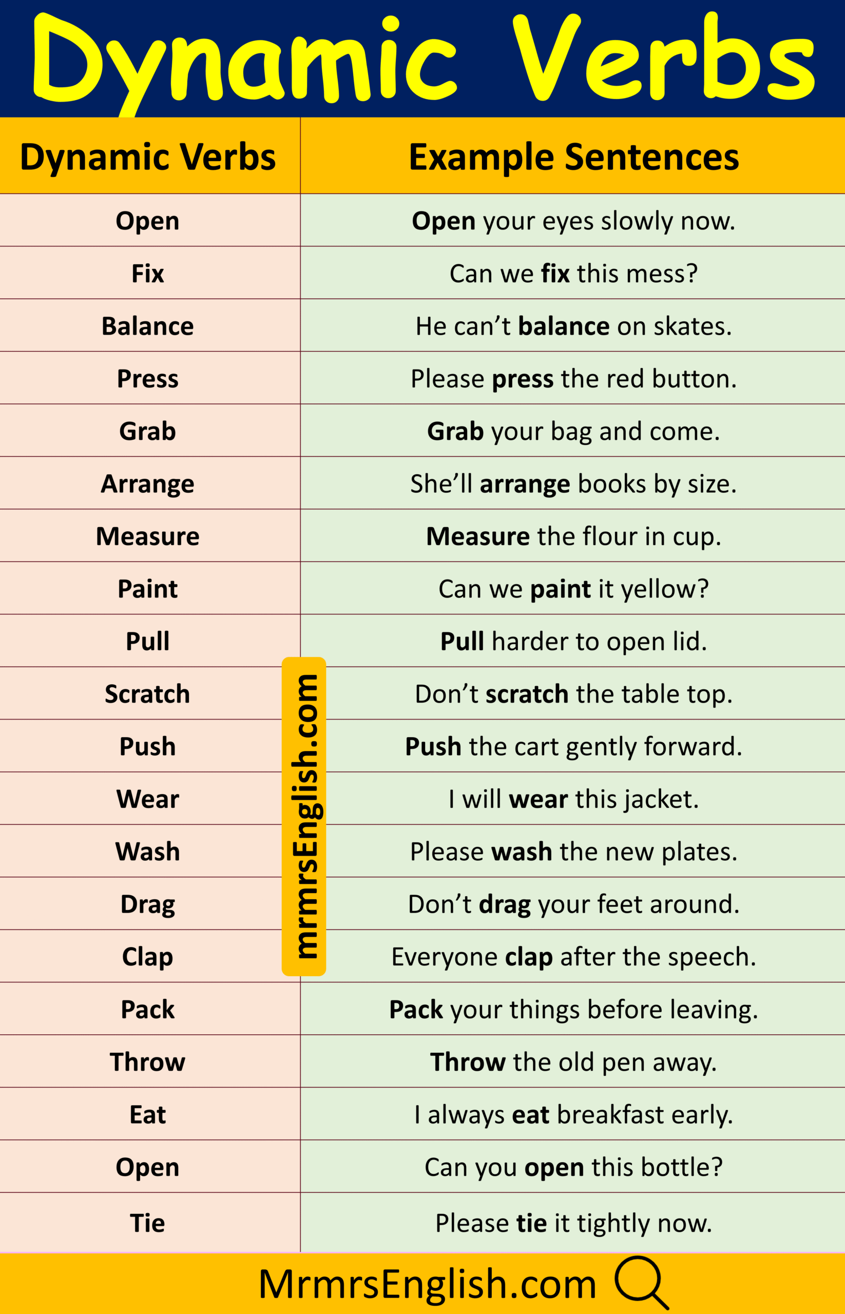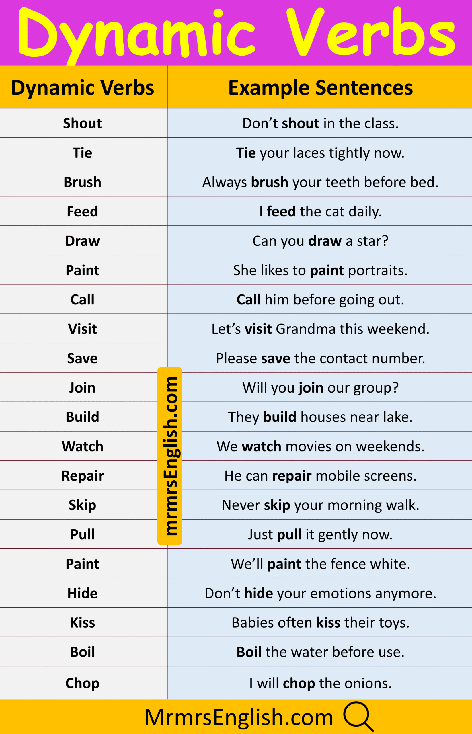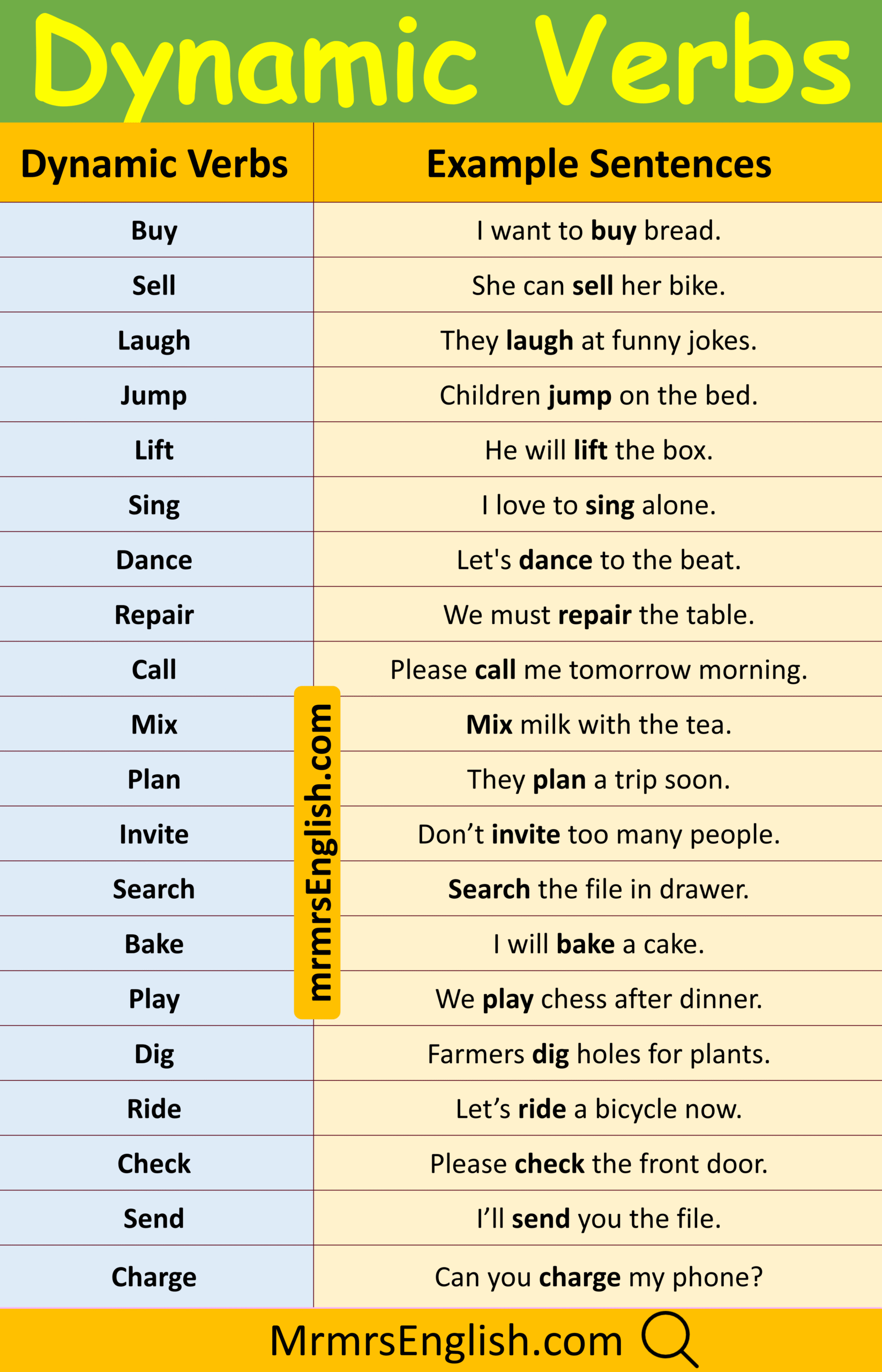 100 Dynamic Verbs Examples Sentences in English with Pictures