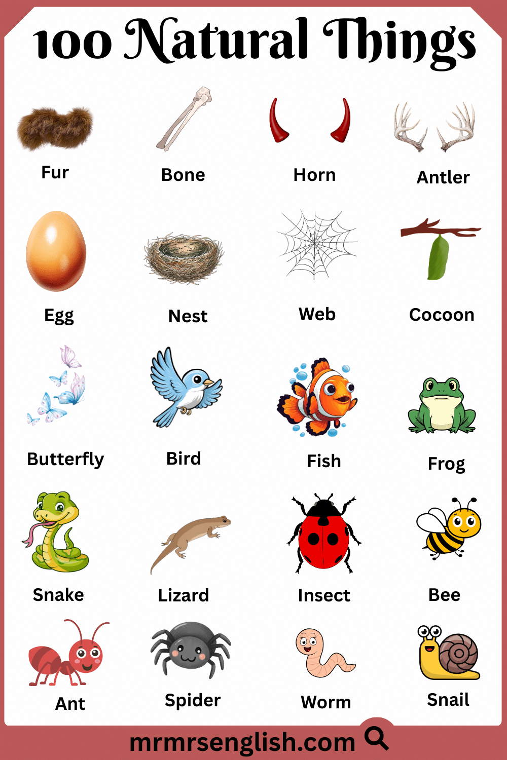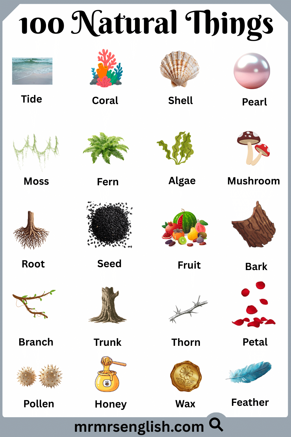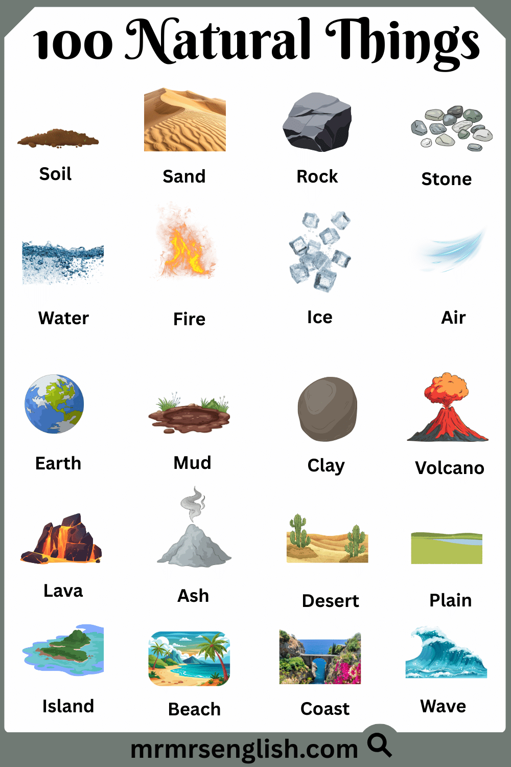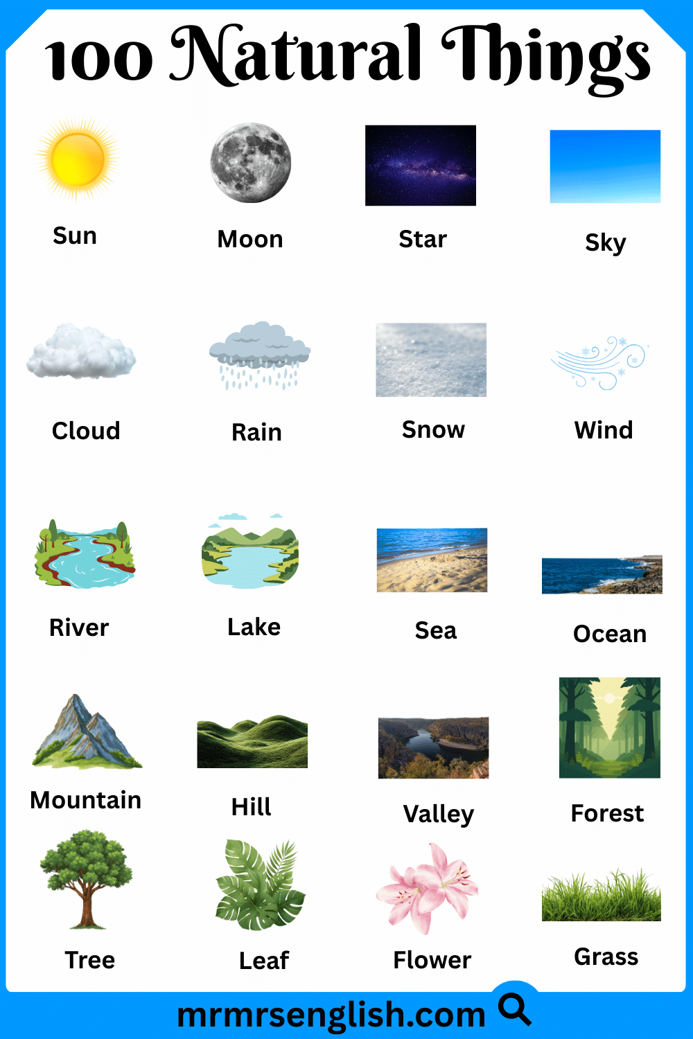 Nature surrounds us in many forms, from the land beneath our feet to the sky above us. Learning the names of natural things in English helps students understand the world around them and express ideas more clearly in speaking and writing. These words are commonly used in daily life, science lessons, and general knowledge. In this article, you will learn 100 natural things with their English names and clear pictures. The images make learning easier by helping readers recognize each natural object and connect words with real-life examples, making this guide useful for students, beginners, and curious learners of all ages.