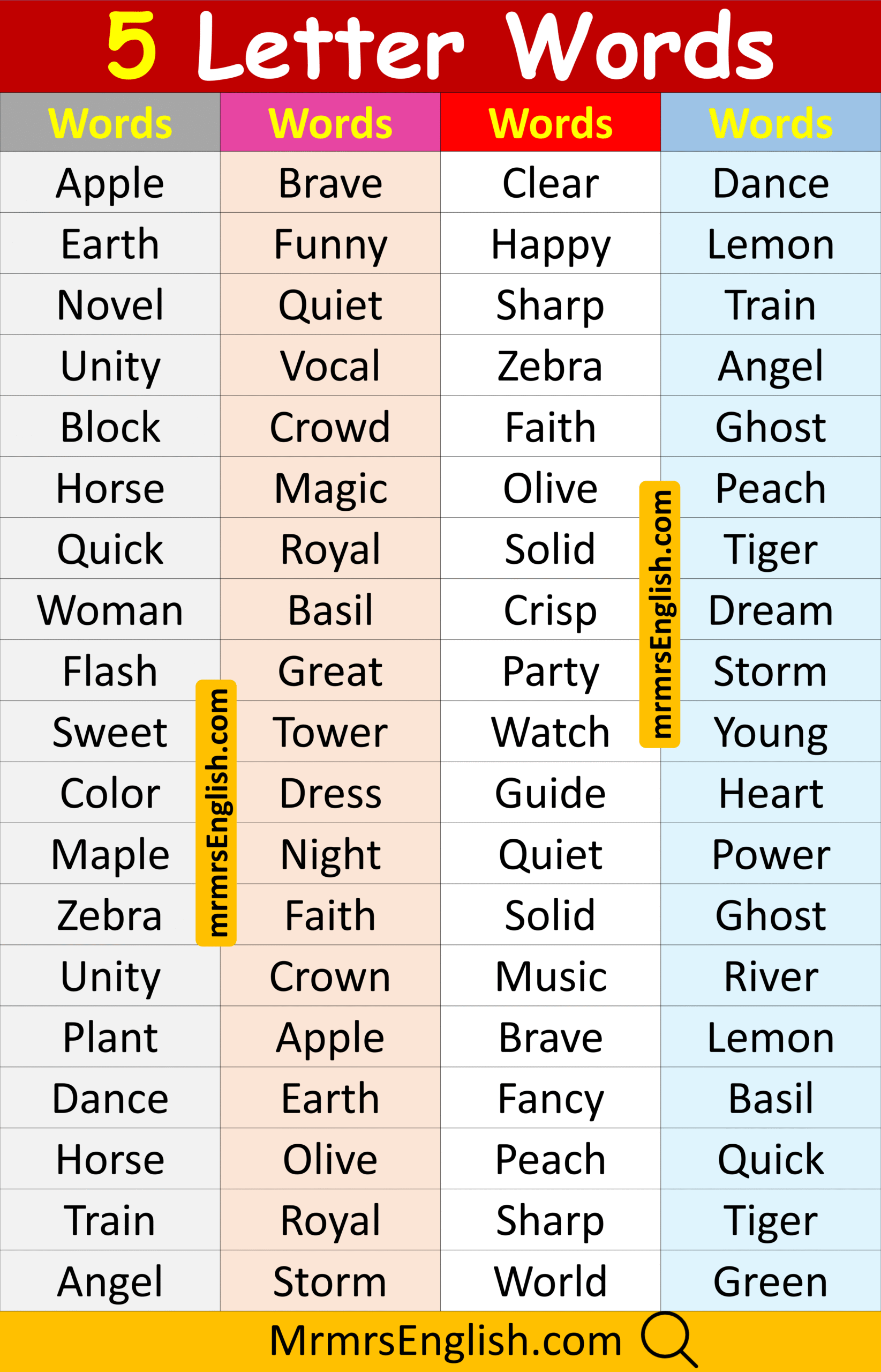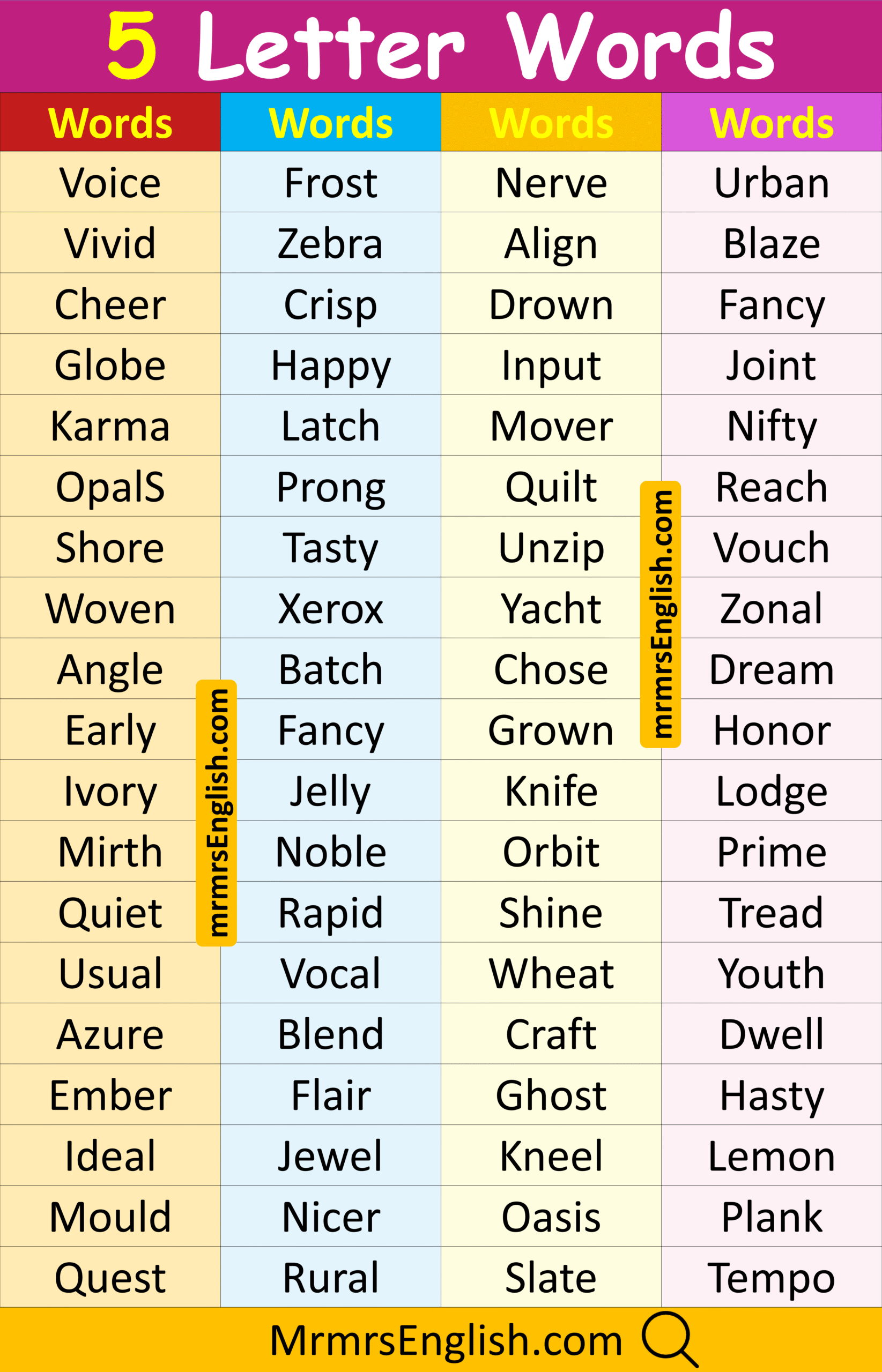 List of 5 Letter words in English with Pictures
