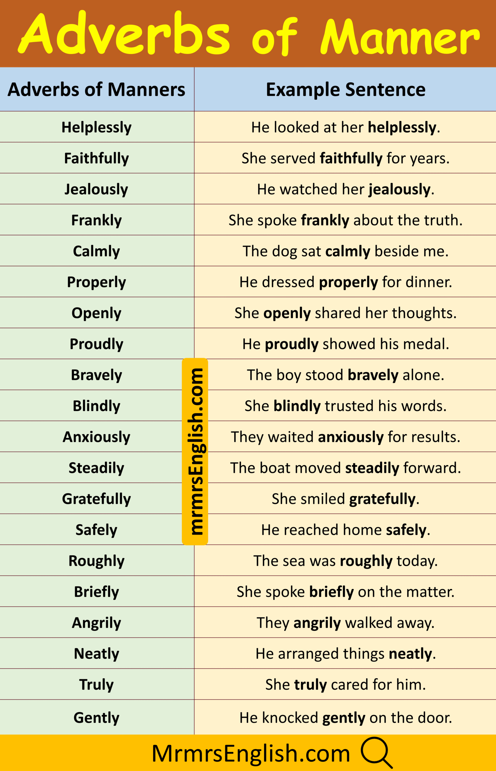Adverbs of manner help us understand how an action happens. They describe the way someone does something, for example, quickly, happily, silently, or bravely. These words make our sentences clearer and meaningful. Instead of saying “She sings,” we can say “She sings beautifully,” which gives us a better picture. In this article, you will learn easy and useful Adverbs of Manner Examples Sentences in English, along with pictures to help you remember them better. This guide is perfect for students, teachers, and anyone who wants to improve their English in a fun and simple way.