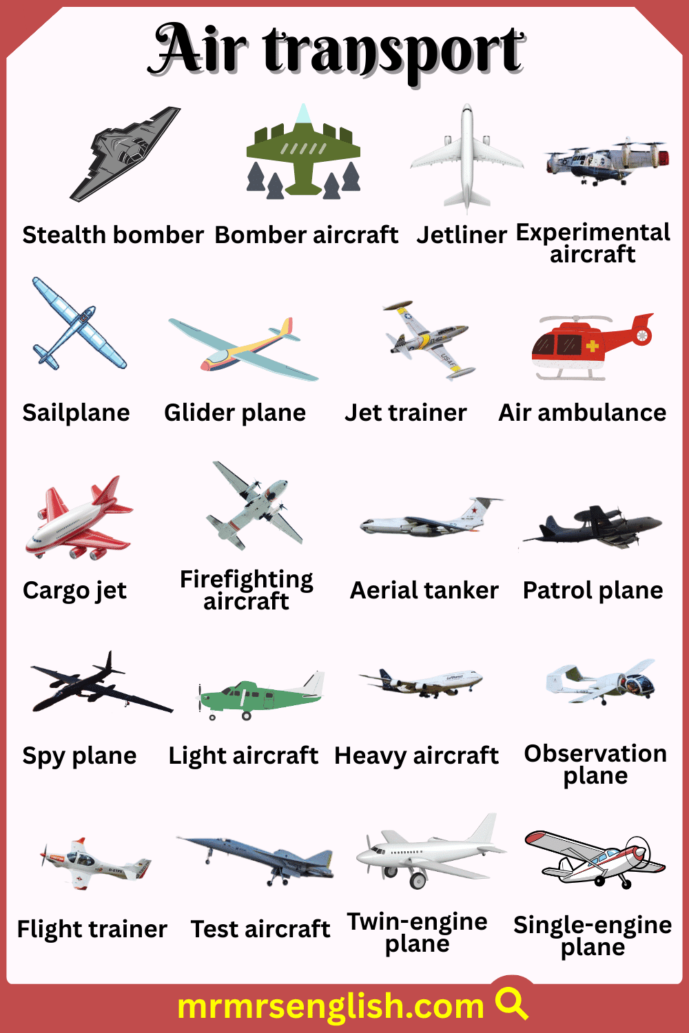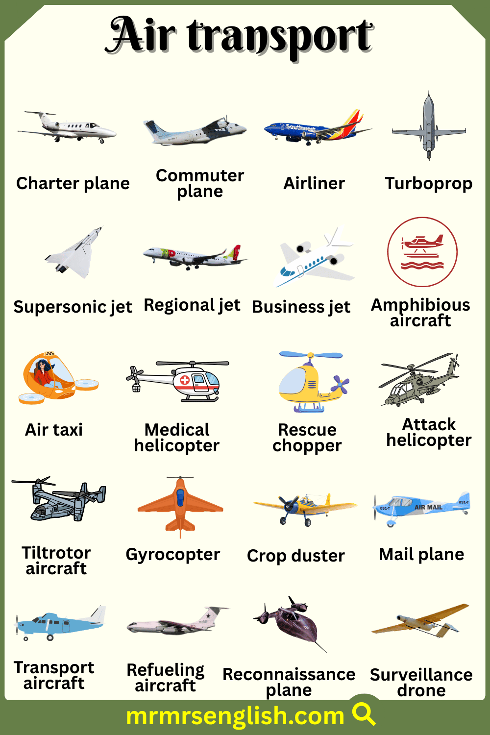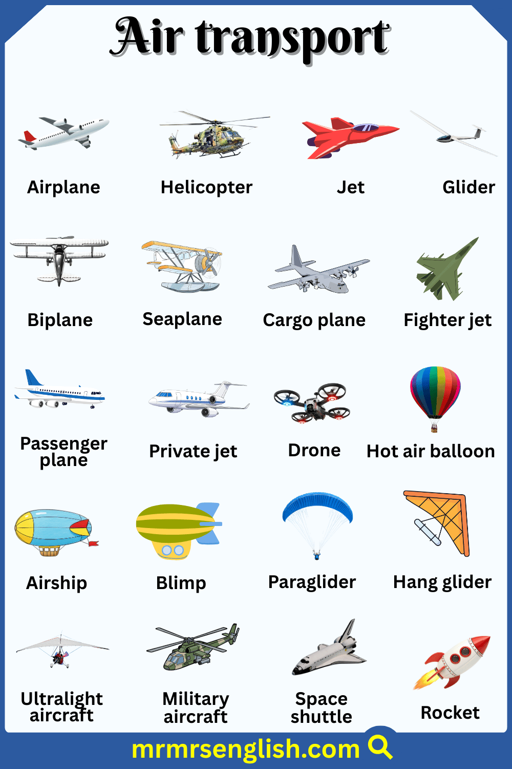 Air transport plays an important role in fast and long-distance travel around the world. From passenger airplanes to helicopters and cargo aircraft, each type of air transport serves a special purpose. These vehicles help people reach far places in a short time and also carry goods, medical supplies, and emergency aid across countries. Knowing the air transport names in English helps students and learners understand different types of flying vehicles and their uses. In this article, you will learn a complete list of air transport types with their names and pictures to help you easily identify and learn about each one. This guide is perfect for students, travelers, and anyone interested in modern transportation and aviation.