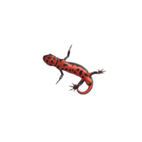 A bright red salamander with black spots, found in streams and forests.
