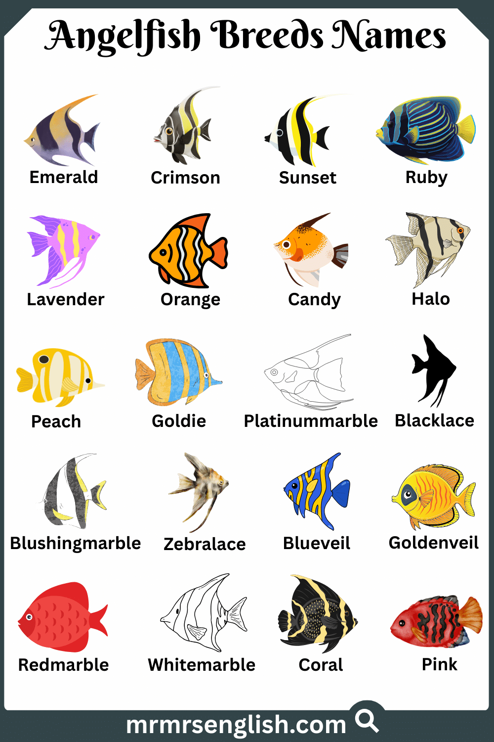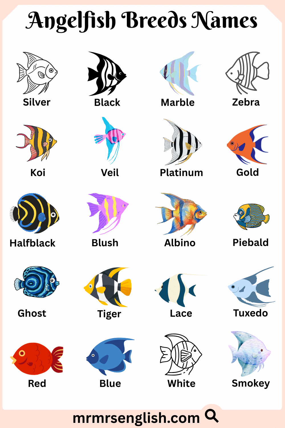 20 Names of Angelfish BreedsSilver Black Marble Zebra Koi Veil Platinum Gold Halfblack Blush Albino Piebald Ghost Tiger Lace Tuxedo Red Blue White Smokey Names of Angelfish Breeds in English with PicturesSilver Shiny silver body, classic angelfish color.