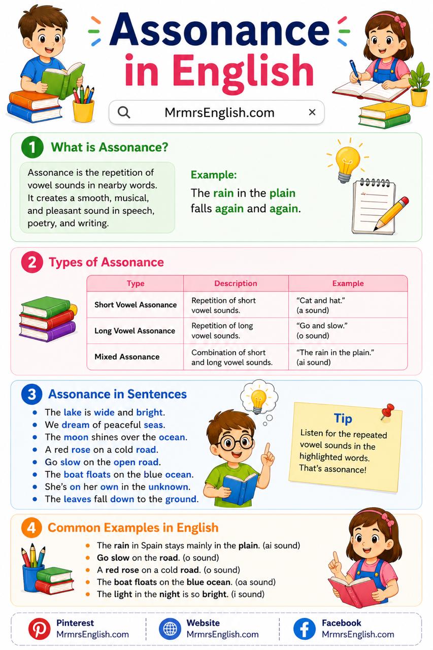 Assonance is the repetition of similar vowel sounds in nearby words. It creates rhythm, smoothness, and musical beauty in English. It is widely used in poetry, songs, speeches, and creative writing.