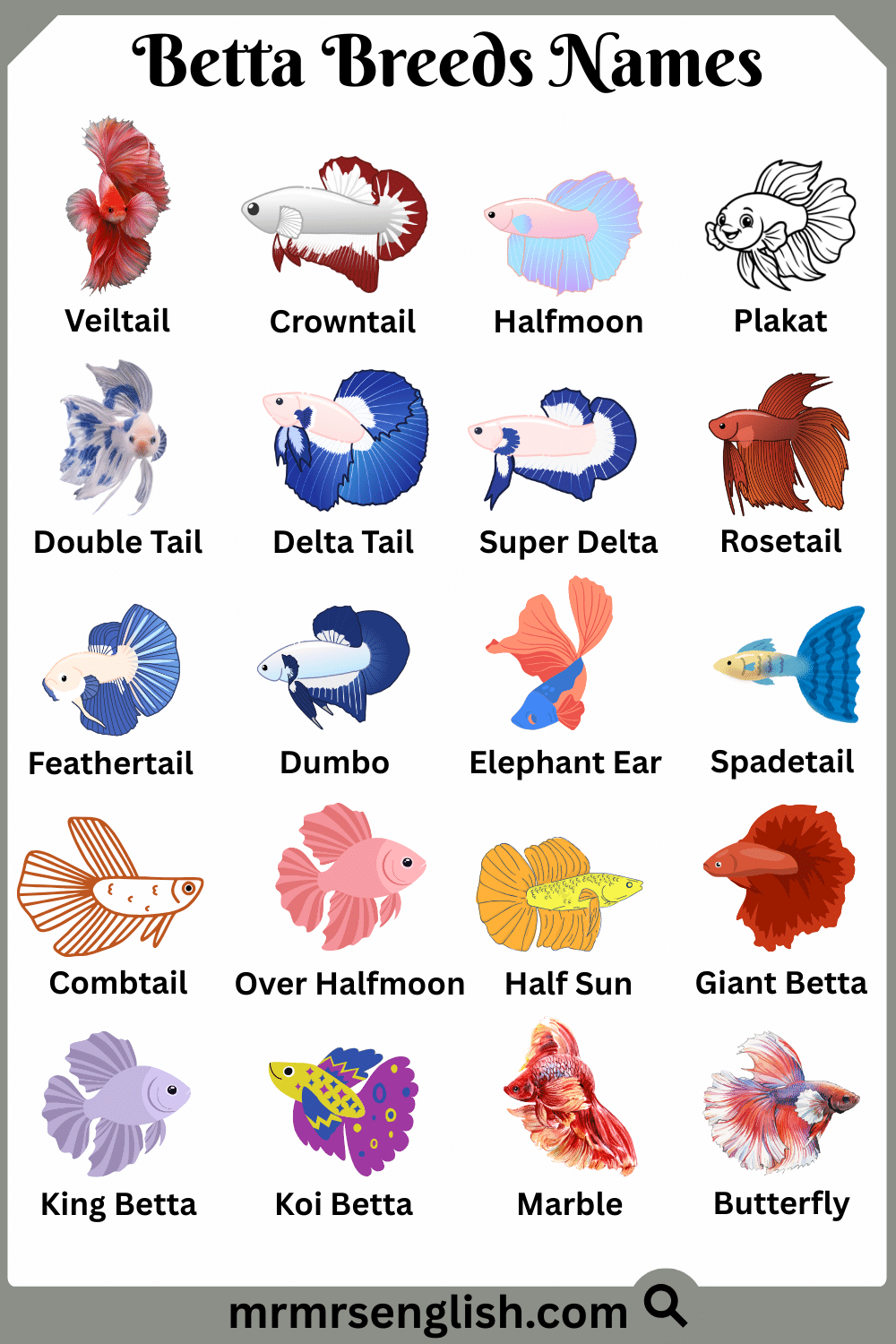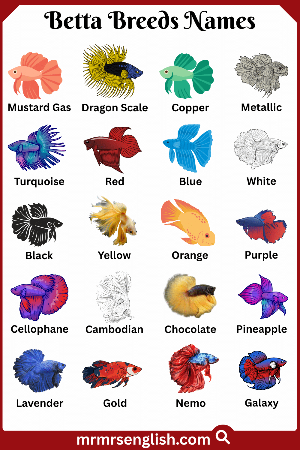 Betta fish are small, colorful, and beautiful freshwater fish that are popular among aquarium lovers. They are known for their bright colors, flowing fins, and unique patterns. There are many different breeds of betta fish, and each type has its own special shape, color, and fin style. Learning the names of betta breeds with pictures helps students and fish lovers recognize different varieties and understand their features. In this article, you will learn betta breeds names in English with their pictures, explained in simple and easy language to help readers easily identify and learn about these attractive and interesting fish.