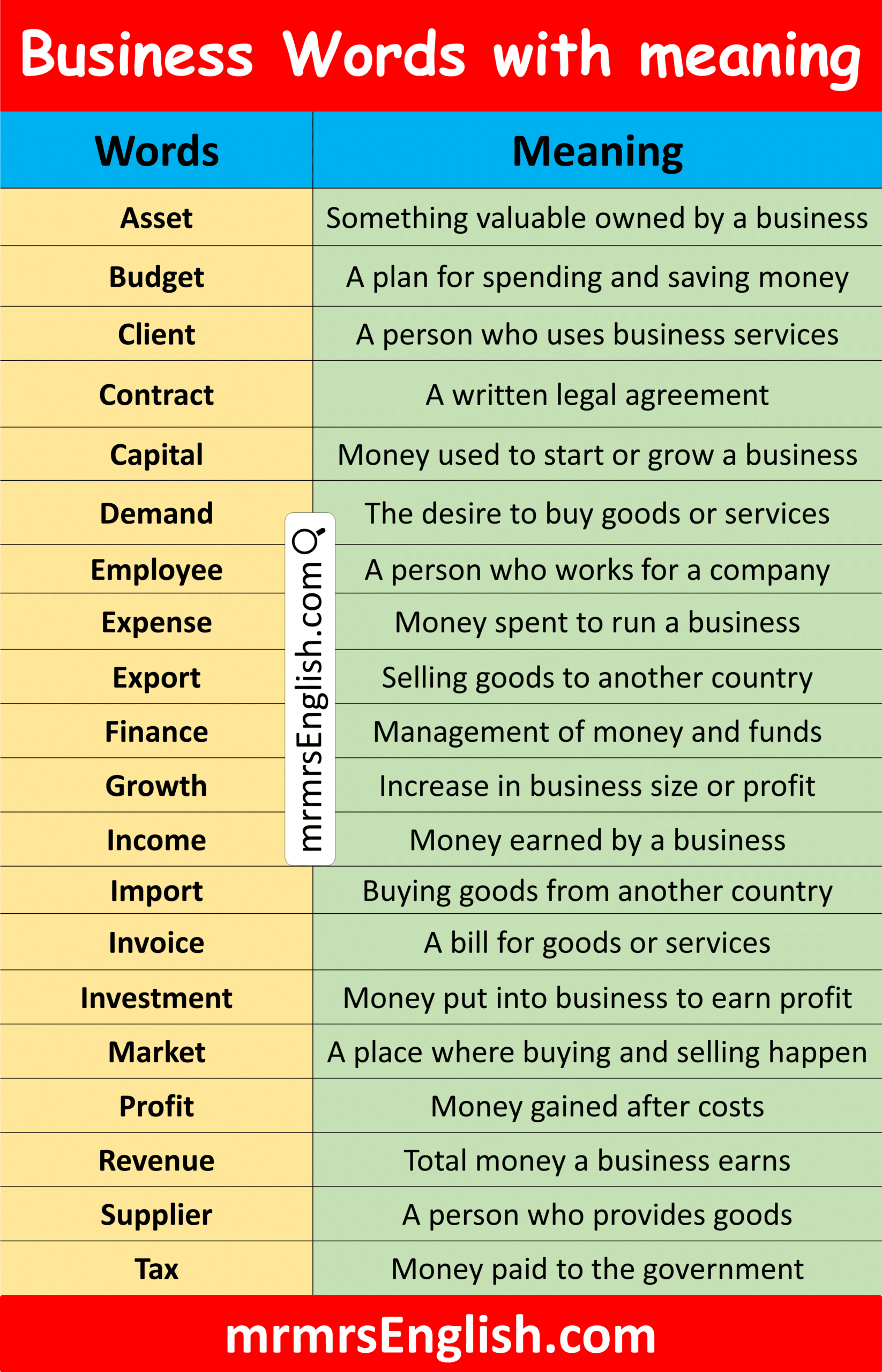 Example of Business Vocabulary Words in English