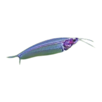 Transparent-bodied catfish, peaceful, sensitive, popular in aquariums for unique appearance.