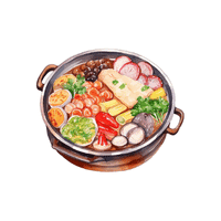 A shared meal where raw meats, seafood, and vegetables are cooked in boiling broth at the table.
