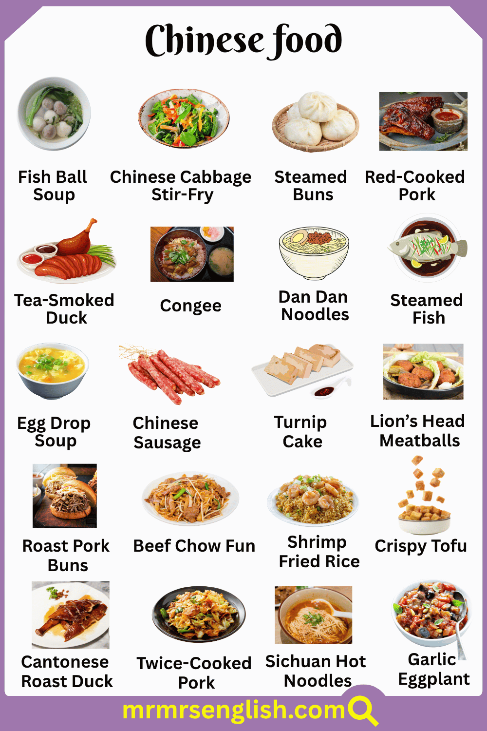Chinese food is one of the most popular cuisines in the world, loved for its rich flavors, unique recipes, and wide variety of dishes. From noodles and rice to dumplings and soups, every dish has its own taste and cultural value. Learning the names of Chinese foods in English is very useful for students, travelers, and food lovers, as it helps in ordering meals, understanding menus, and exploring new dishes with confidence. In this article, we will learn the Chinese food names in English with their pictures to make learning simple, clear, and enjoyable.