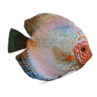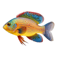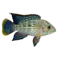 Bright, multicolored cichlid with shimmering scales, peaceful but territorial during breeding.