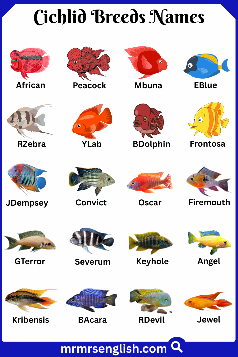 Cichlids are colorful and lively freshwater fish that are very popular in aquariums around the world. They are known for their bright colors, interesting patterns, and active behavior, which make them exciting to watch. Cichlids come in many different breeds, each with unique shapes, sizes, and color combinations. Learning cichlid breeds names in English helps students and fish enthusiasts identify each type and understand their special features. In this article, you will discover cichlid breeds names in English with their pictures, making it easy to recognize every breed and appreciate their vibrant beauty.