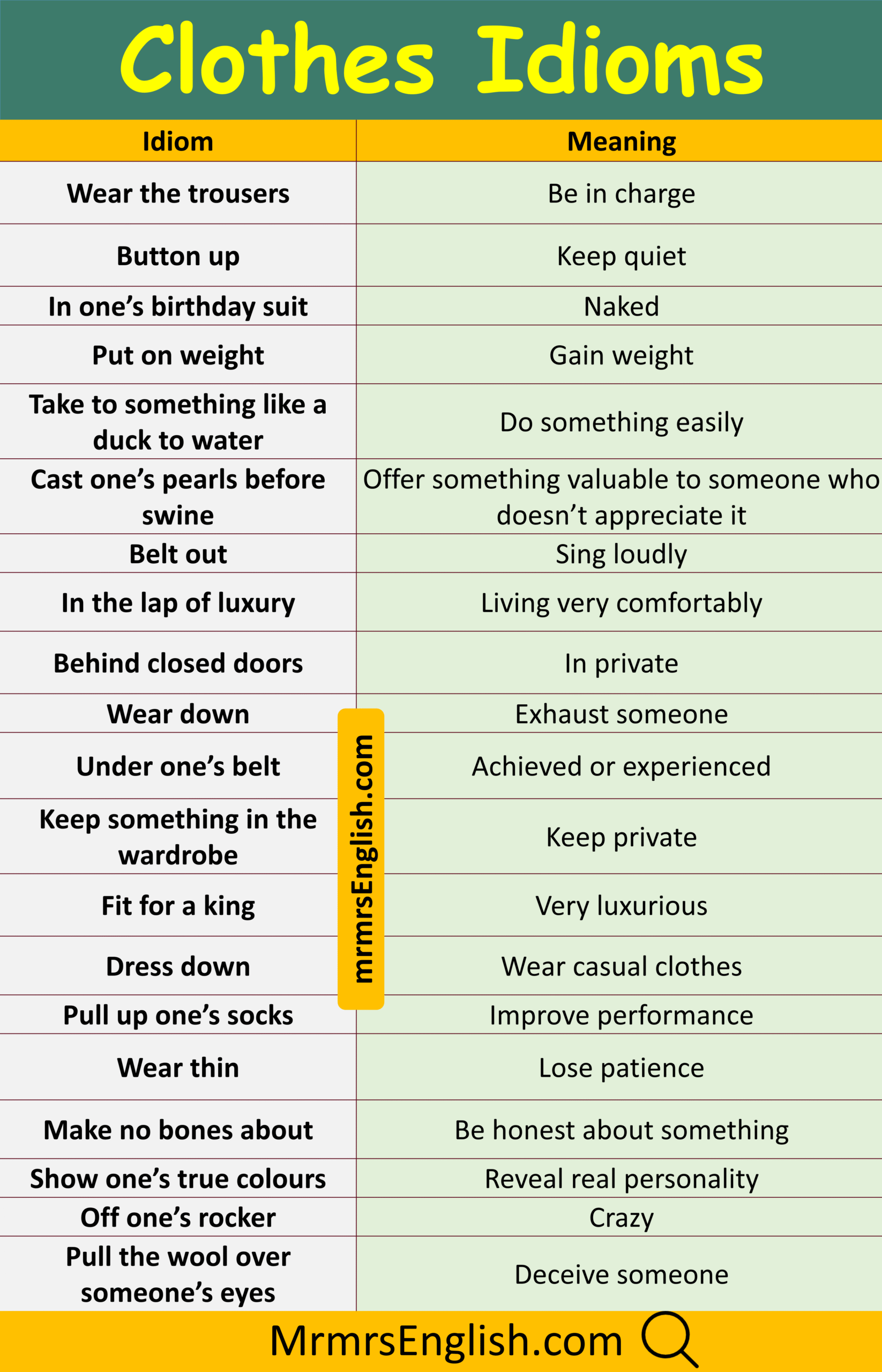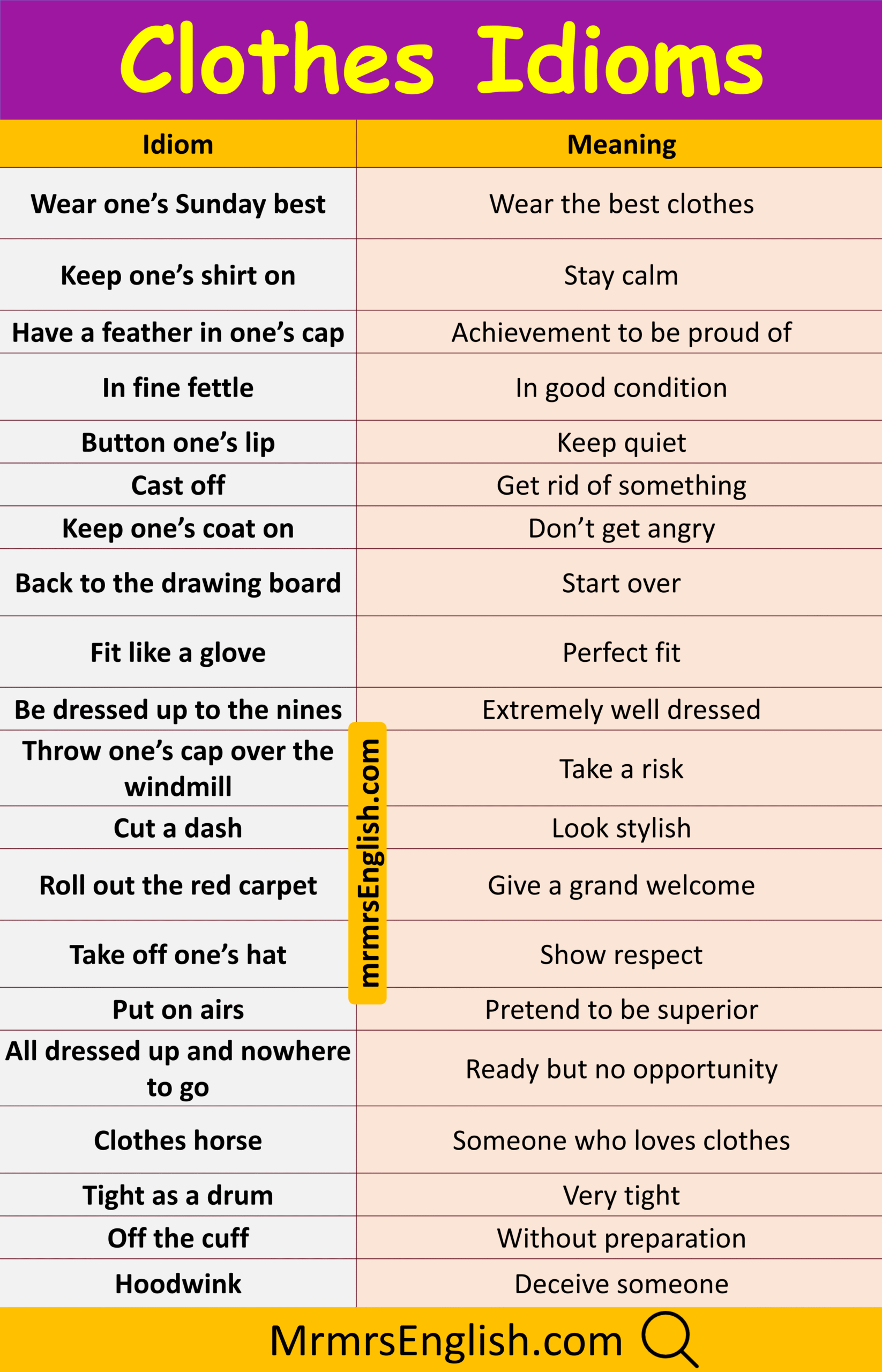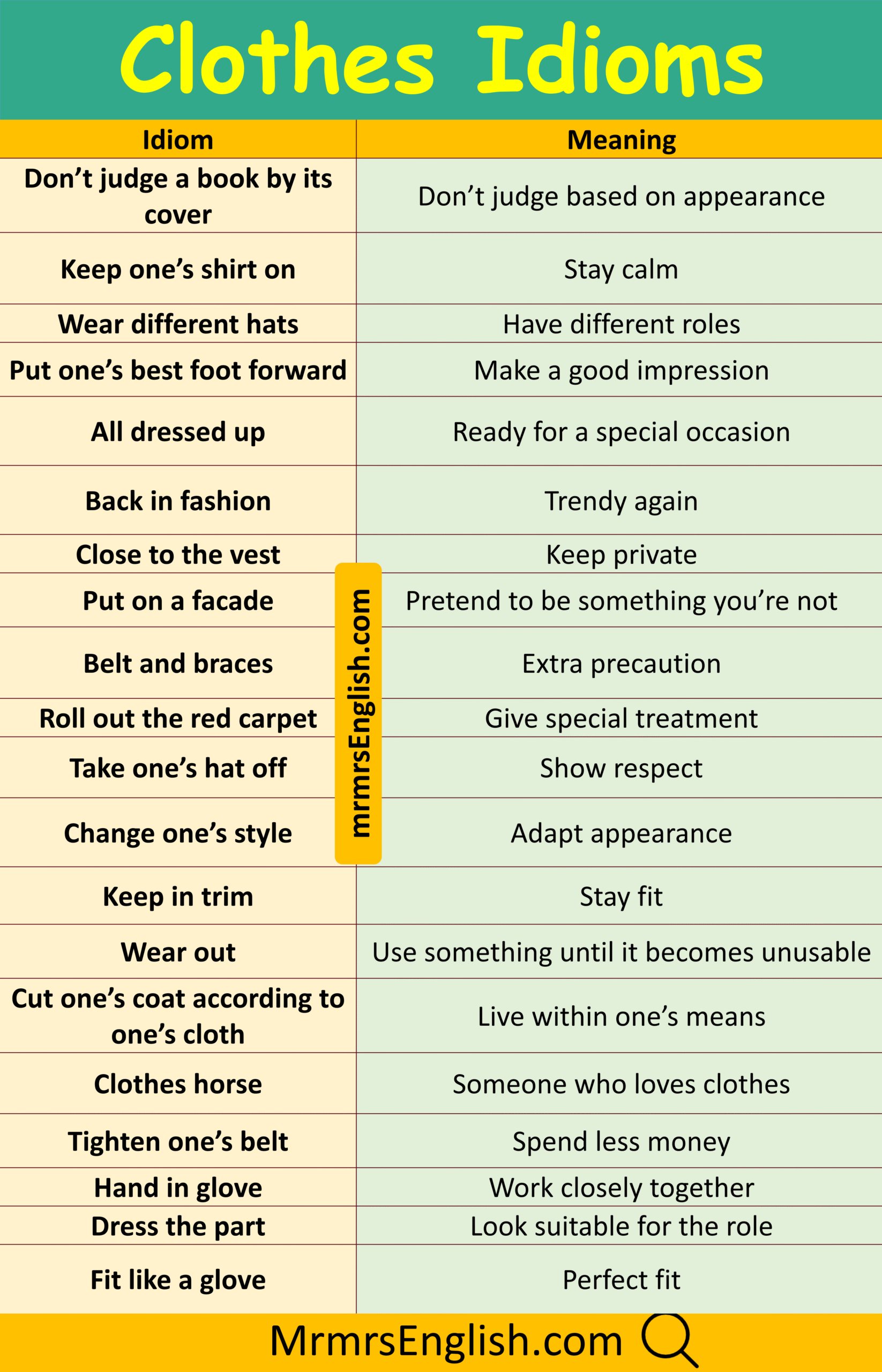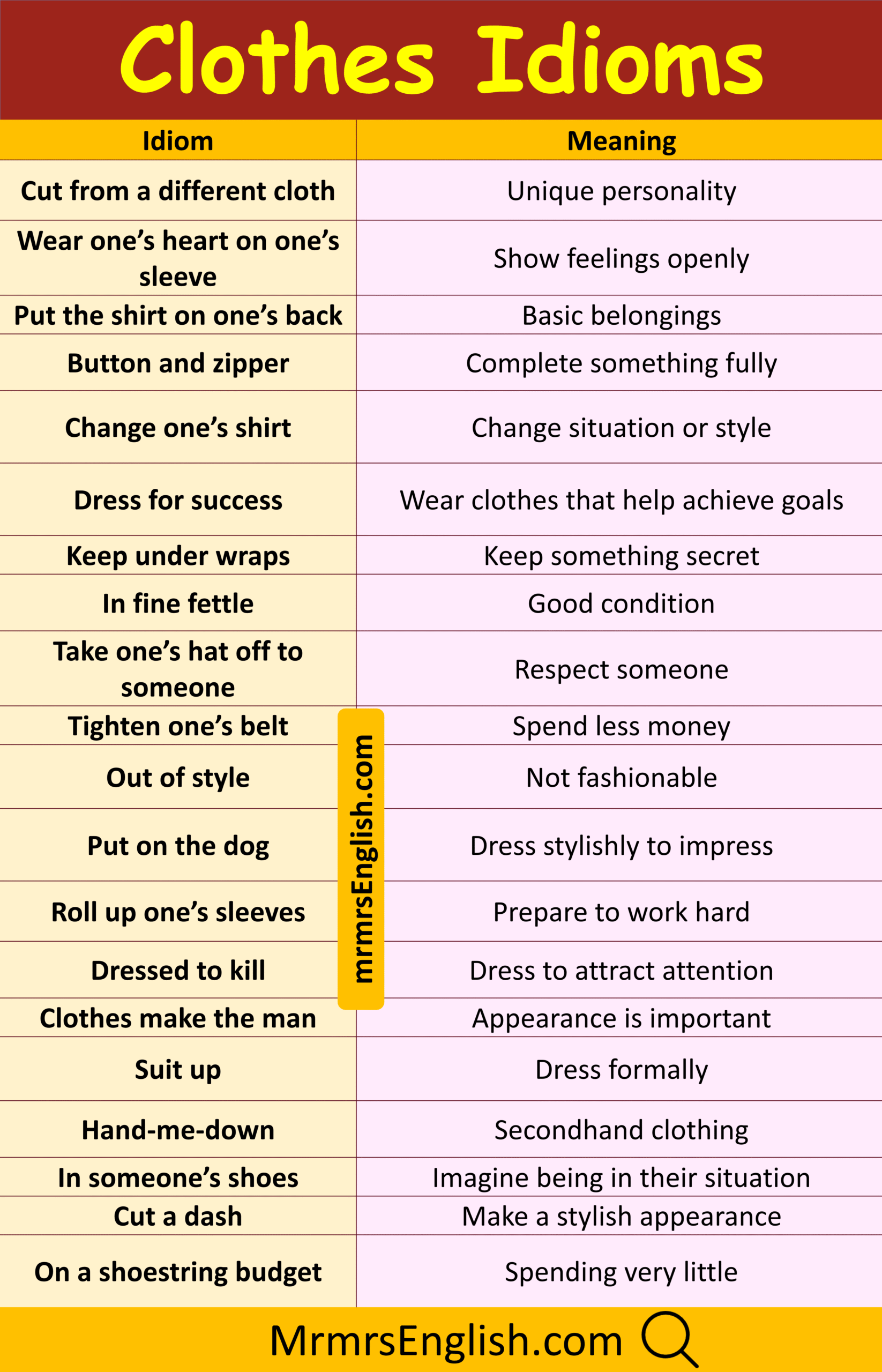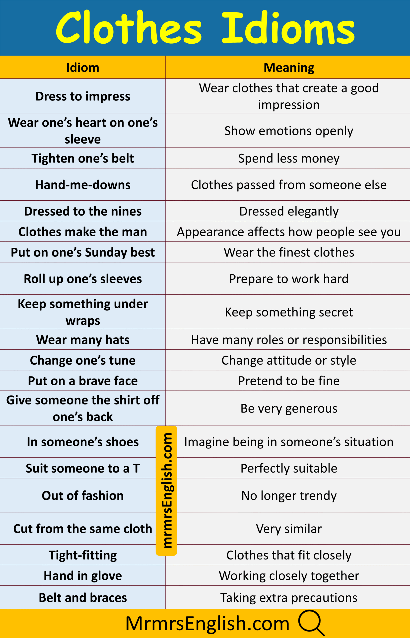 Clothes are not just a part of our daily life; they also play a big role in the way we express ideas and emotions in language. In English, many idioms are related to clothes, and they are used to describe people’s behavior, personality, or situations in a creative way. These clothes idioms add color and depth to everyday conversations, making them sound more natural and interesting. Whether you are learning English or improving your vocabulary, understanding these idioms will help you speak more fluently and confidently. In this article, you will learn some popular Clothes Idioms in English with their easy meanings and pictures to help you remember them better.