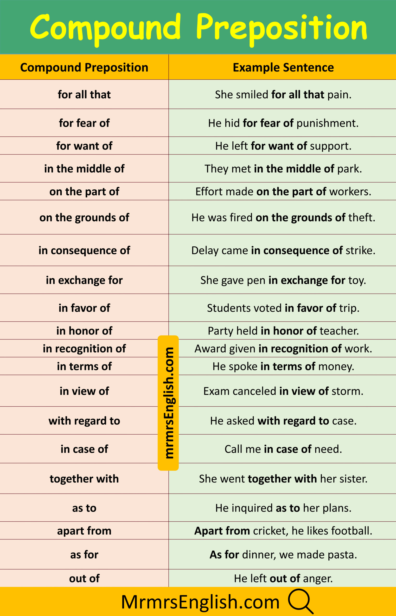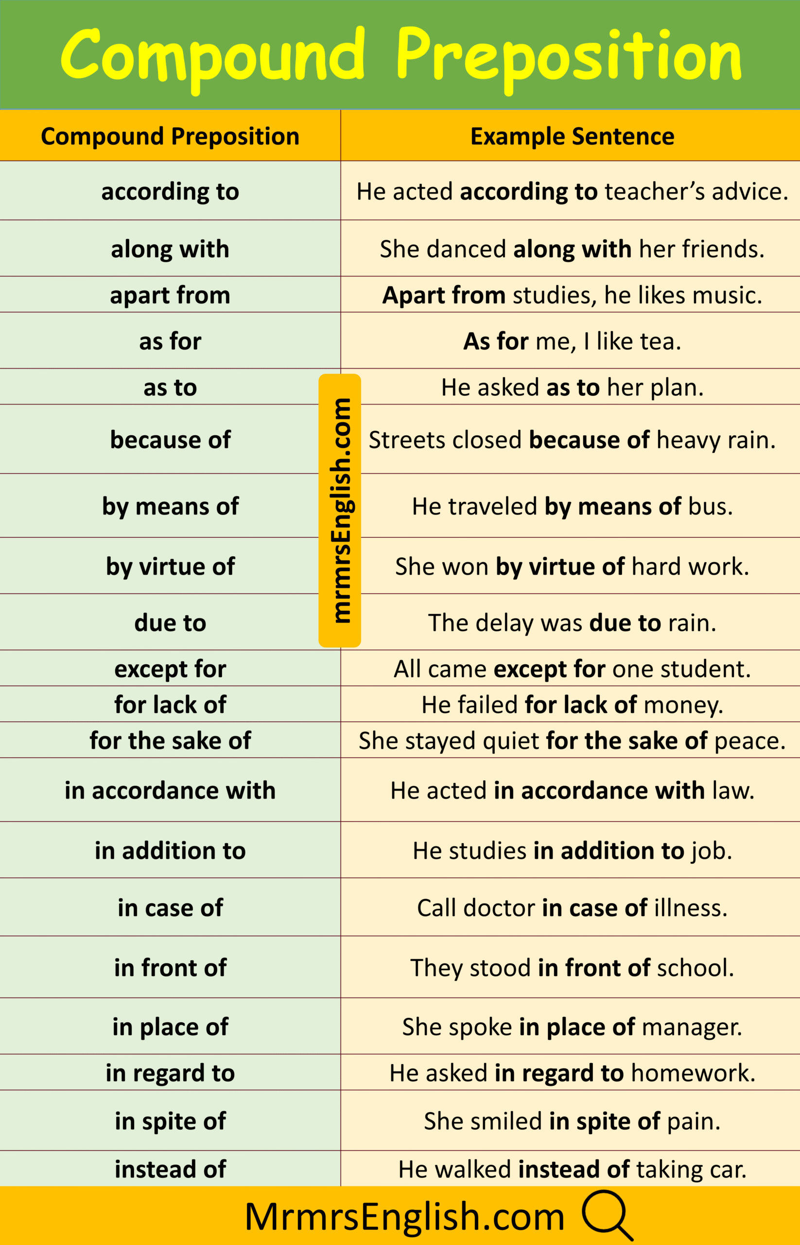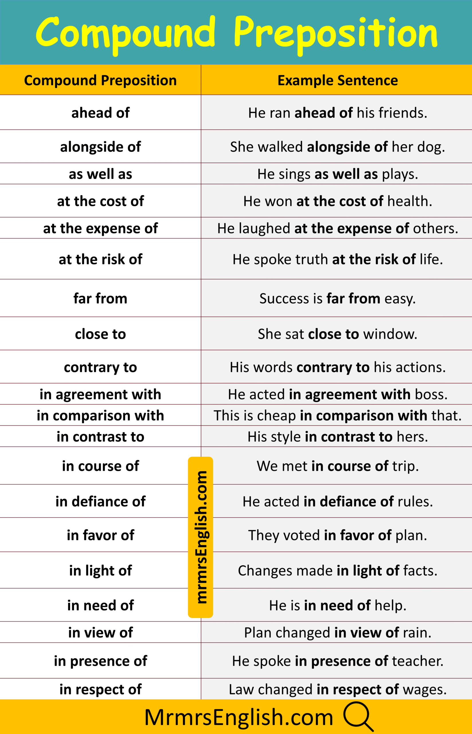Compound prepositions are groups of two or more words that work together to show the relationship between nouns, pronouns, and other words in a sentence. They make our sentences clearer and more meaningful by connecting ideas smoothly. Common examples include according to, because of, in front of, on behalf of, and in spite of. Learning these prepositions with example sentences and pictures helps students understand how they are used in daily life. In this article, we will learn useful Compound Preposition Examples Sentences in English, explained in simple words with sentences and images to make learning easy and interesting.
