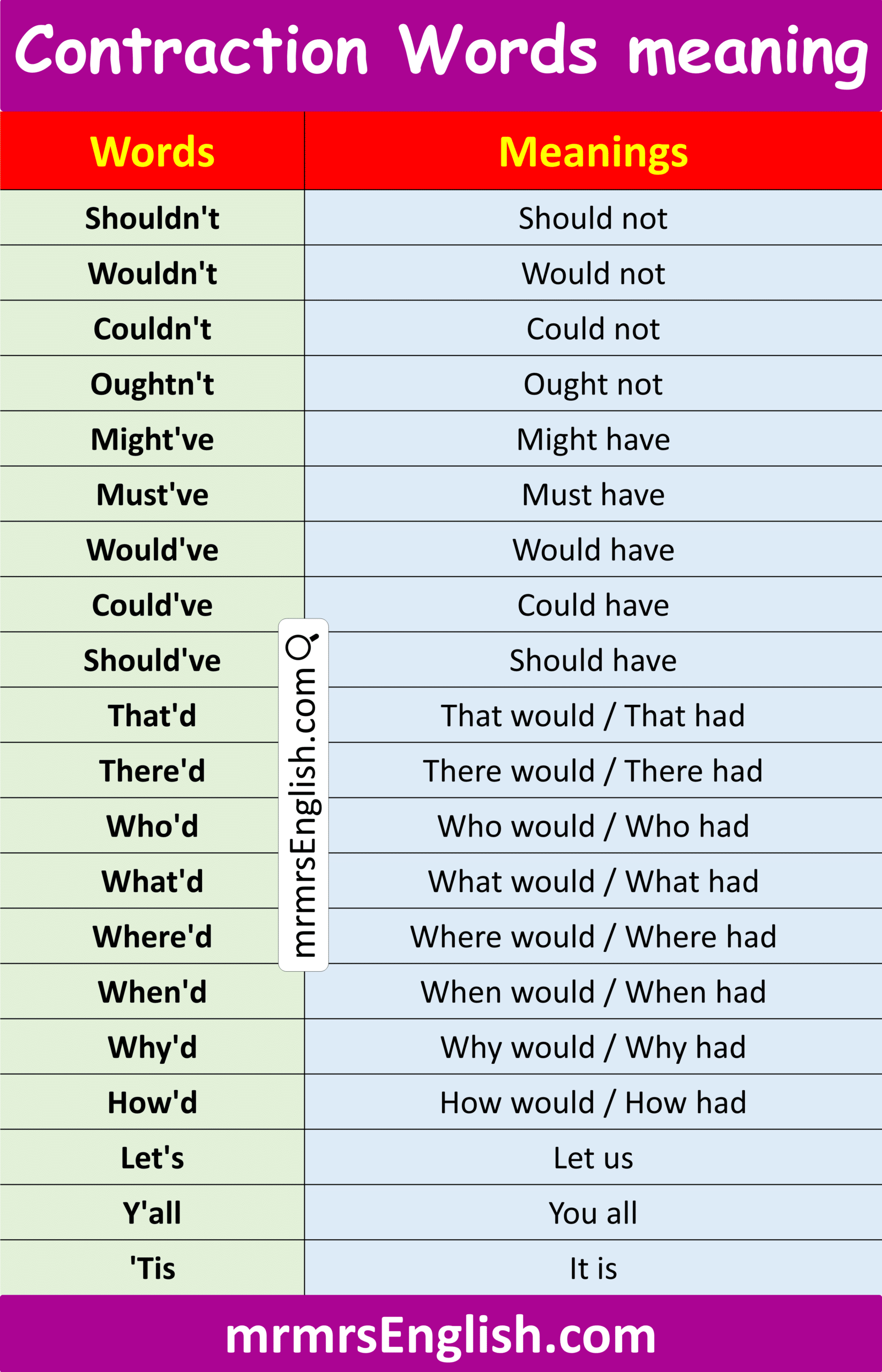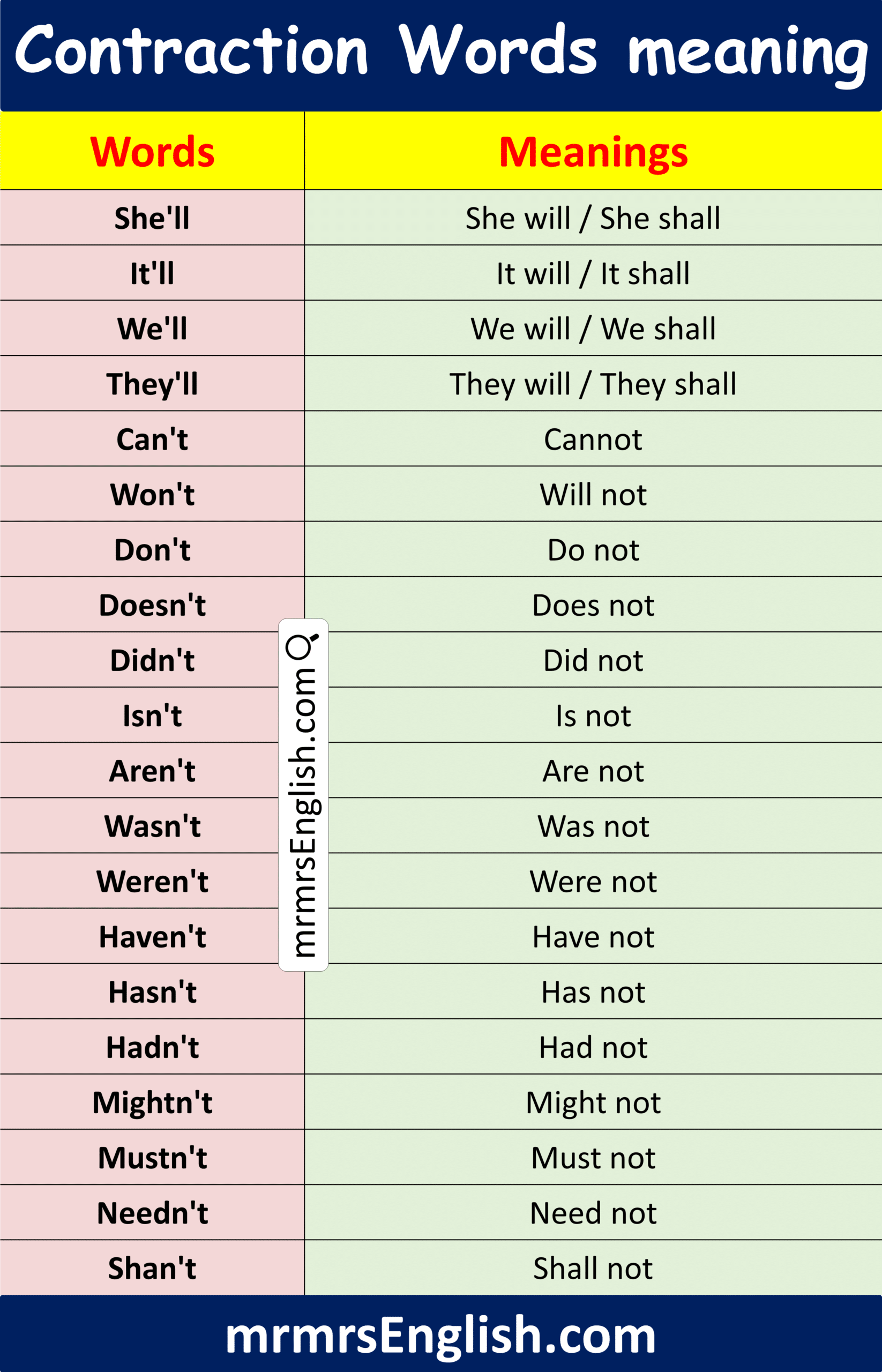 Contraction Words in English with their Meanings and Pictures