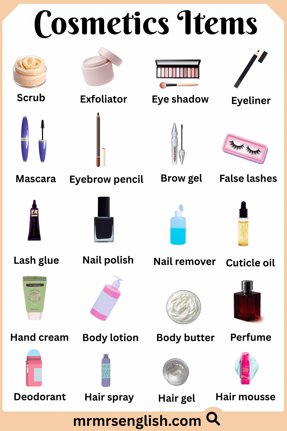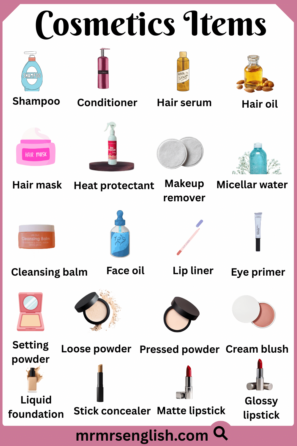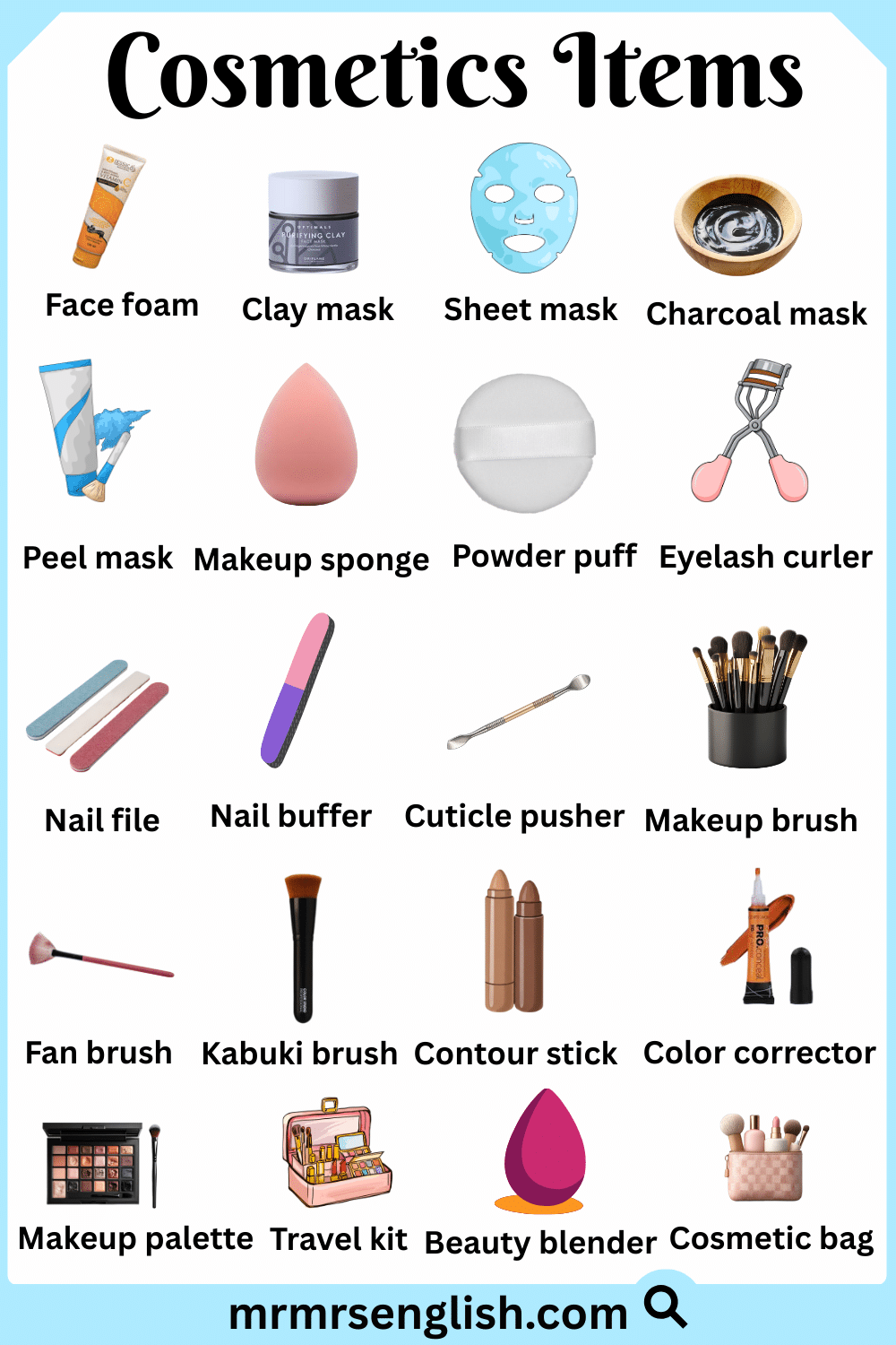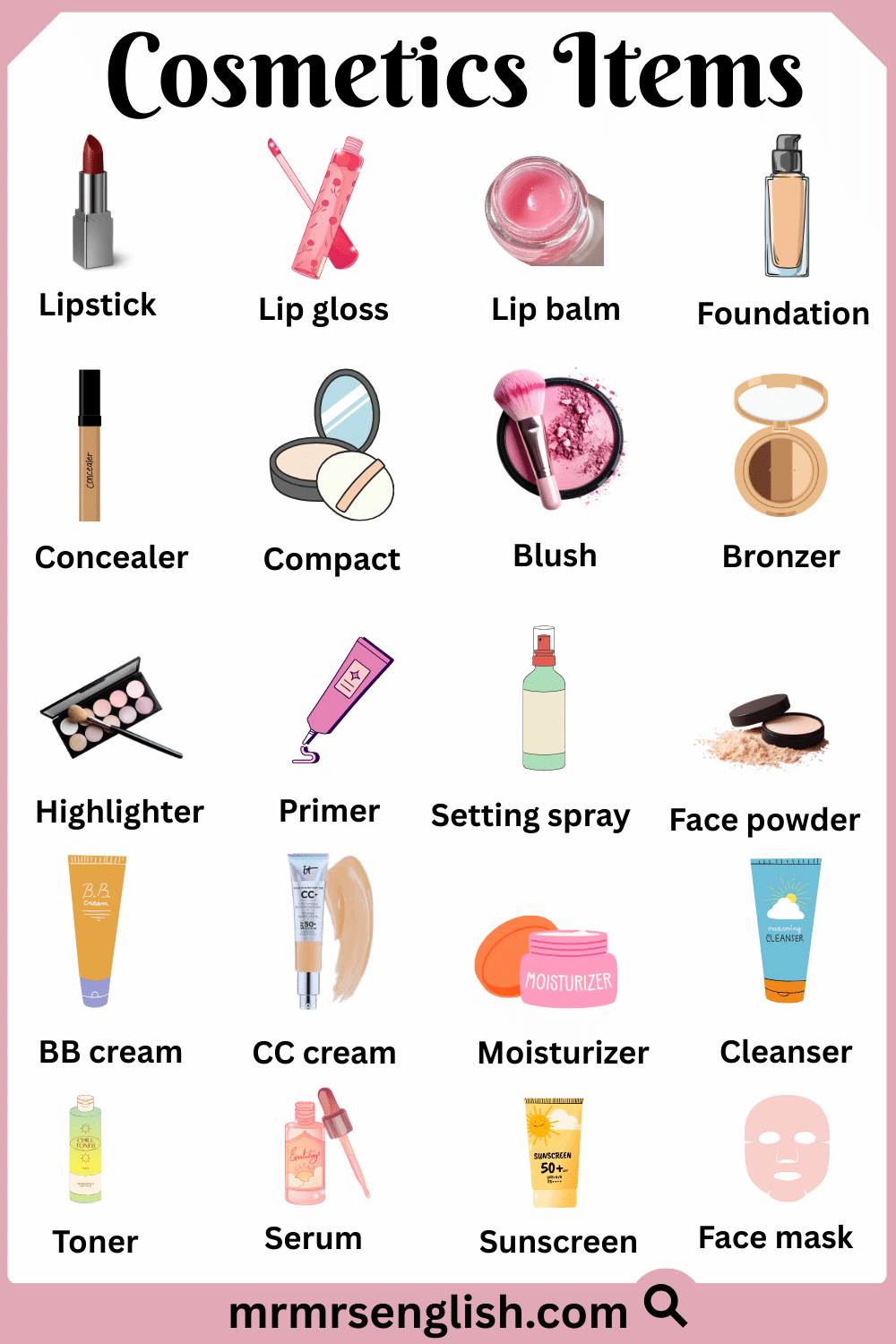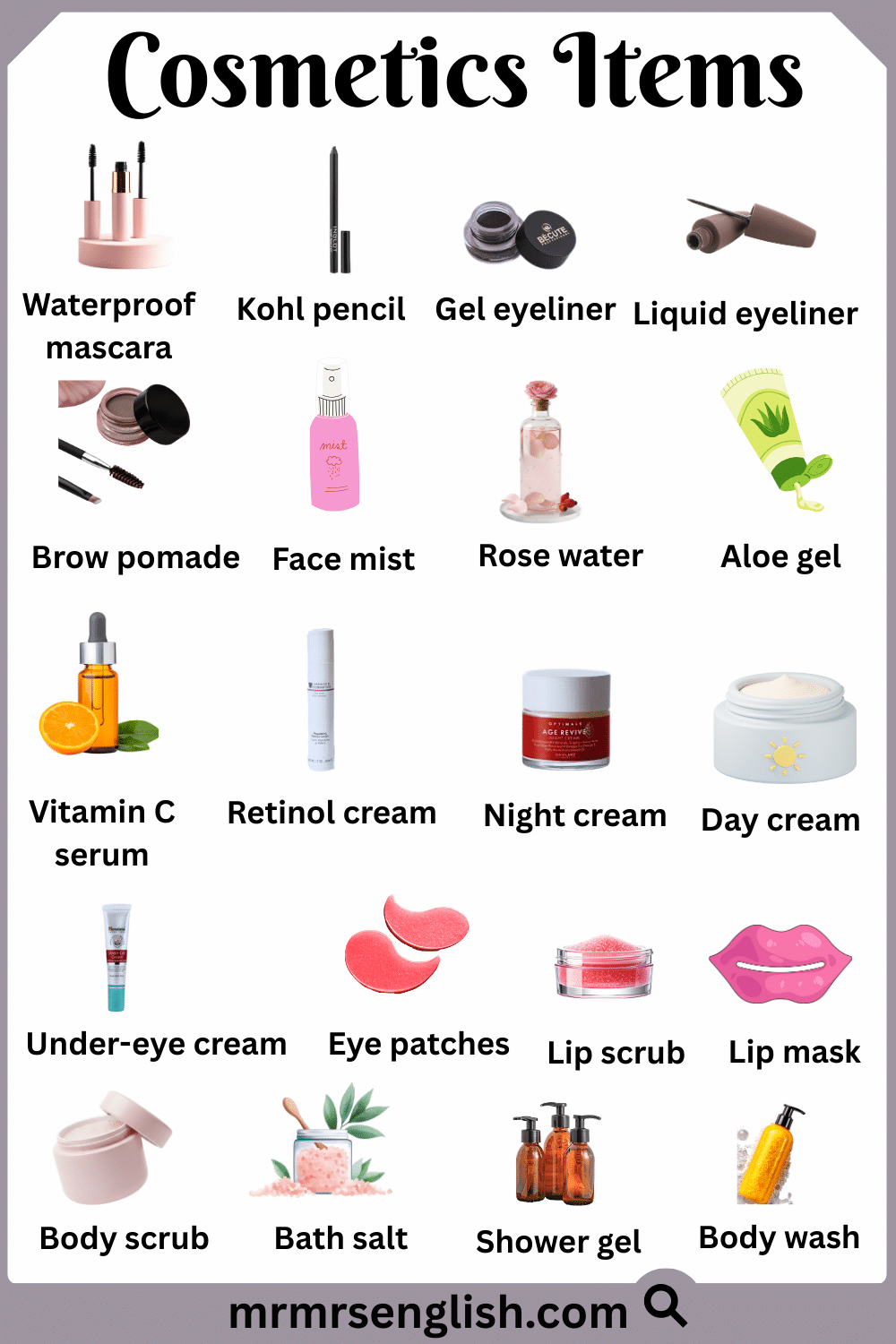 Cosmetics are products used for personal care, beauty, and grooming in daily life. They help people enhance their appearance, maintain skin health, and feel more confident. Learning the names of cosmetic items in English is useful for students, beginners, and anyone interested in beauty and self-care. In this article, you will learn common cosmetics items names in English along with clear pictures. These images make it easier to recognize each product and understand its use, helping readers build practical vocabulary in a simple and engaging way.