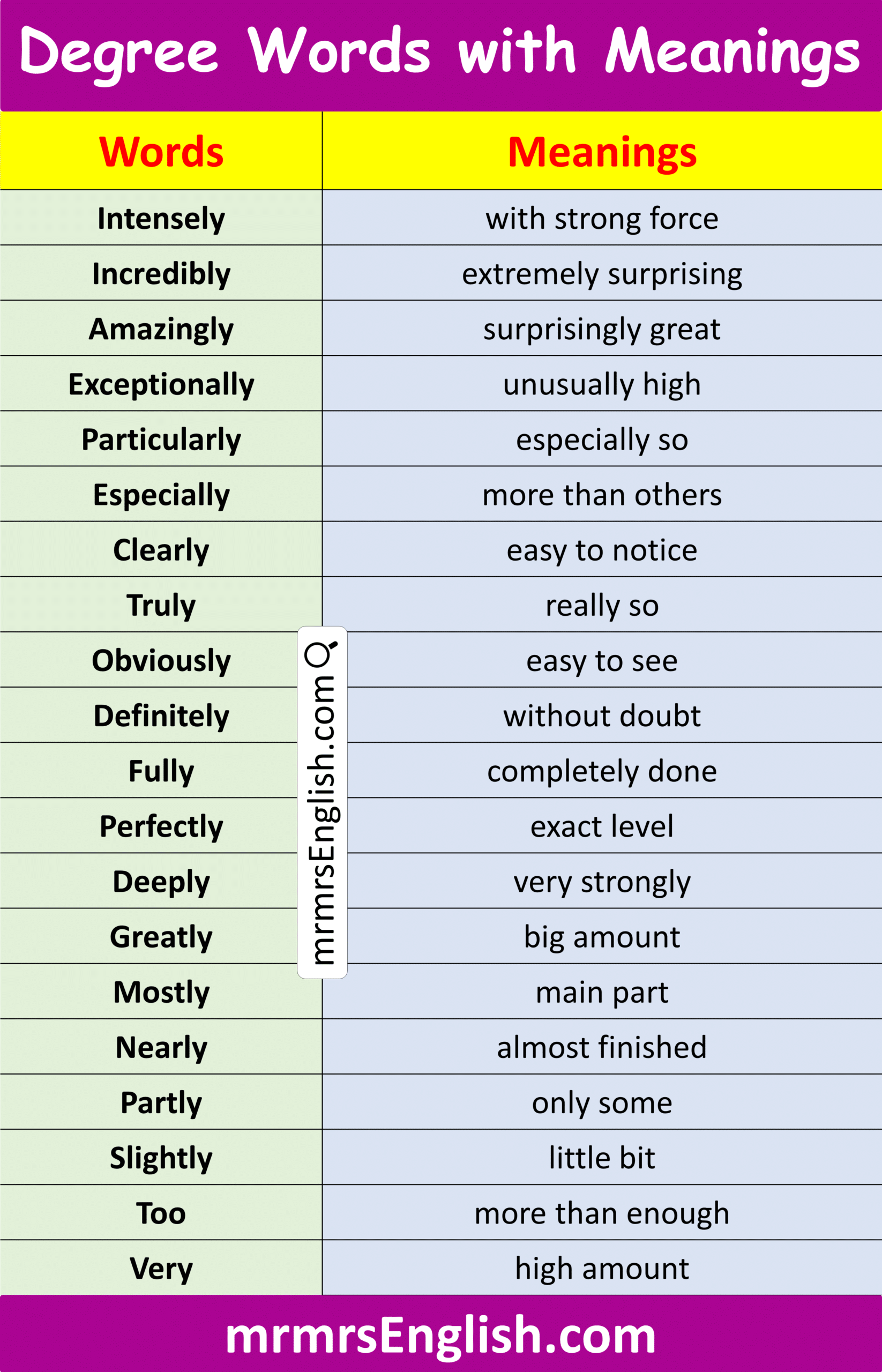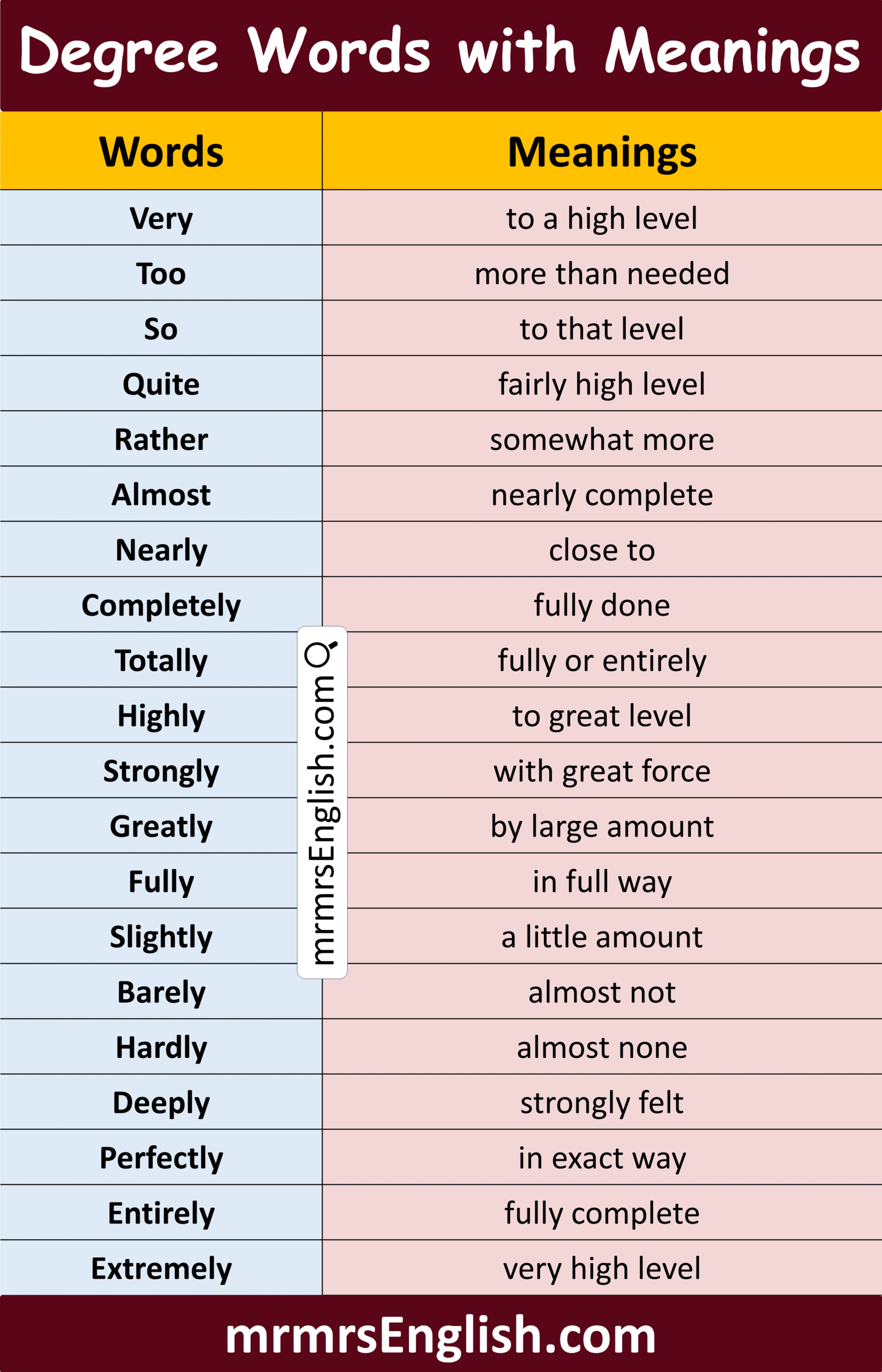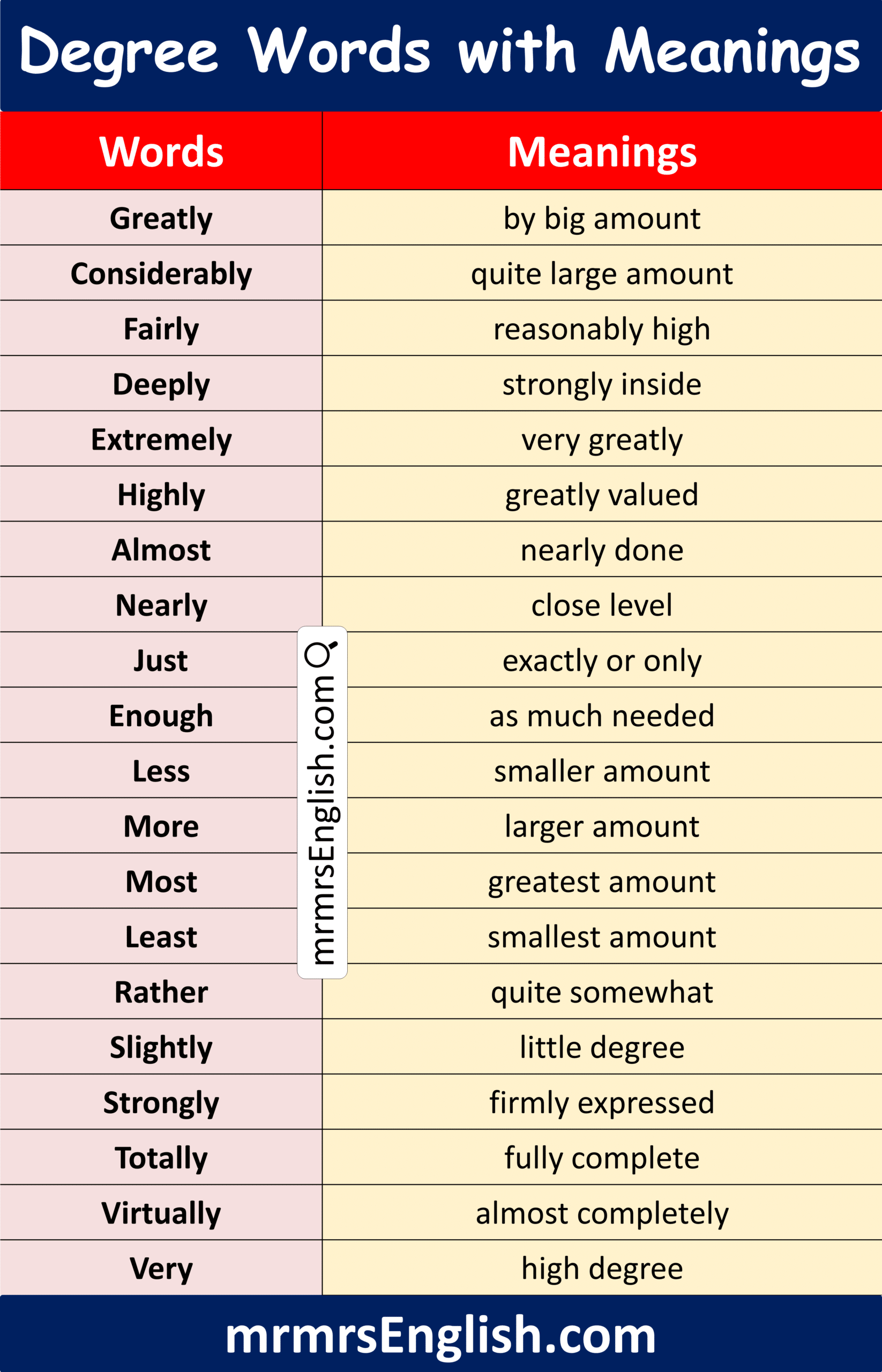 Degree words are special vocabulary words that show the level, strength, or intensity of an action, quality, or feeling. They help speakers and writers explain how much, how strong, or to what extent something happens. Learning these words is useful for everyday communication because they make your English sound more natural, precise, and expressive. In this article, you will learn common Degree Words in English with Meanings and their Pictures, which will help you understand how each word is used in real-life sentences and situations.