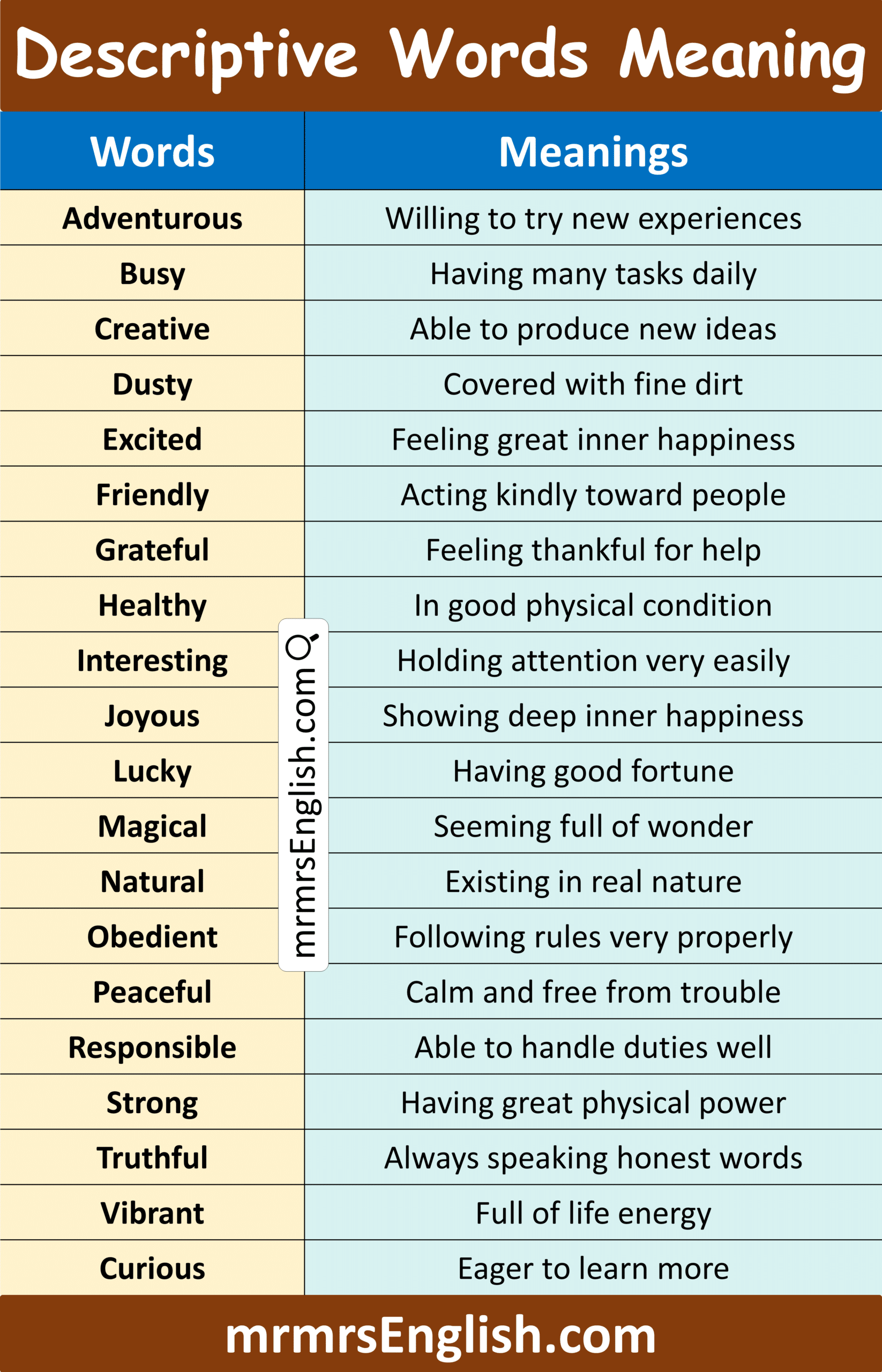Useful Descriptive Vocabulary Words with Meanings in English