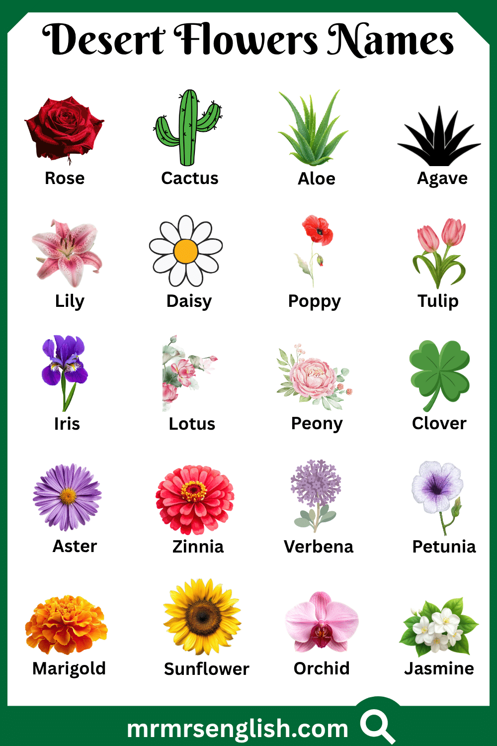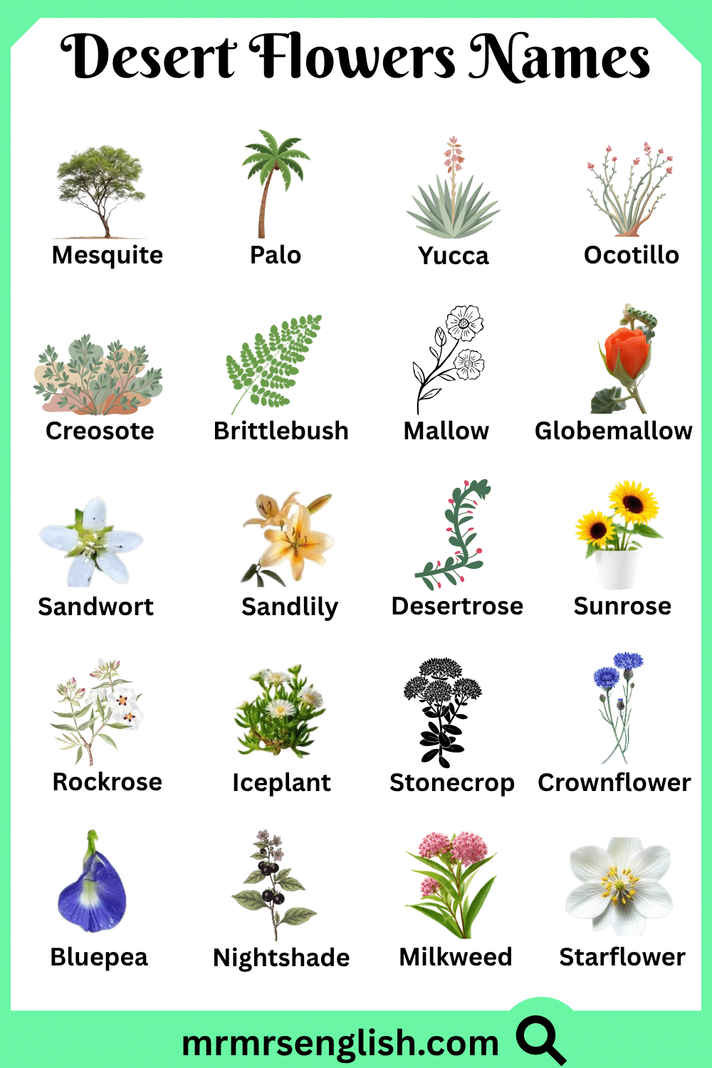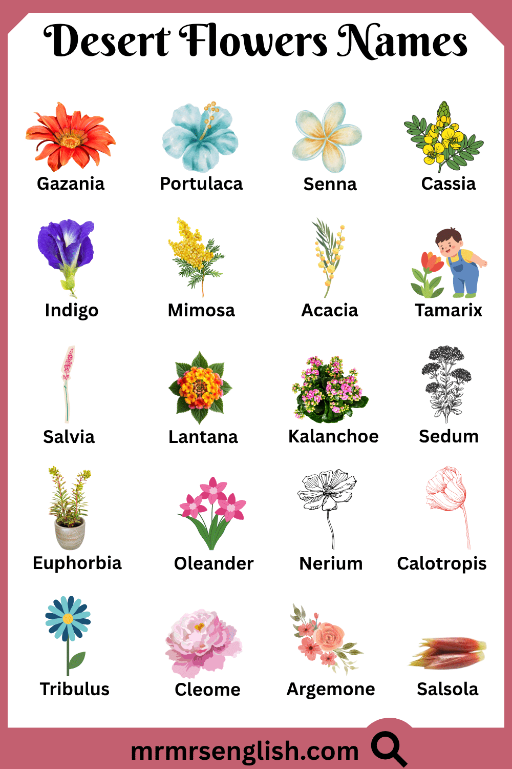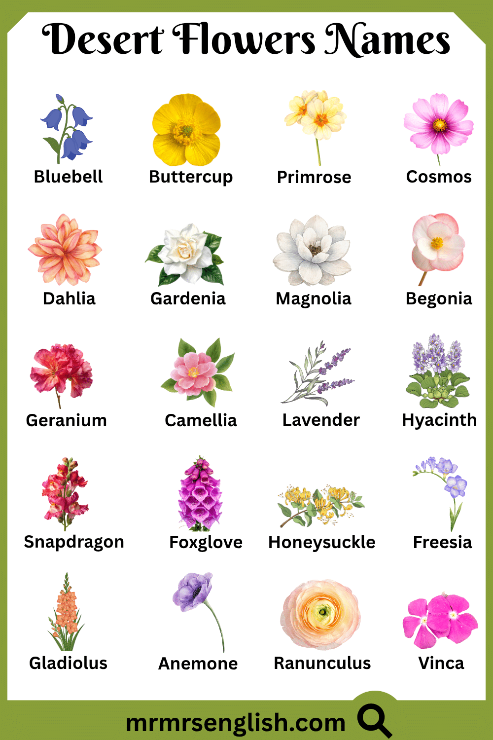 Desert flowers are special plants that grow in dry and hot desert environments where water is very limited. Even in such tough conditions, these flowers bloom with bright colors and unique shapes, showing how plants can adapt to harsh climates. Learning desert flower names in English helps students and nature lovers understand the beauty and diversity of plants that grow in deserts. In this article, you will learn different desert flowers with their names and pictures, making it easier to recognize these amazing plants and learn how they survive in extreme environments.