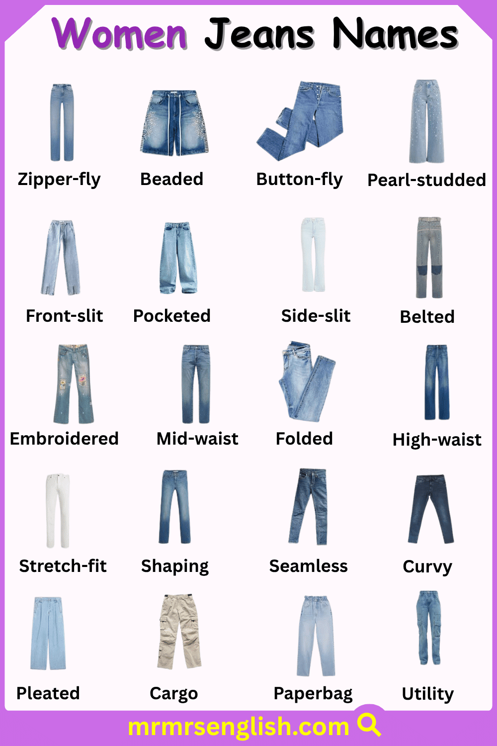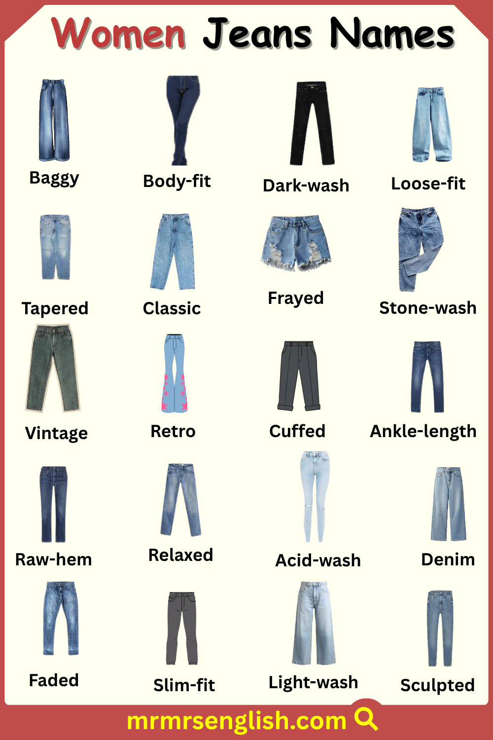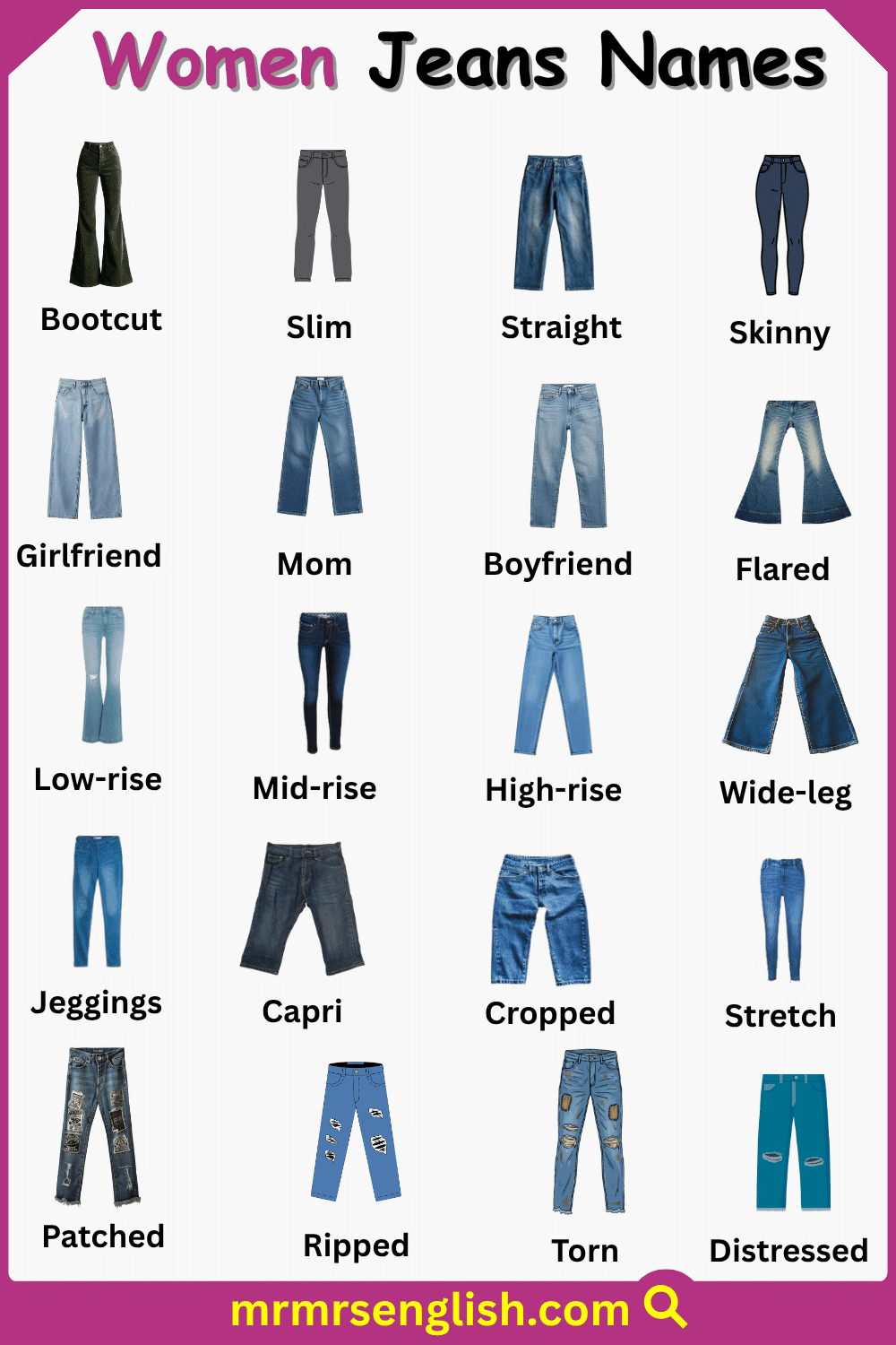 Jeans are a timeless fashion choice for women and can be styled for casual outings, office wear, travel, or everyday comfort. Each type of jeans has its own unique fit and look, some offer a relaxed style, while others give a more sleek and modern appearance. Knowing the different types of jeans names for women in English helps you choose the right style based on your body shape and fashion preference. In this article, you will learn a complete list of jeans types for women with their names and pictures so you can easily recognize them and select the perfect pair for any occasion. This guide is ideal for students, fashion lovers, and anyone exploring comfortable and stylish clothing options.