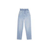 High-waisted jeans with a gathered, tied waist that looks like a paper bag; stylish and feminine.