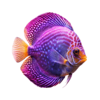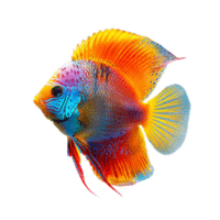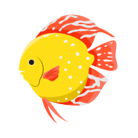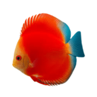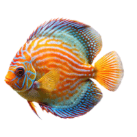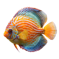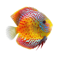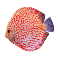 Discus resembling Koi fish patterns, gentle, colorful, thrives in warm, soft, slightly acidic water conditions.