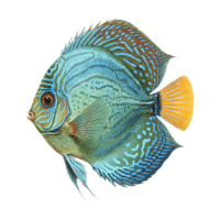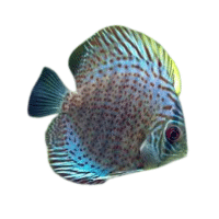 Turquoise and gold patterned discus, peaceful, decorative, adapts well to planted and community tanks.