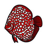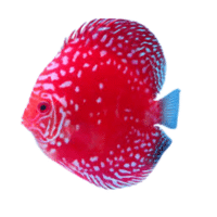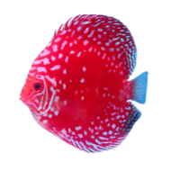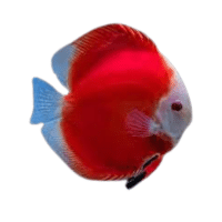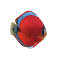 Bright red discus, calm, moderately active, popular among hobbyists, requires warm and soft water conditions.