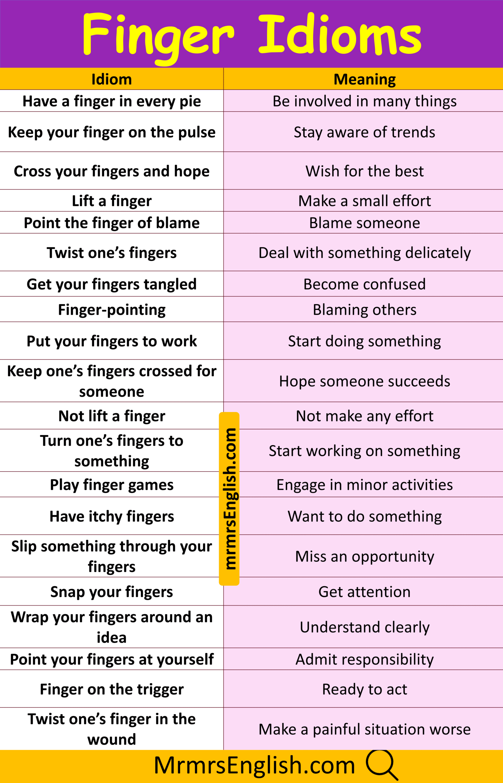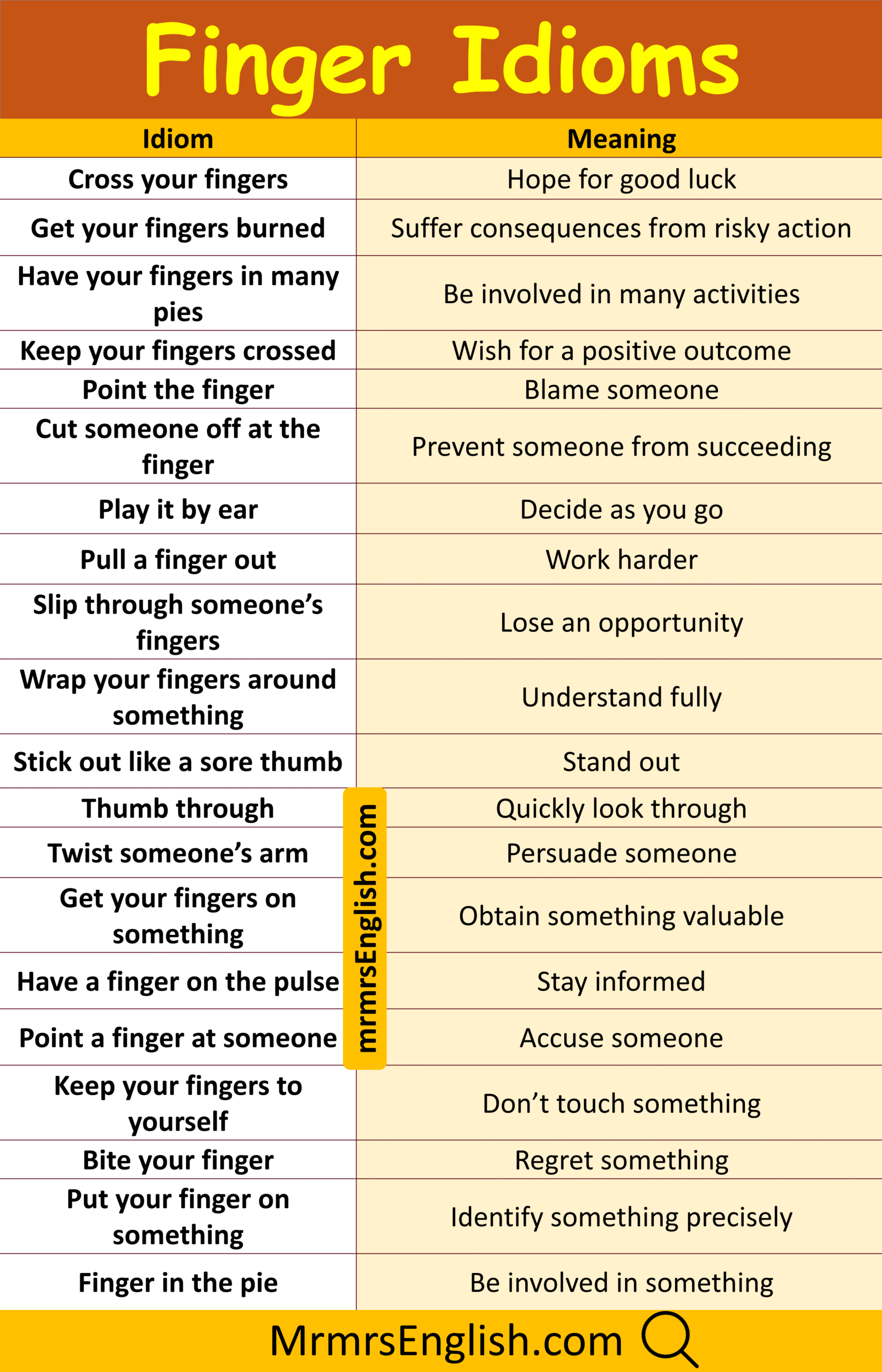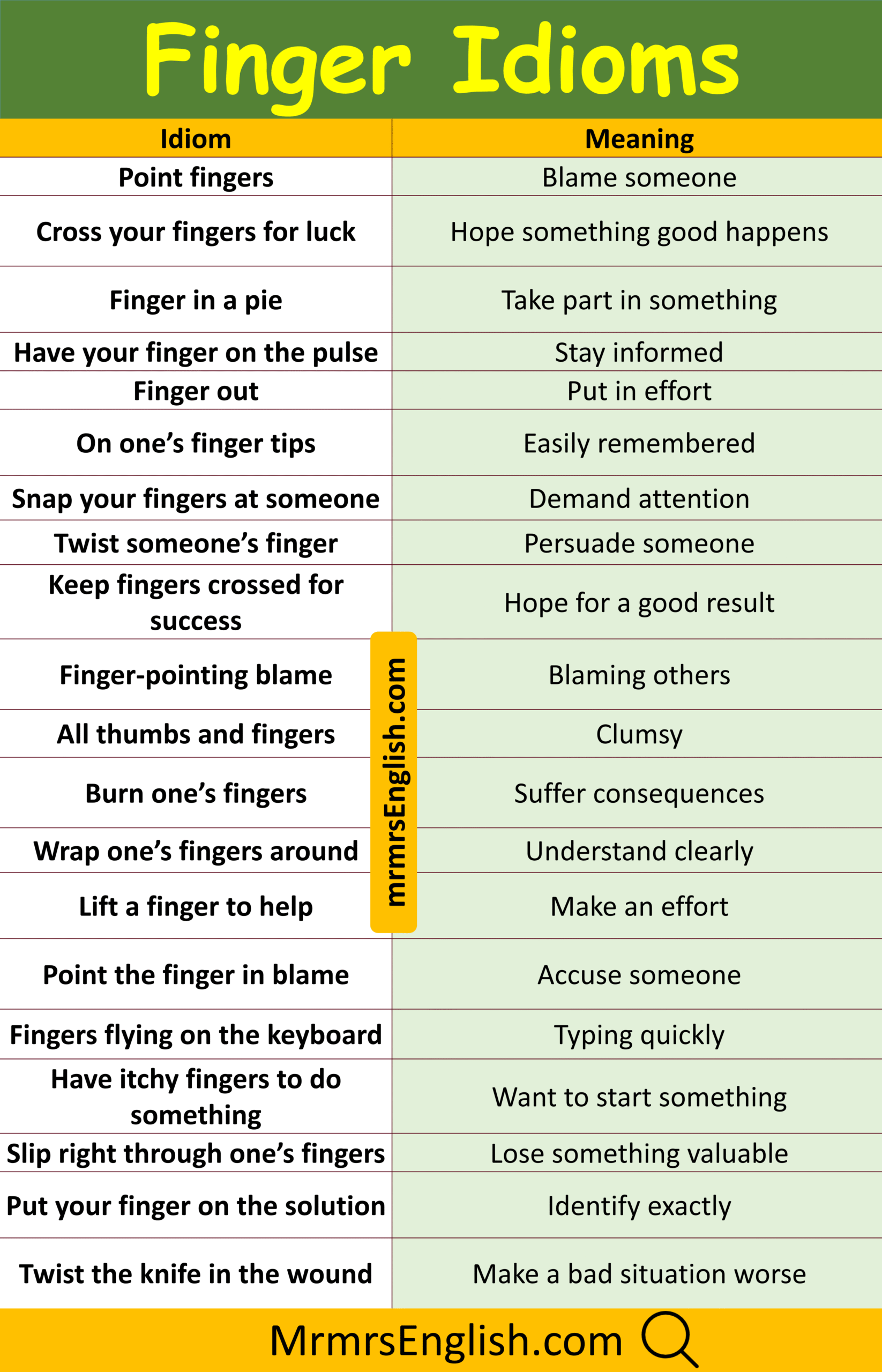 Popular Finger Idiom and Meanings with their Pictures