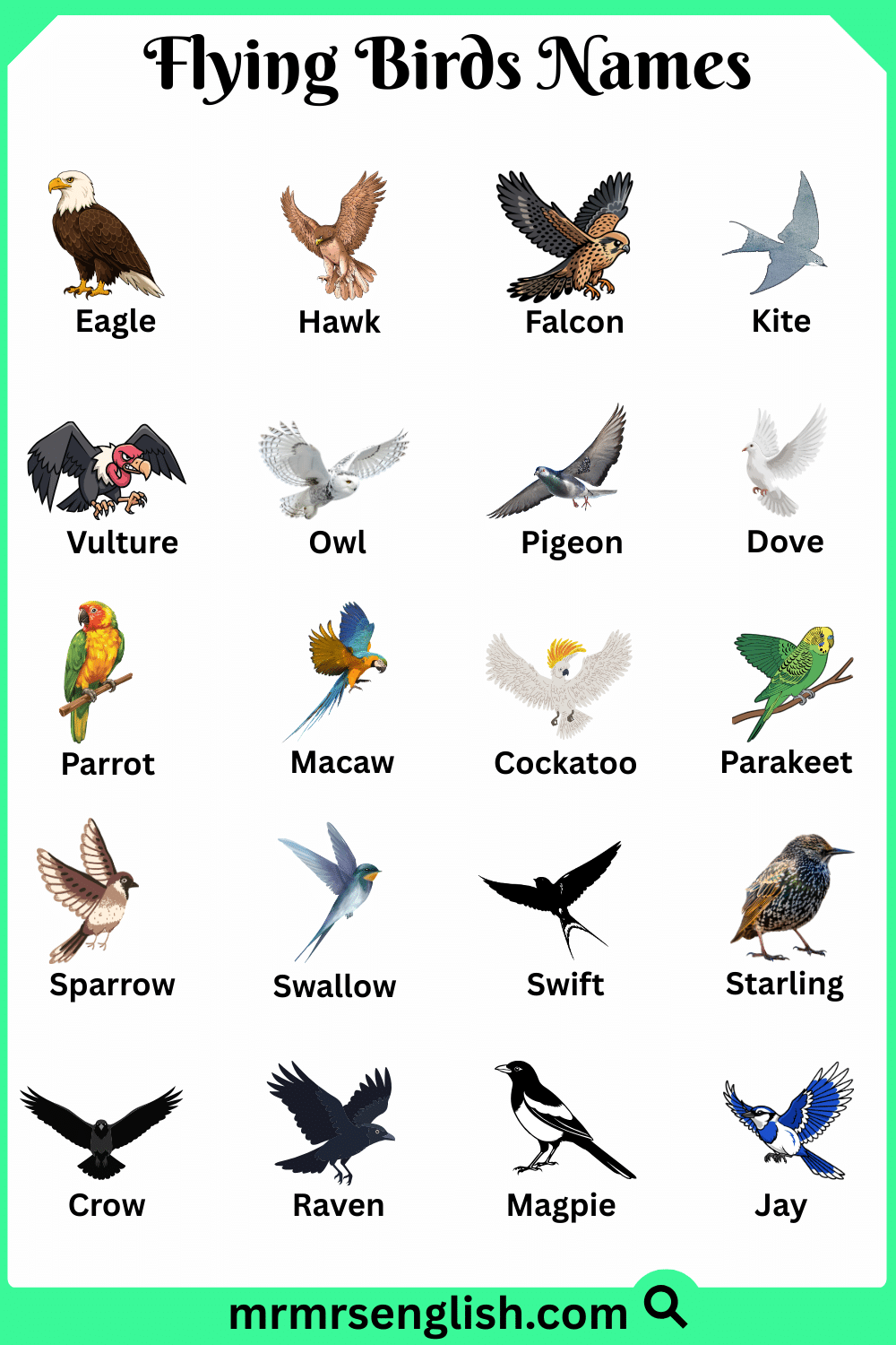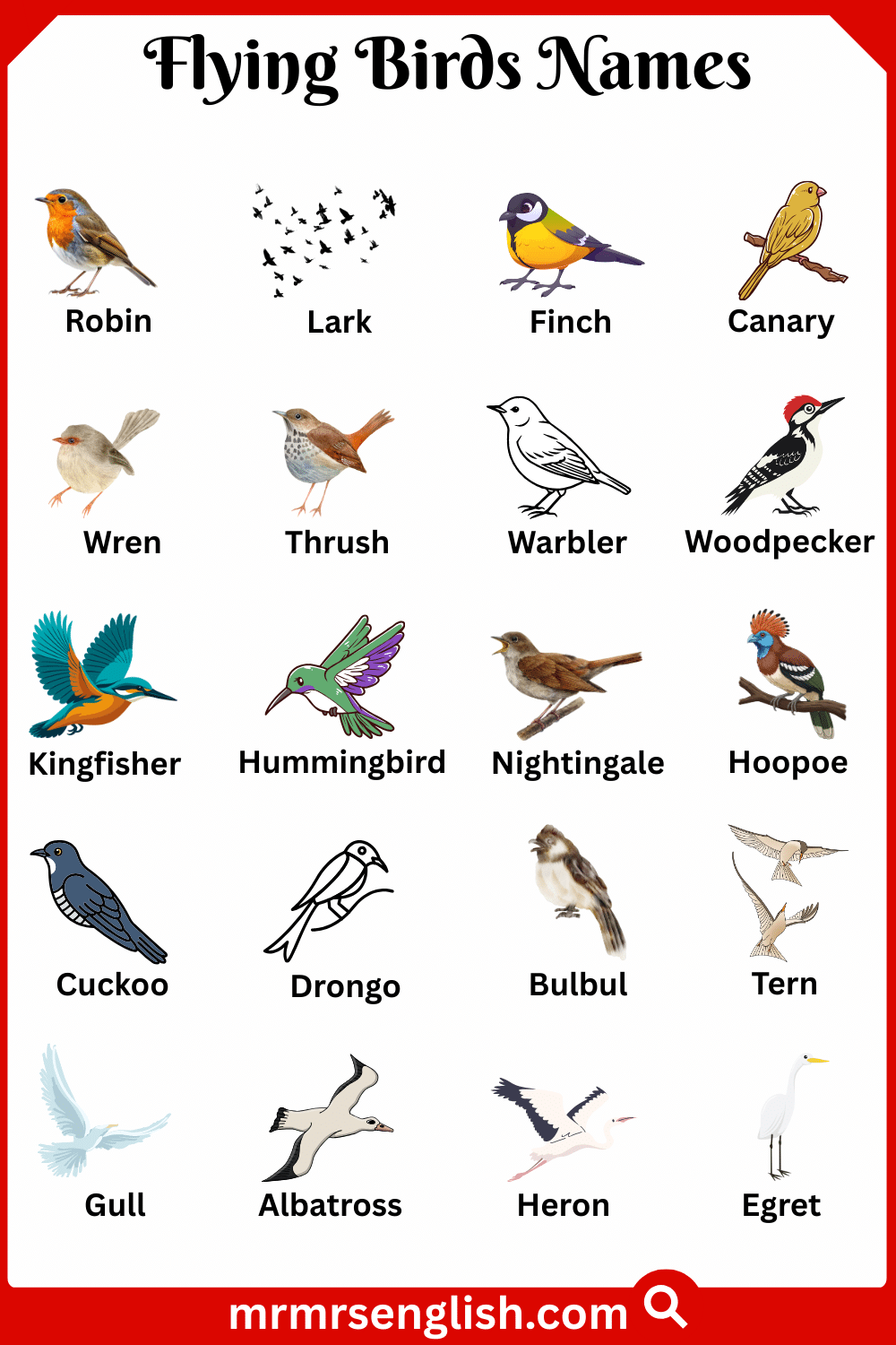 Flying birds are birds that have strong wings and light bodies that allow them to fly high in the sky. They can travel long distances, search for food, and build nests in trees, mountains, or near water. Different flying birds have different sizes, colors, and flying styles, from small birds that move quickly to large birds that glide smoothly in the air. In this article, you will learn Flying Birds Names in English with Their Pictures to help you easily recognize them. This guide will help improve vocabulary and give simple knowledge about these beautiful and active birds in easy and clear language.