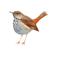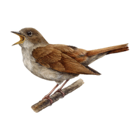 A small brown bird famous for its powerful and beautiful song, flying quietly through forests and gardens.