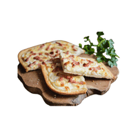 A thin crust topped with cream, onions, and bacon, from Alsace.