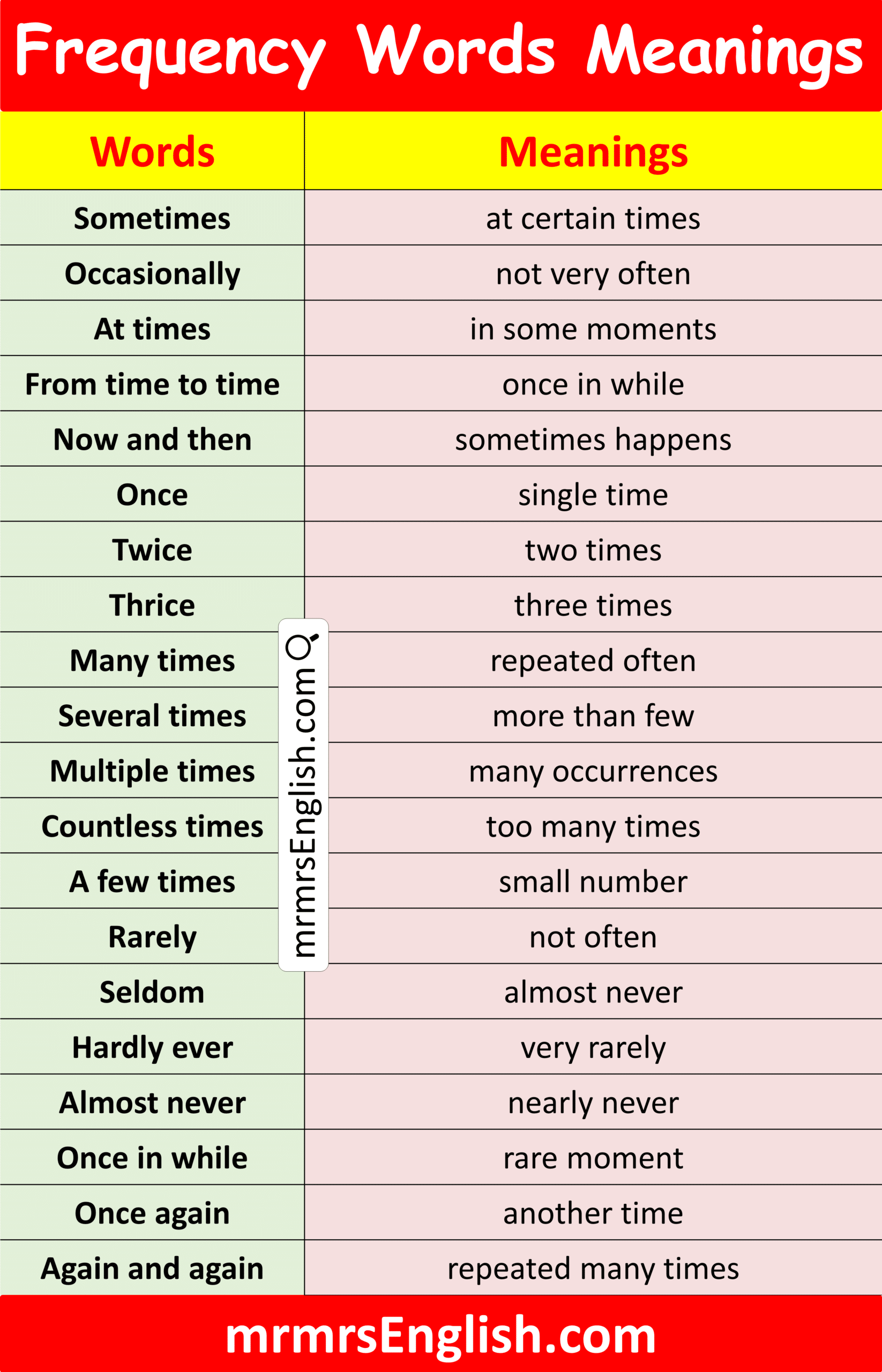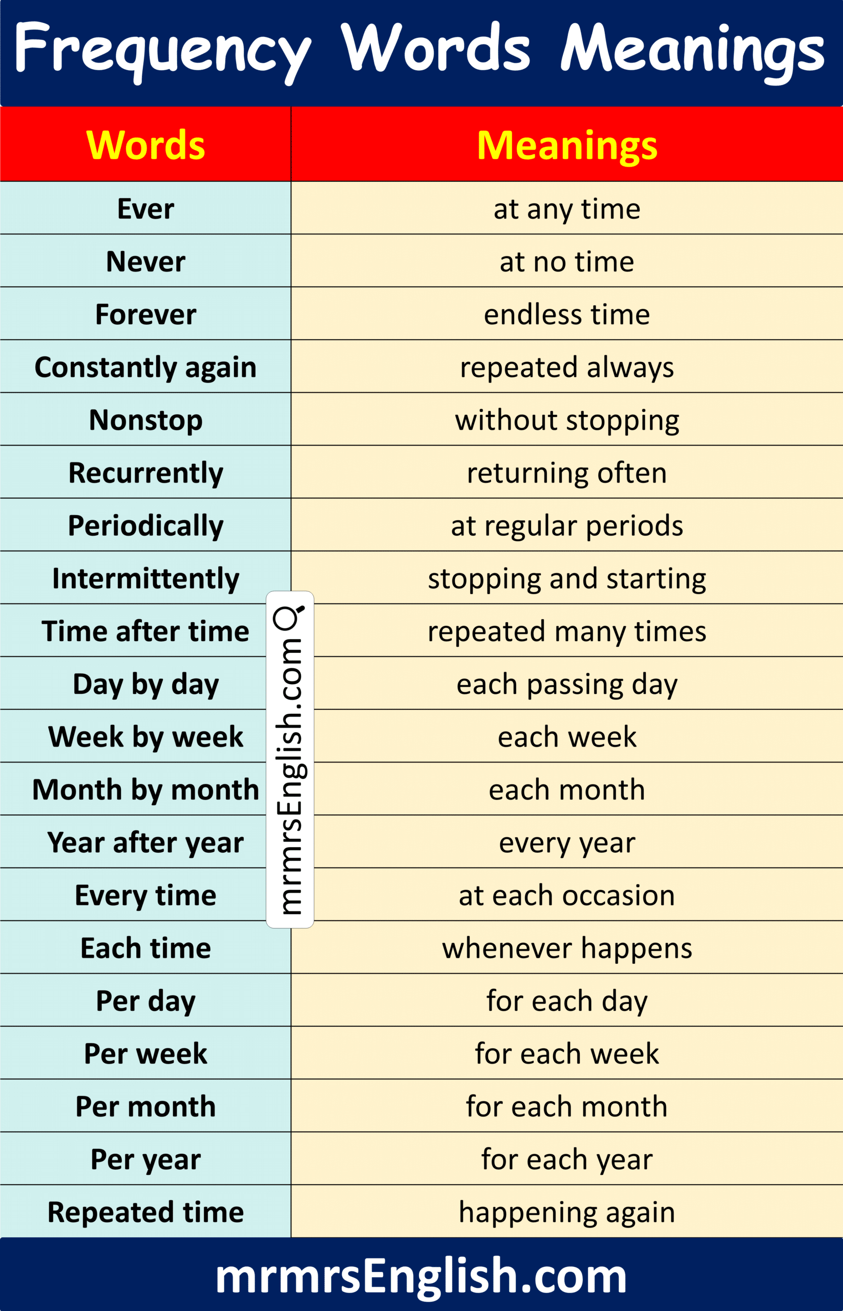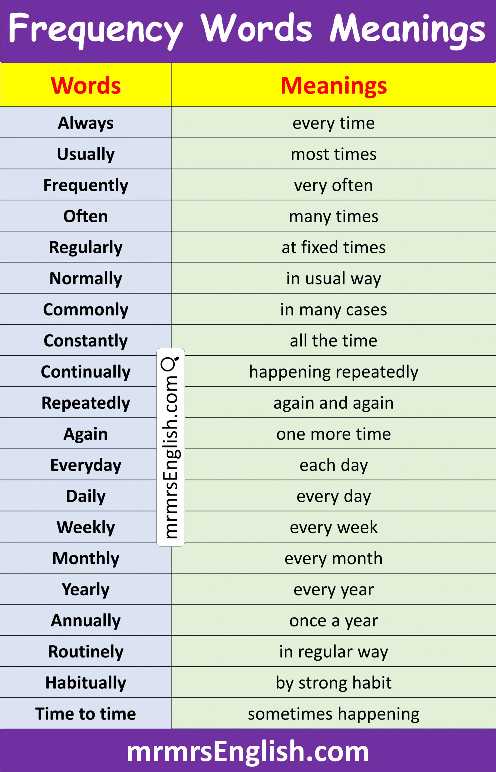 Frequency words are important vocabulary words that describe how often an action happens. These words make sentences clearer because they show the regularity of an action in daily life. In everyday communication, frequency words are commonly used when talking about habits, routines, and repeated activities. Words such as always, usually, often, sometimes, and never help express how frequently something takes place. In this article, you will learn Frequency Words Meanings in English with their Pictures, making it easier for learners to understand their usage and improve both speaking and writing skills in English.