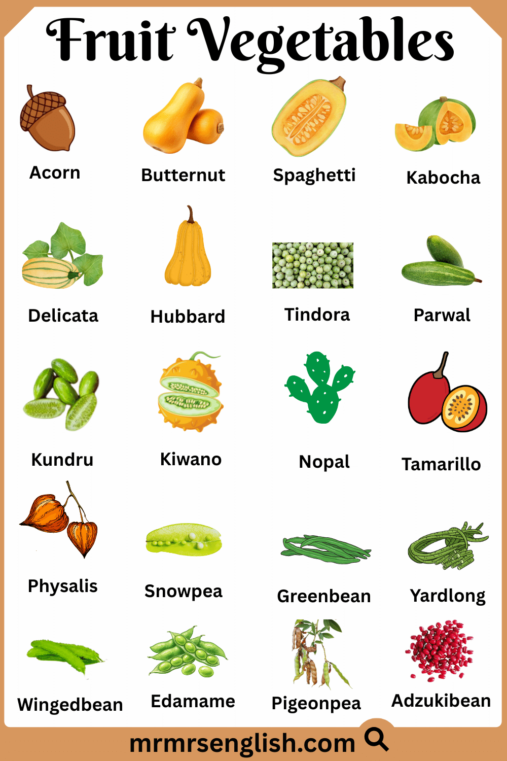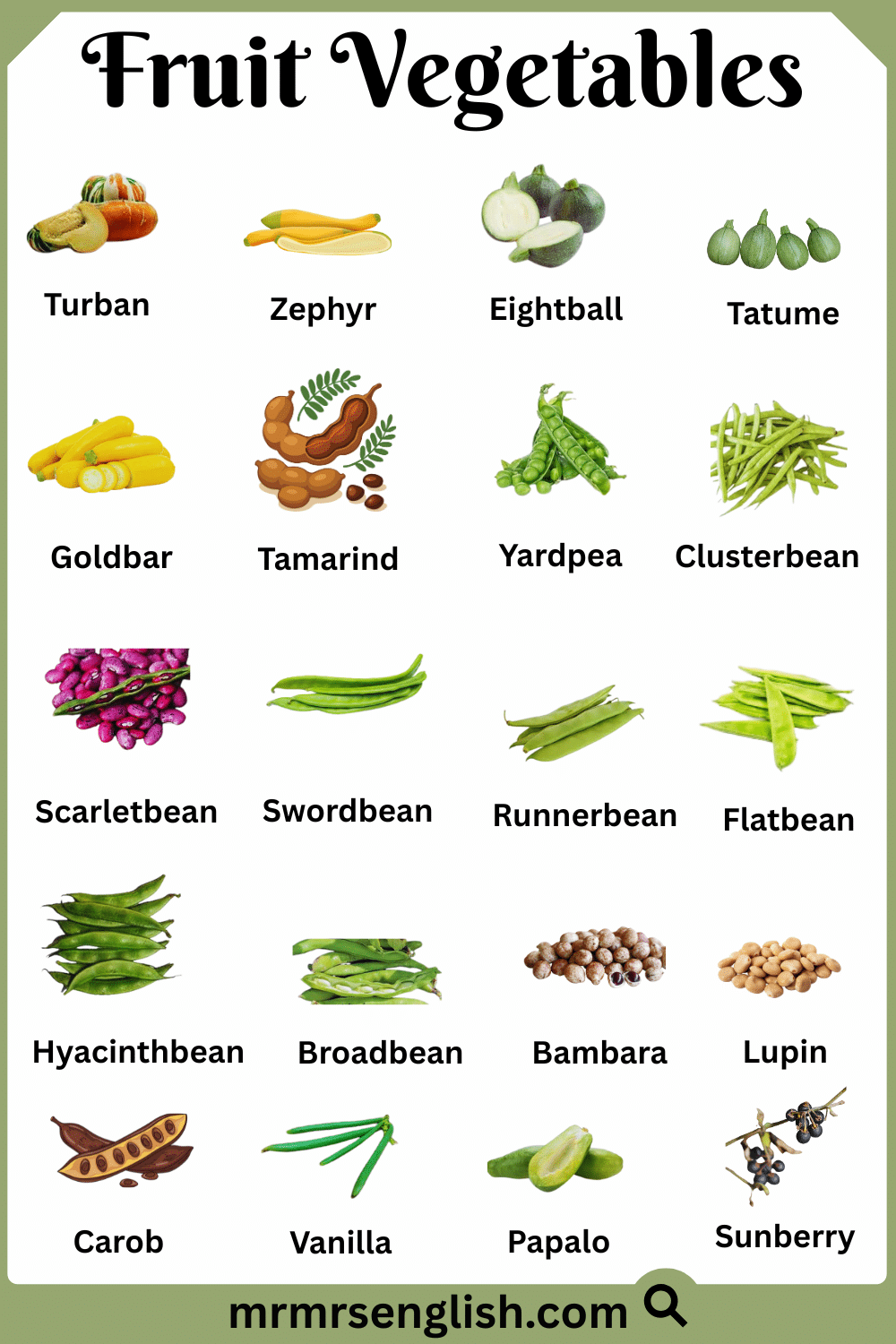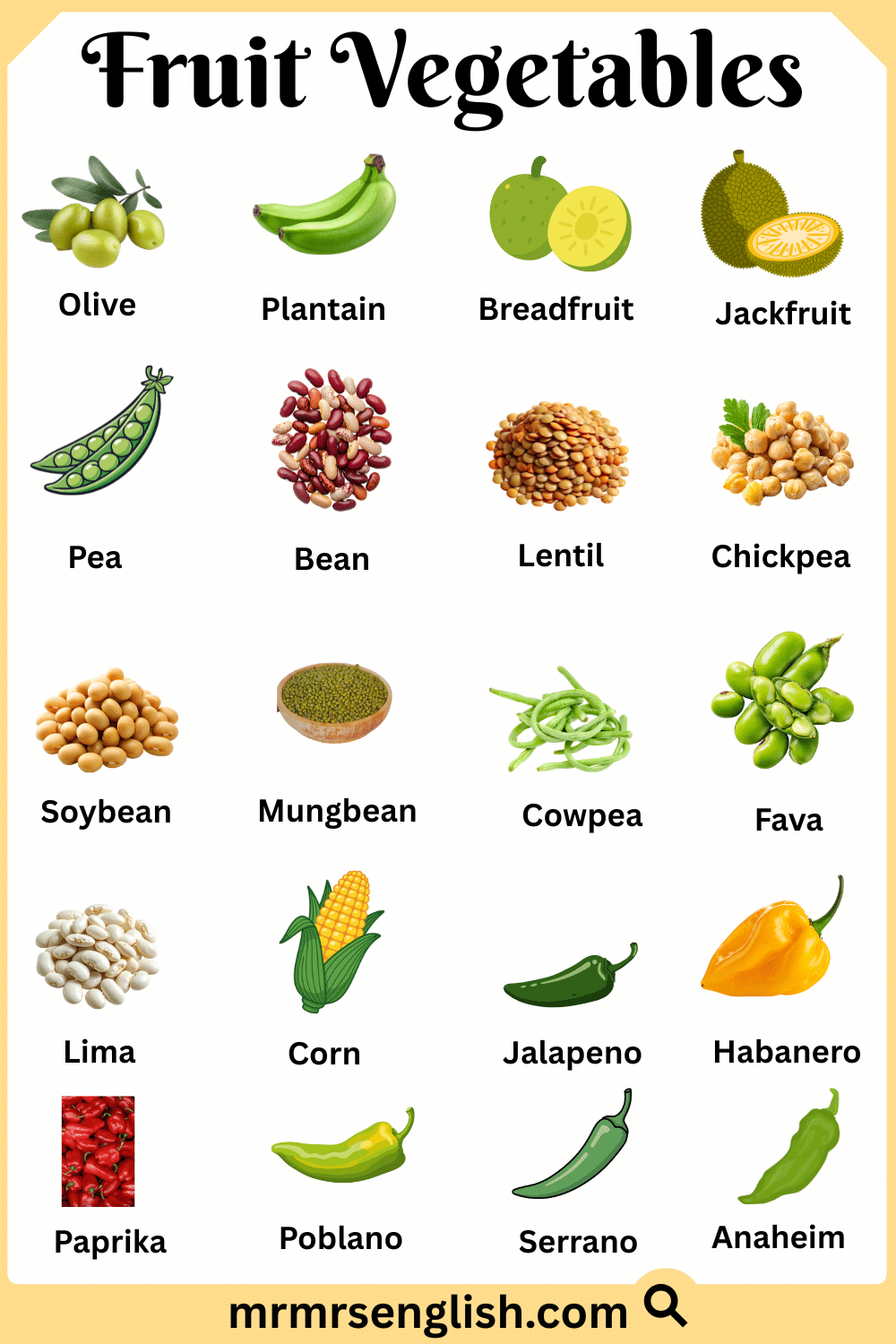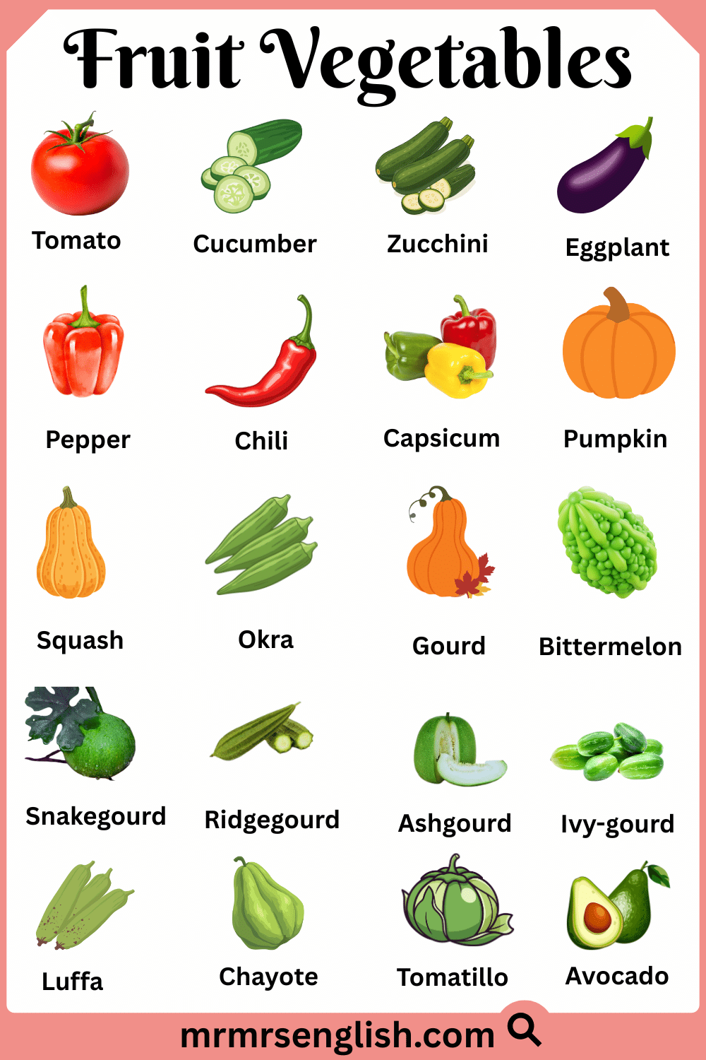 Fruit Vegetables Names in English with Their Pictures is a simple and useful topic for learners who want to improve their English vocabulary through everyday food items. Fruit vegetables are foods that grow from the flower of a plant and contain seeds, but are commonly used as vegetables in cooking. In this article, you will learn the English names of common fruit vegetables with clear pictures that make understanding easy and quick. The pictures help learners recognize each item easily, remember the words better, and use them correctly in daily life. This short guide is ideal for students, beginners, and ESL learners who want clear, practical, and easy learning.