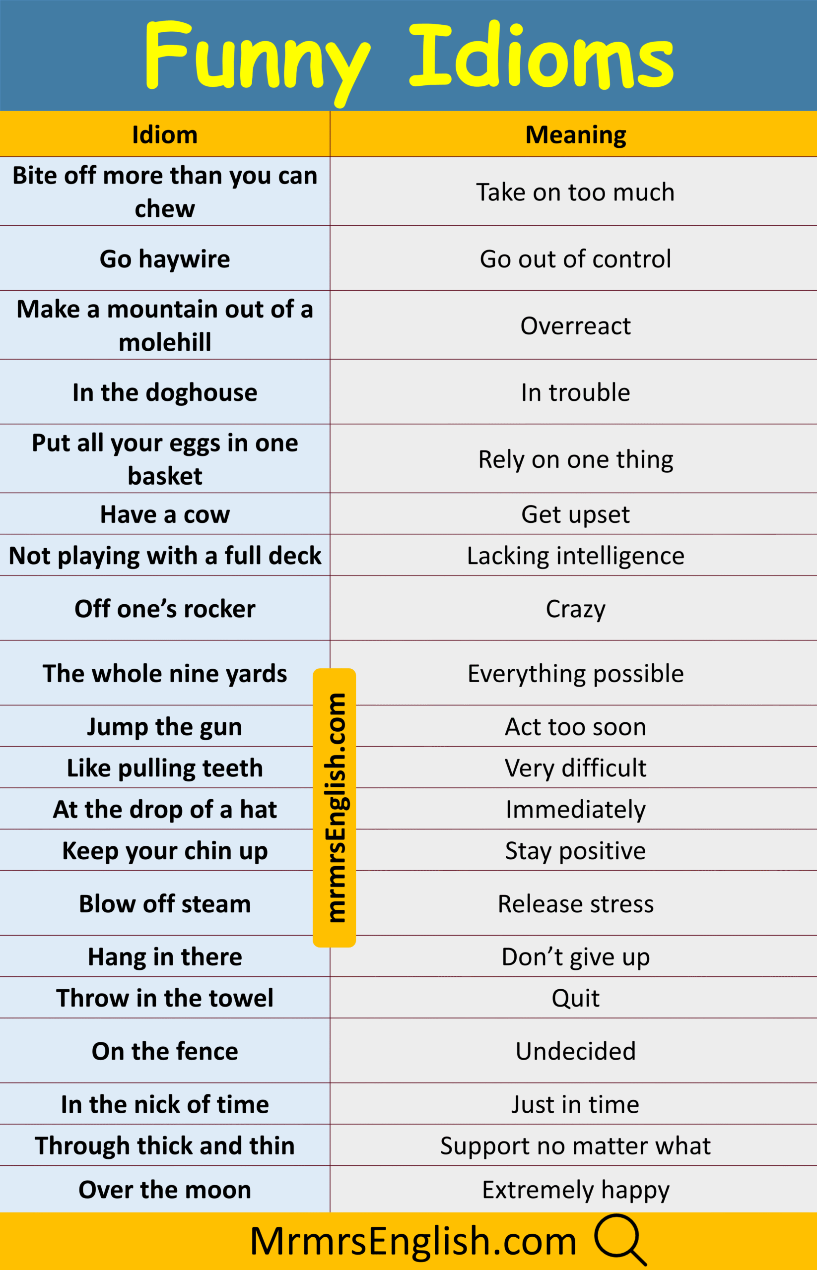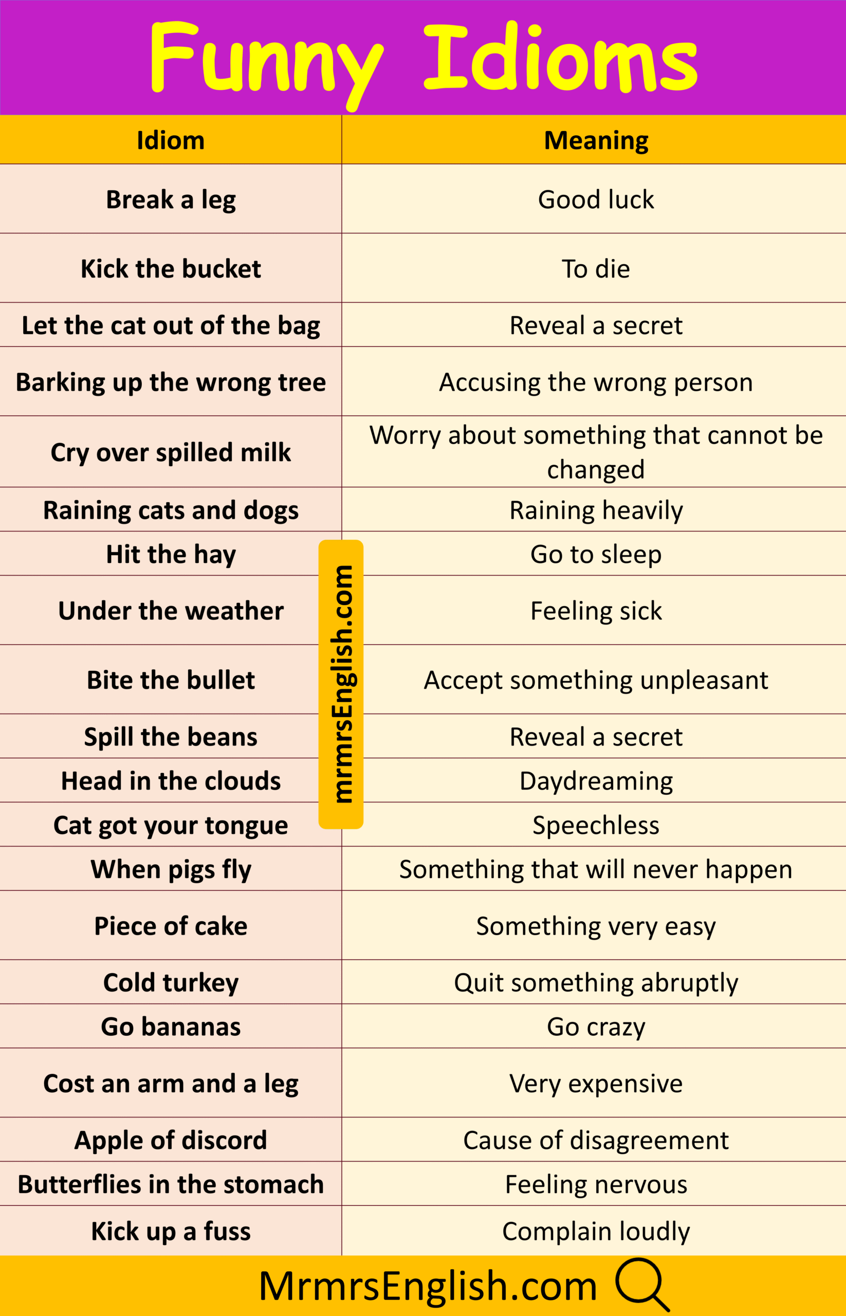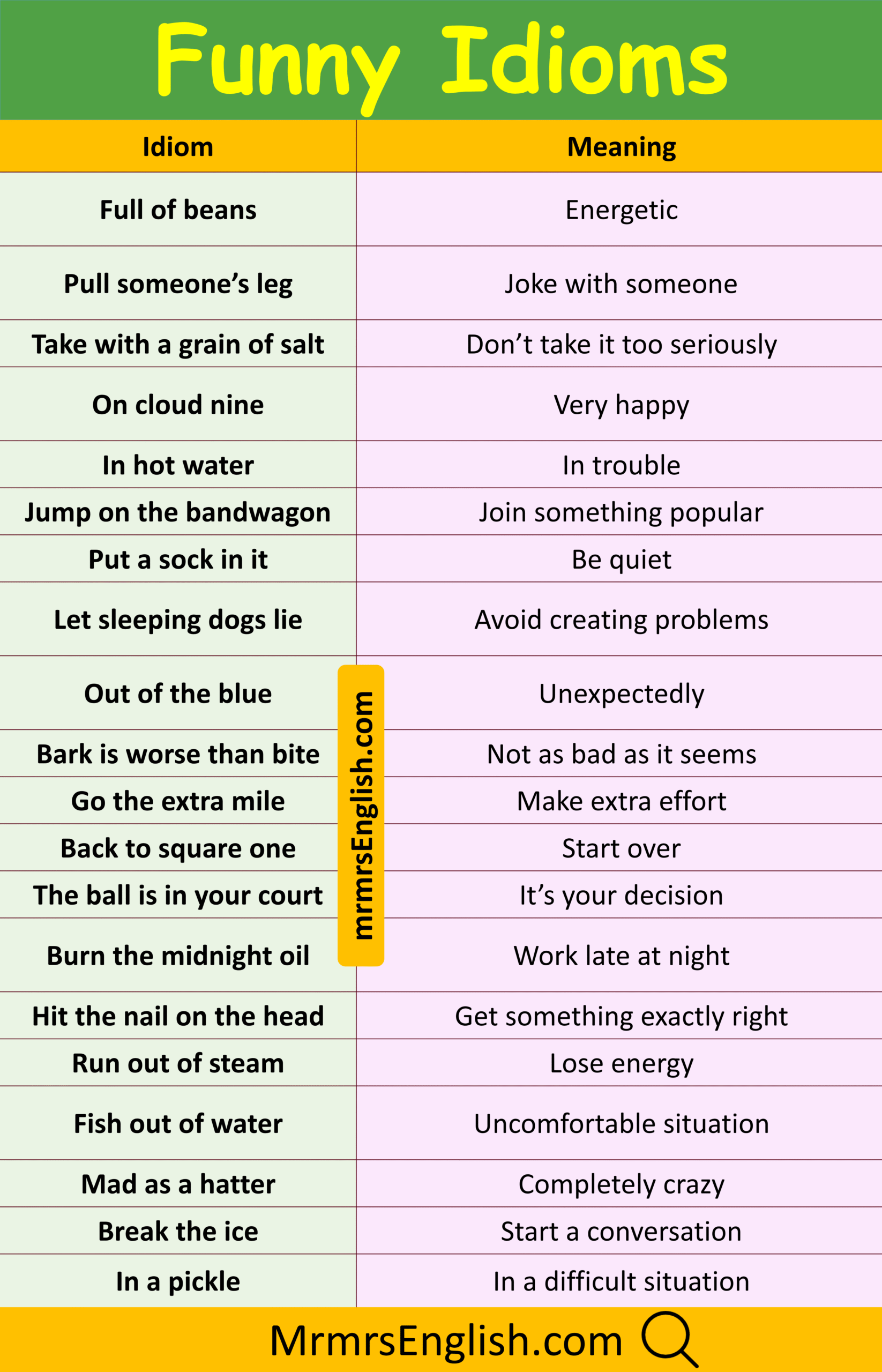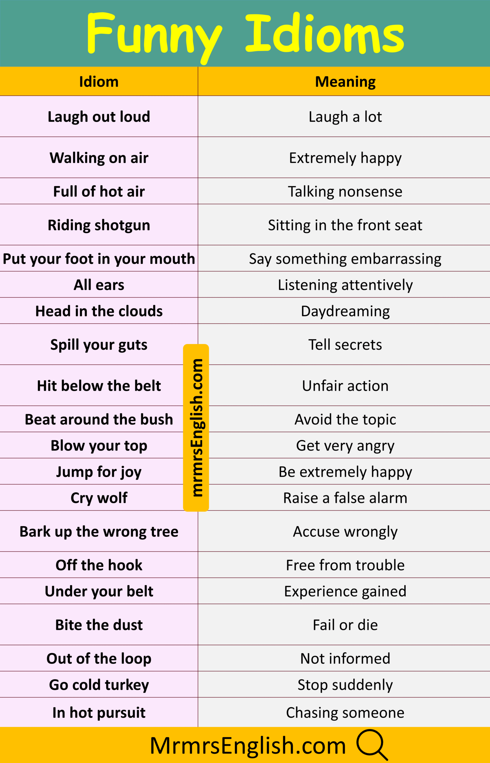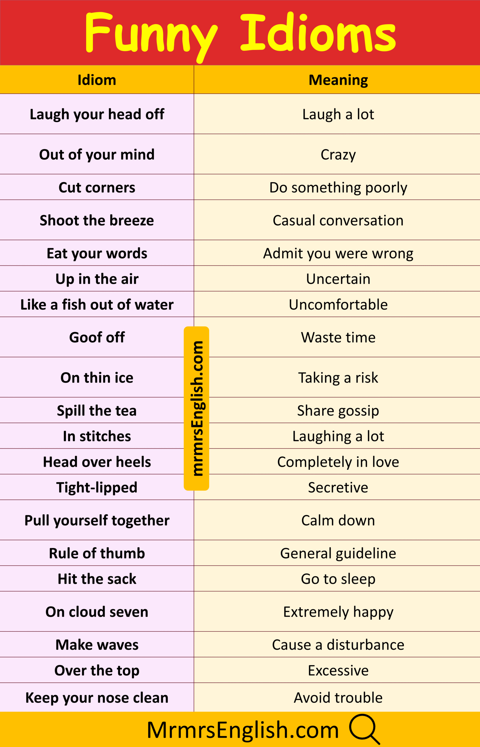Funny idioms make the English language more colorful, interesting, and enjoyable to learn. These expressions do not always mean exactly what the words say, but they are commonly used in daily conversations to add humor and strong meaning. Understanding funny idioms helps students and learners sound more natural and confident while speaking English. In this article, you will learn funny idioms in English with their clear meanings and helpful pictures, making each expression easy to understand and remember. This simple guide is perfect for beginners and anyone who wants to improve English in a fun way.