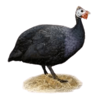 Black Guinea Fowl features solid dark plumage with minimal spotting, creating a sleek, bold, and striking presence in free-range environments.