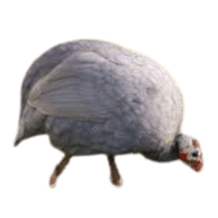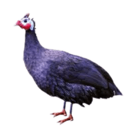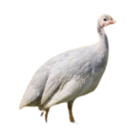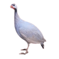White Guinea Fowl has pure white feathers without visible spots, giving it a clean, bright, and striking appearance in flocks and free-range environments.