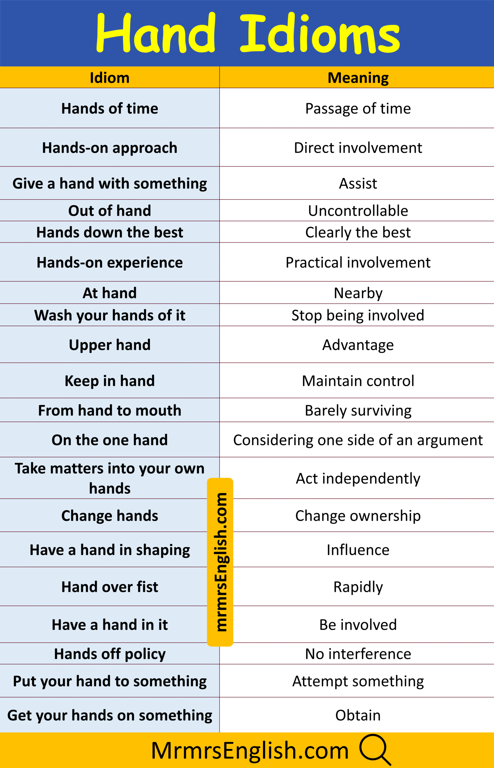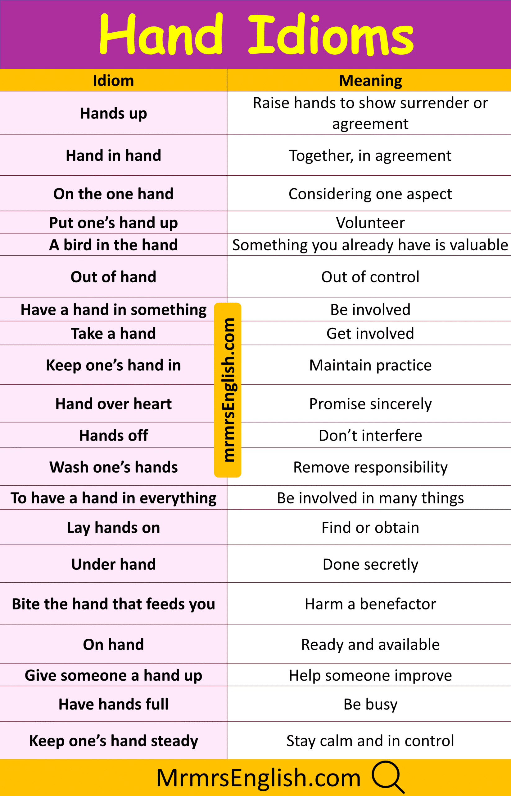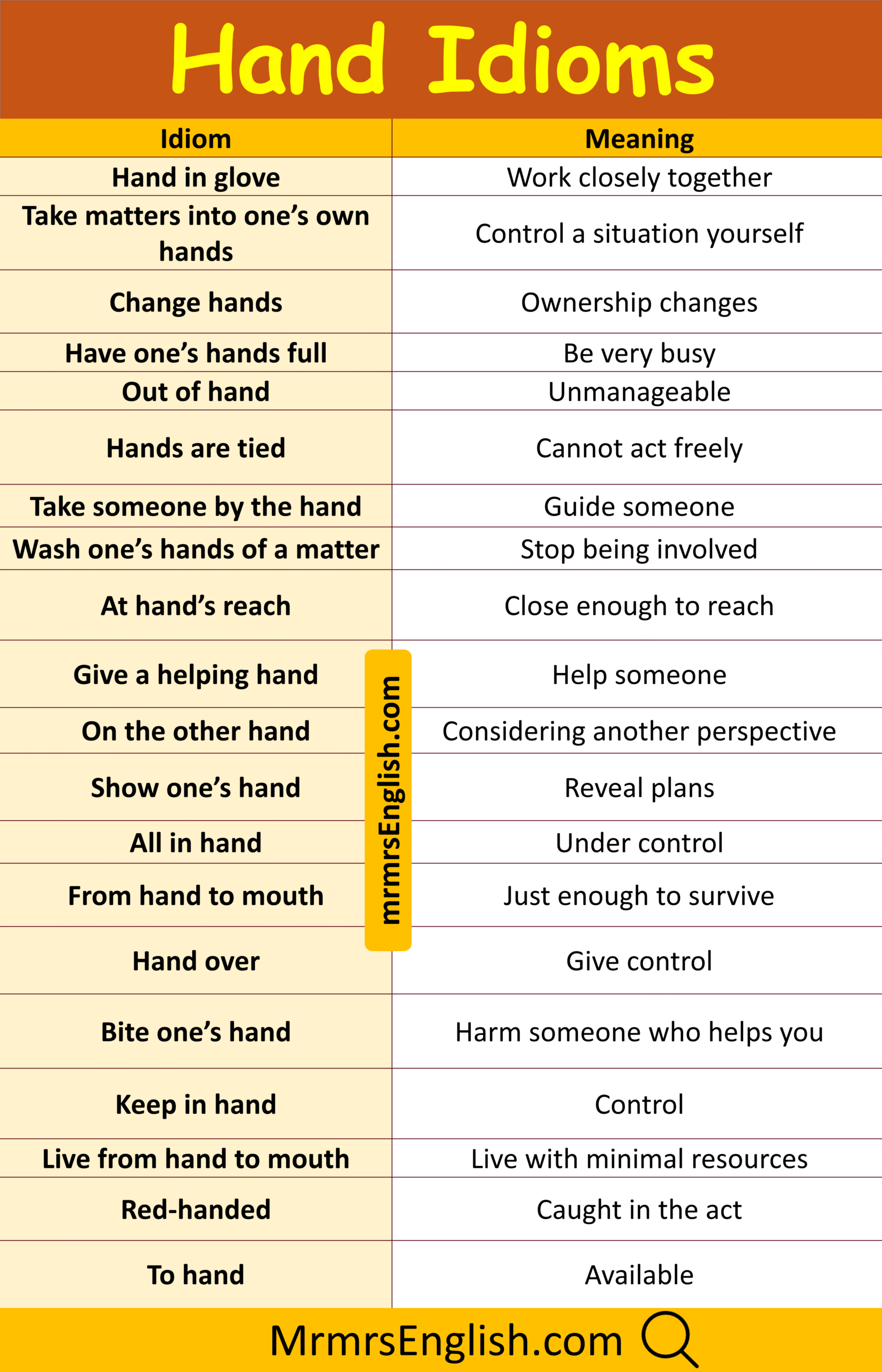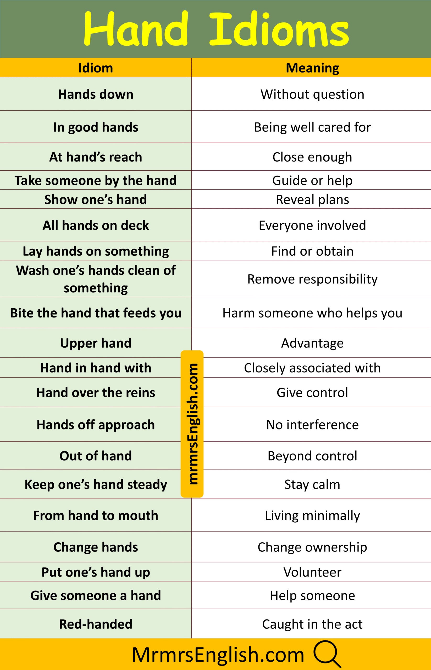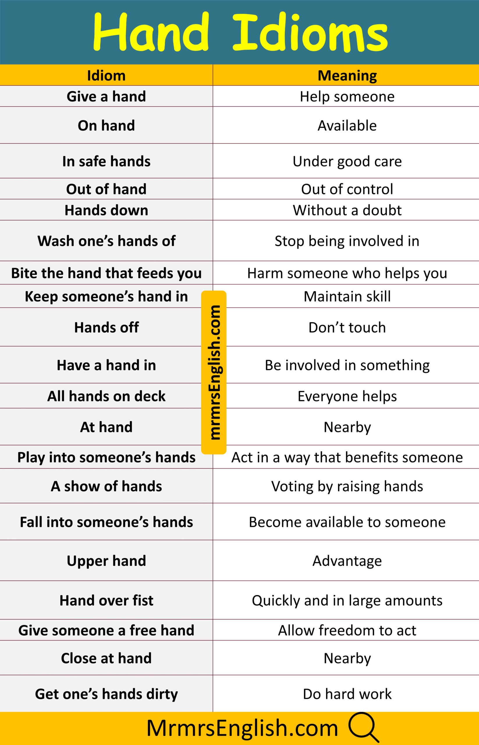 The word “hand” is often used in English idioms to express help, control, skill, and relationships. These idioms make everyday language more natural and expressive by showing actions or feelings in creative ways. For example, phrases like “lend a hand” mean to help someone, and “in safe hands” means being cared for or protected. Learning hand idioms helps English learners understand how native speakers use common words to express deeper meanings. In this article, you will learn hand idioms in English with their meanings and pictures to make learning simple, visual, and enjoyable. This guide will help you use these idioms confidently in daily conversations and writing.
