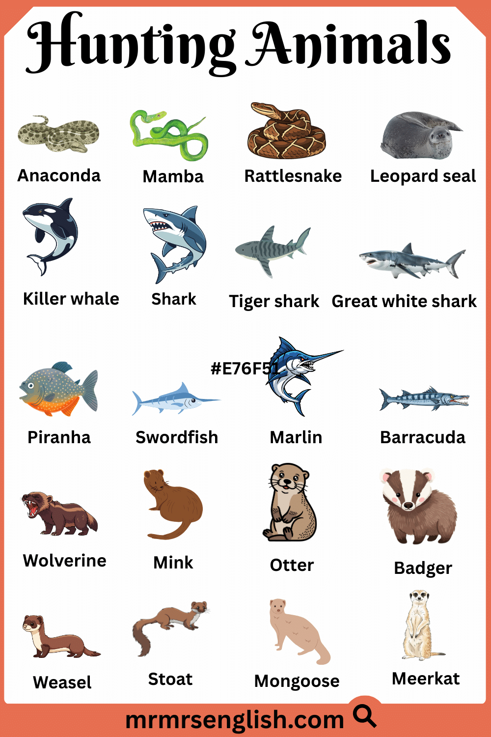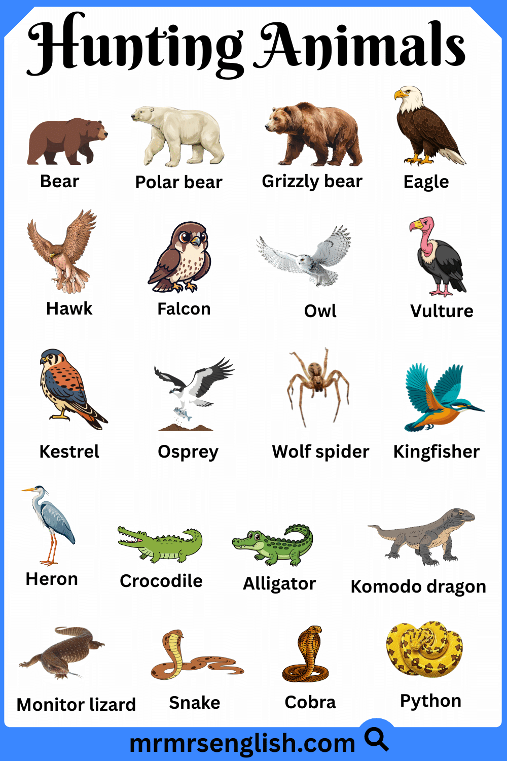 Hunting animals are those animals that search for other animals to get their food. They usually have sharp teeth, strong bodies, and fast movement, which help them survive in the wild. Learning the names of hunting animals in English is useful for students, nature lovers, and anyone interested in wildlife. In this article, Hunting Animals Names in English with Their Pictures, you will find common hunting animals along with clear images to help you recognize and remember them easily. This simple guide is designed to make learning animal names interesting, clear, and enjoyable for readers of all ages.