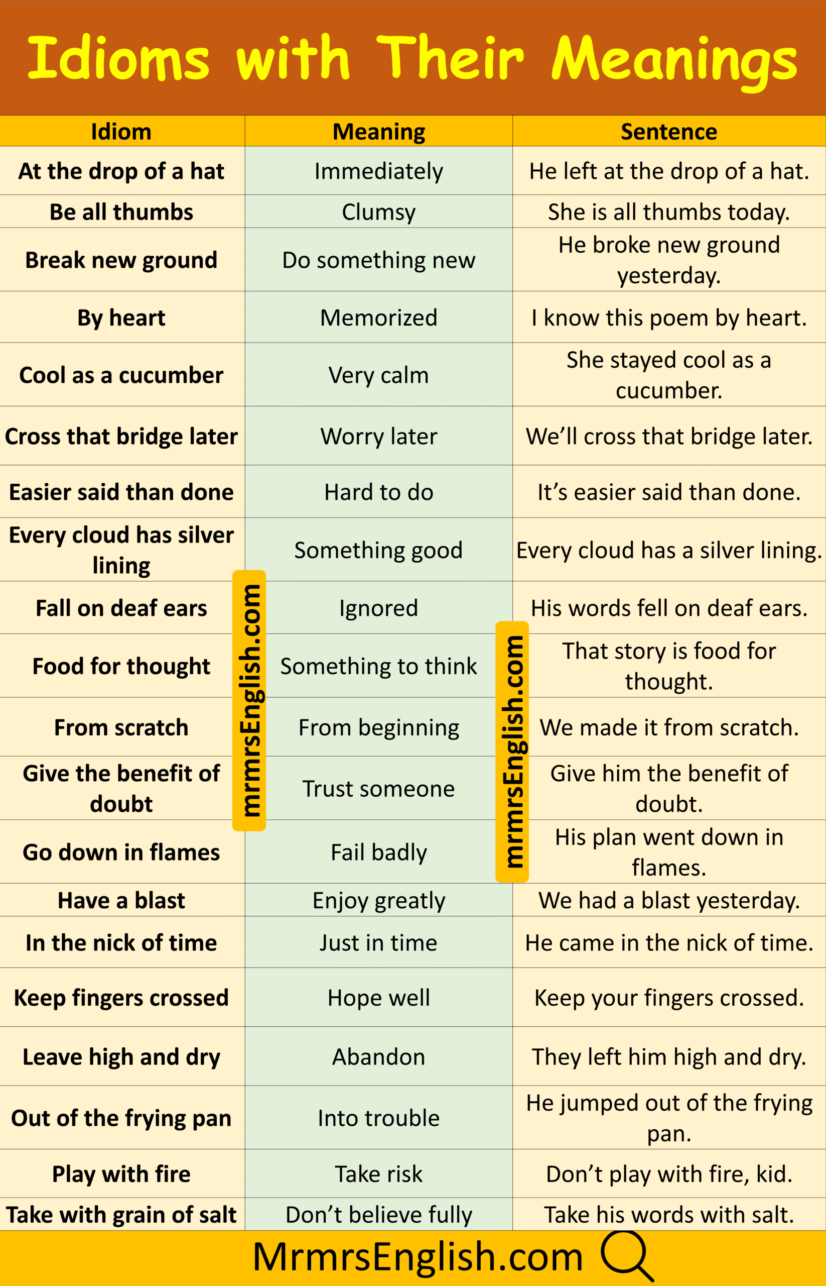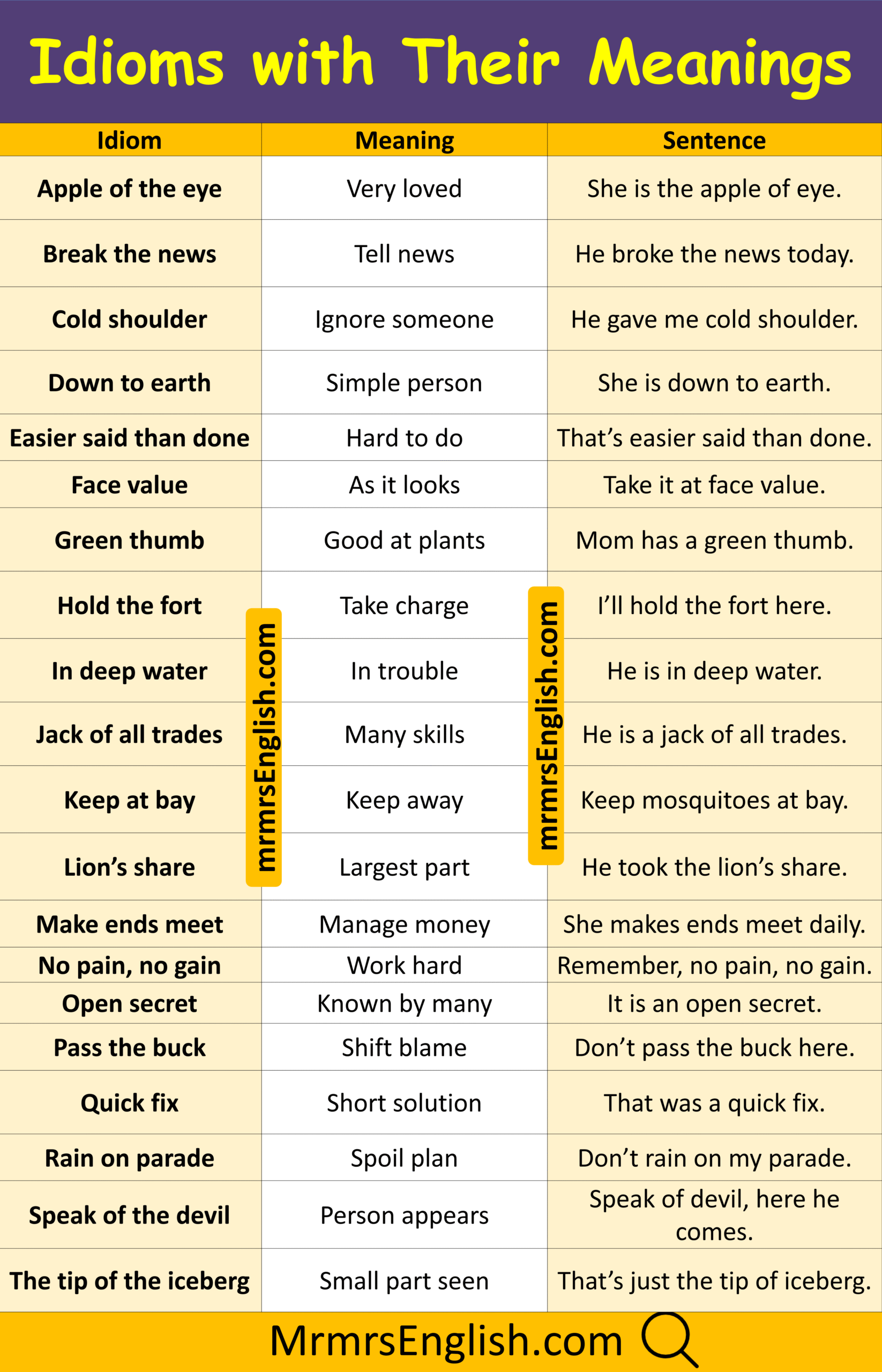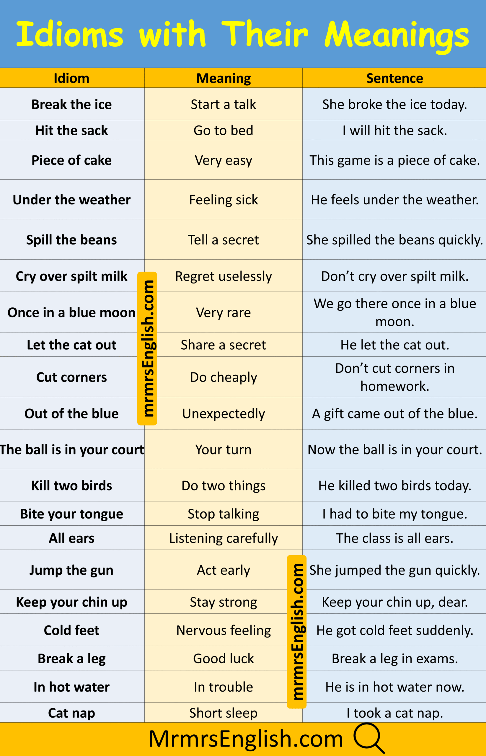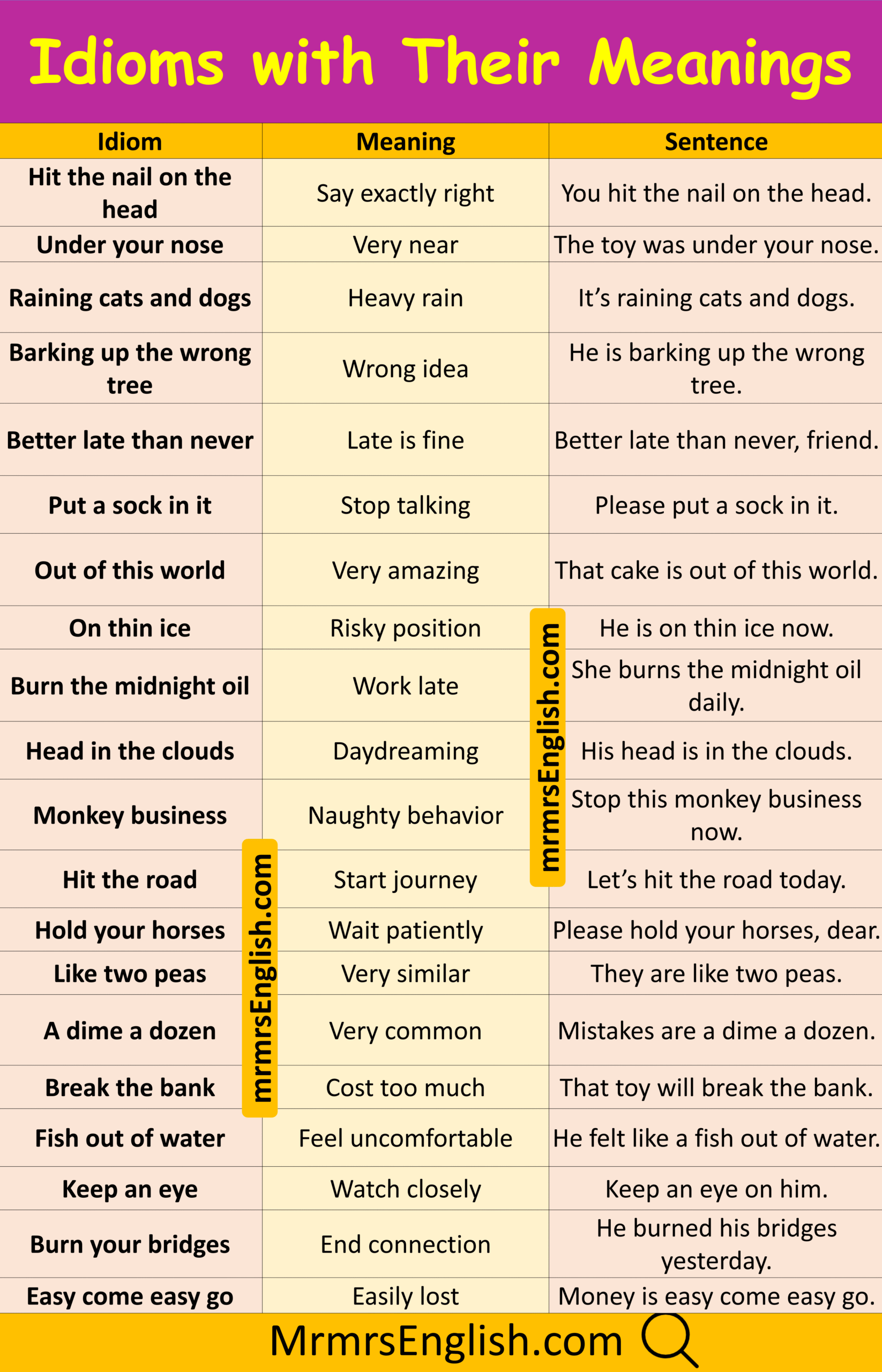Idioms are special phrases that have a meaning different from the words used in them. For kids, learning idioms is a fun way to understand how language can be creative and full of imagination. Idioms make conversations more colorful and interesting, and they also help children improve their English skills. When idioms are explained with easy meanings and pictures, it becomes much easier for kids to remember and use them in daily life. In this article, we will learn some common idioms with their simple meanings and pictures to make learning enjoyable and clear.