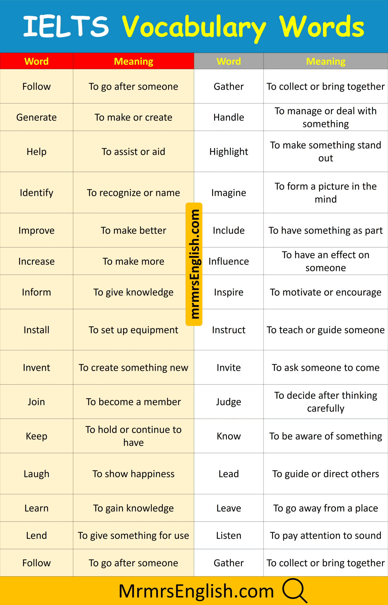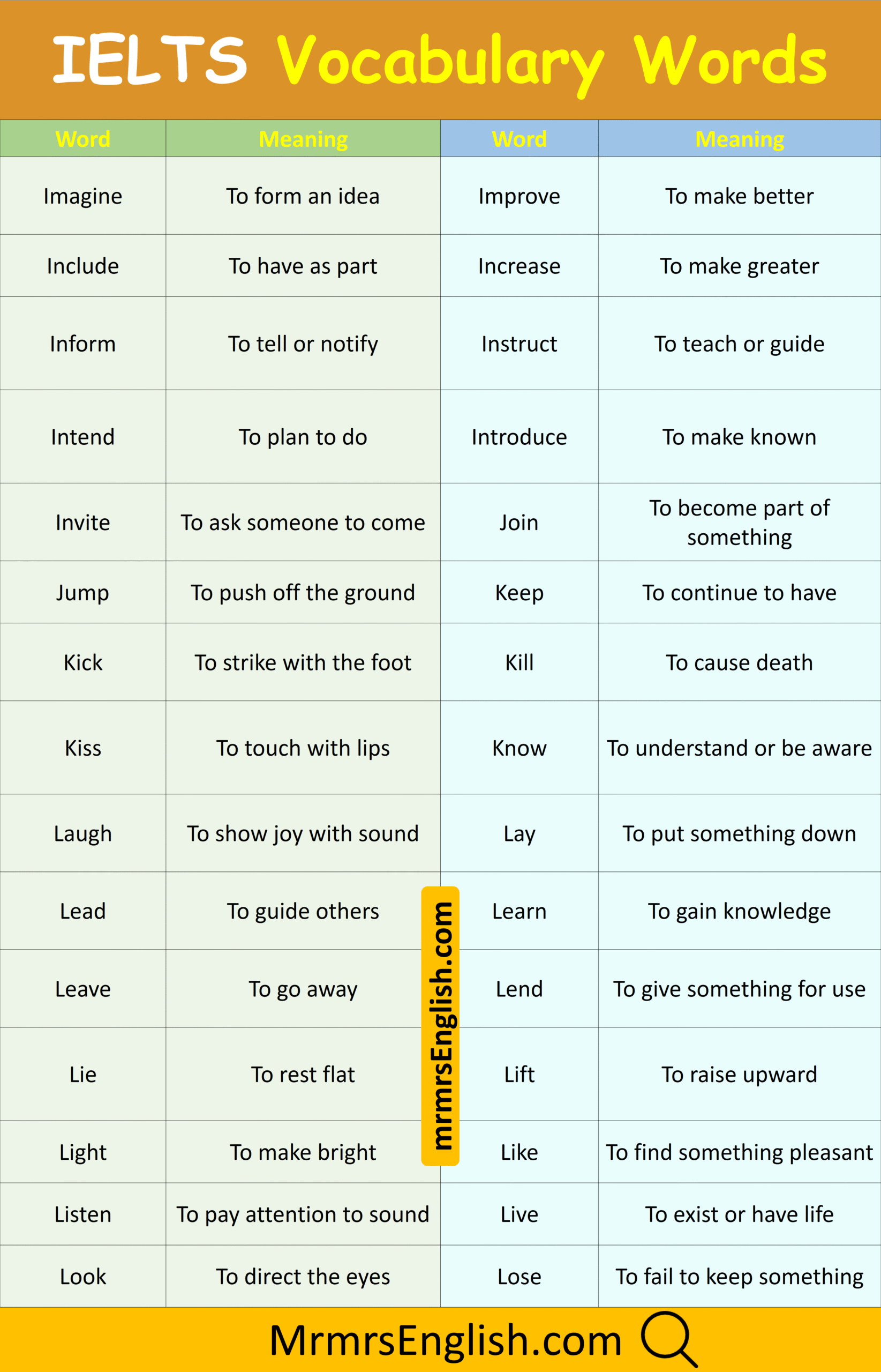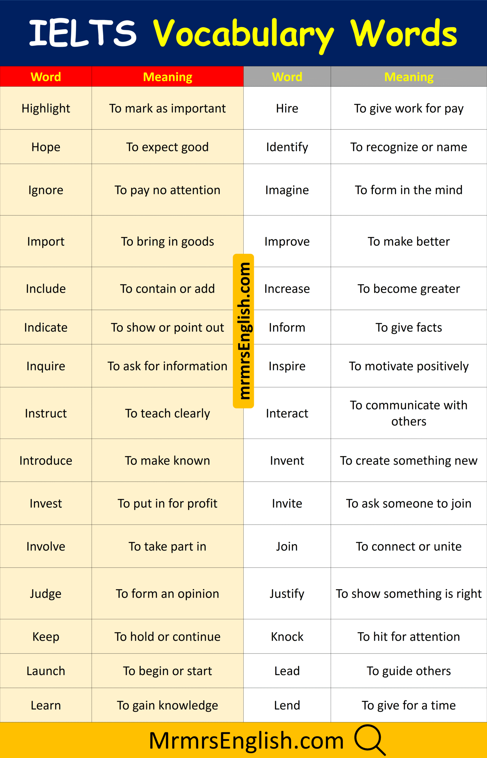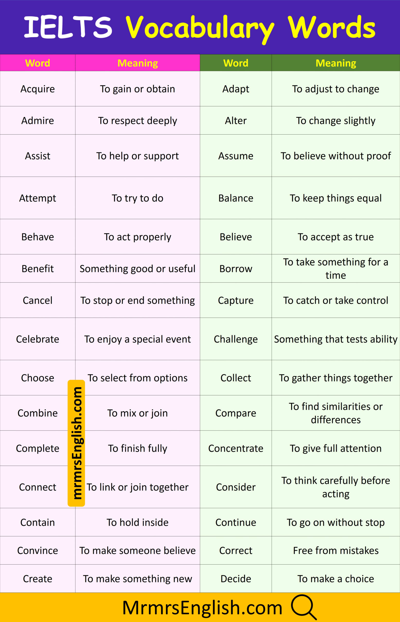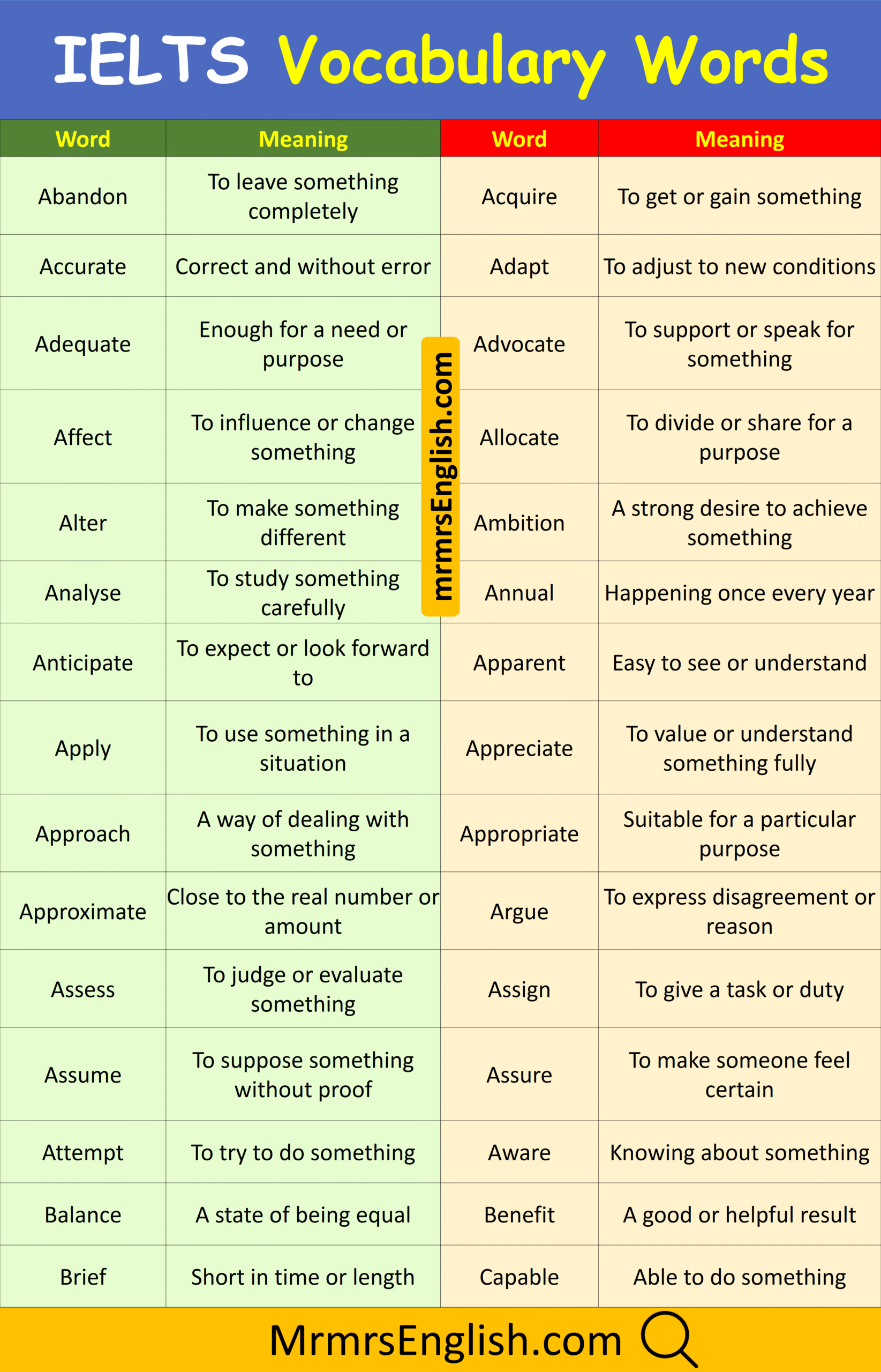 Learning IELTS vocabulary words with meanings in English is one of the best ways to prepare for the IELTS exam. A strong vocabulary helps you express your ideas clearly in speaking and writing, and it also improves your understanding in reading and listening sections. Knowing the right words can make a big difference in your overall band score. In this article, you will learn important IELTS vocabulary words with their clear meanings and pictures to make learning simple and effective. This guide is perfect for students who want to achieve a high score and communicate confidently in English.