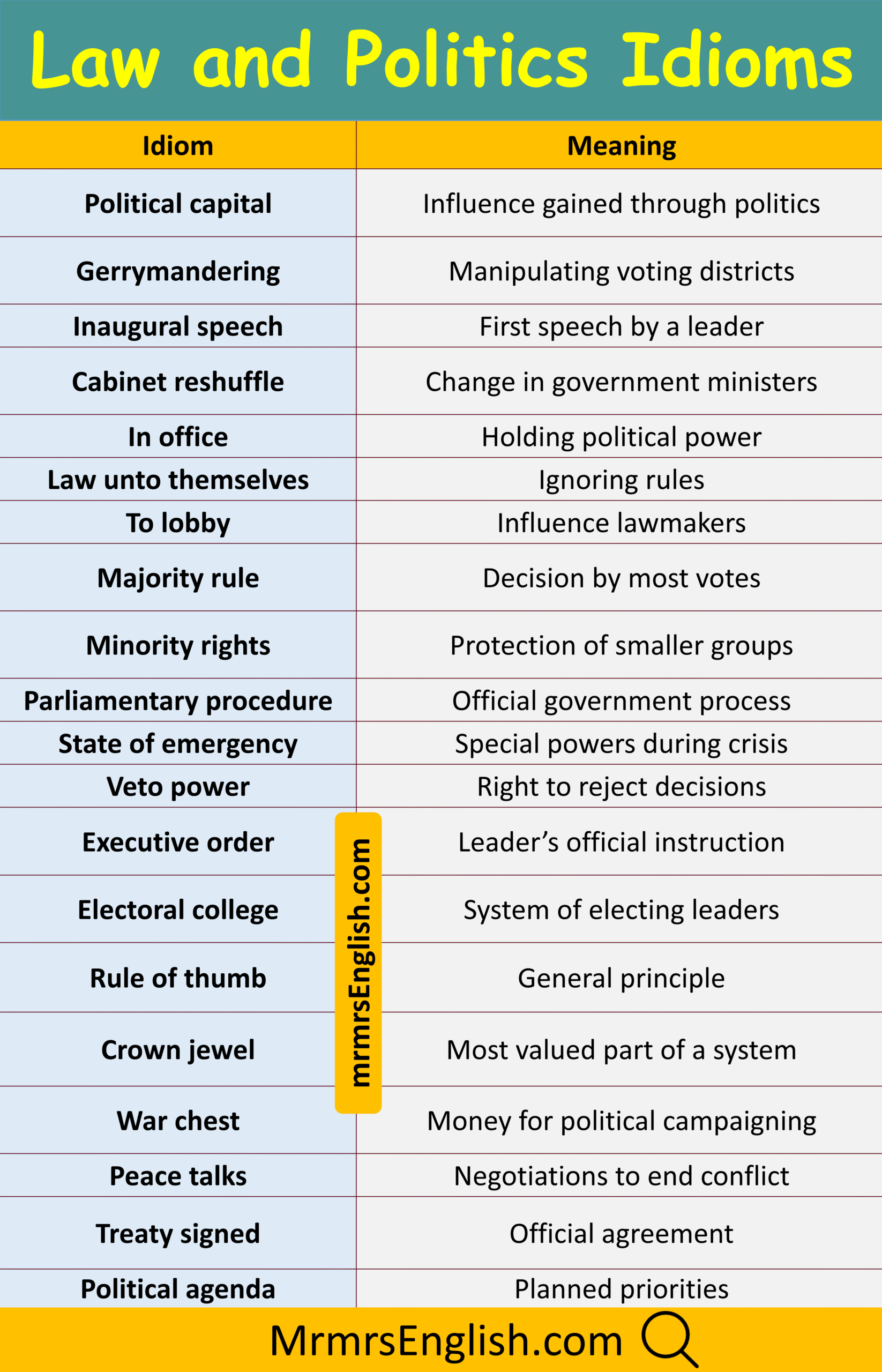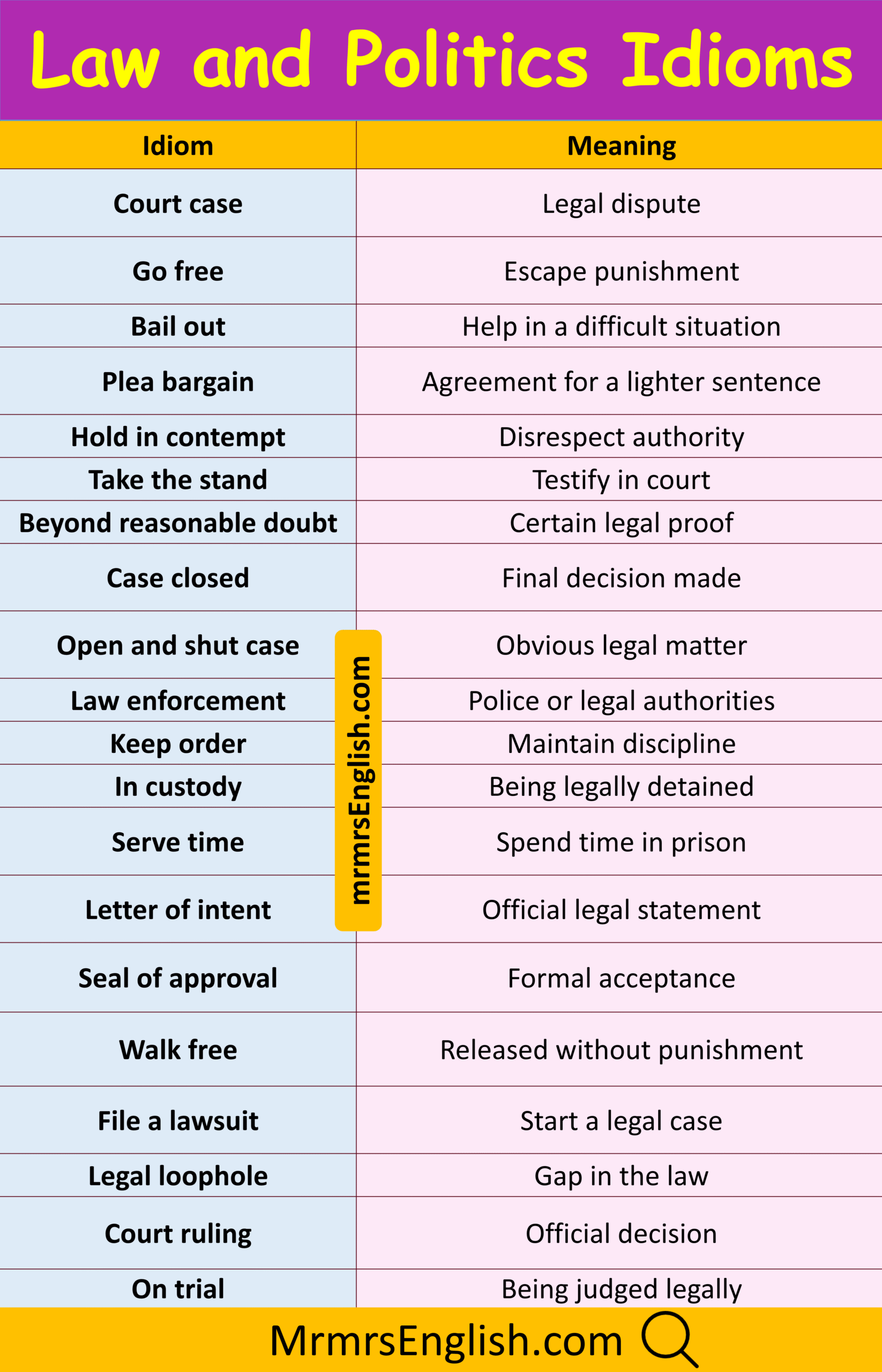Language becomes more powerful when we use idioms to express ideas in a creative way. In the world of law and politics, idioms help us talk about justice, rules, power, and government actions more clearly. These idioms are often used in news, speeches, and daily conversations to make messages stronger and more meaningful. For example, saying “above the law” means someone thinks they don’t have to follow the rules, while “a political hot potato” means a topic that people avoid because it causes strong arguments. In this article, you will learn useful law and politics idioms in English with their meanings and pictures to help you understand and use them easily in real-life situations.