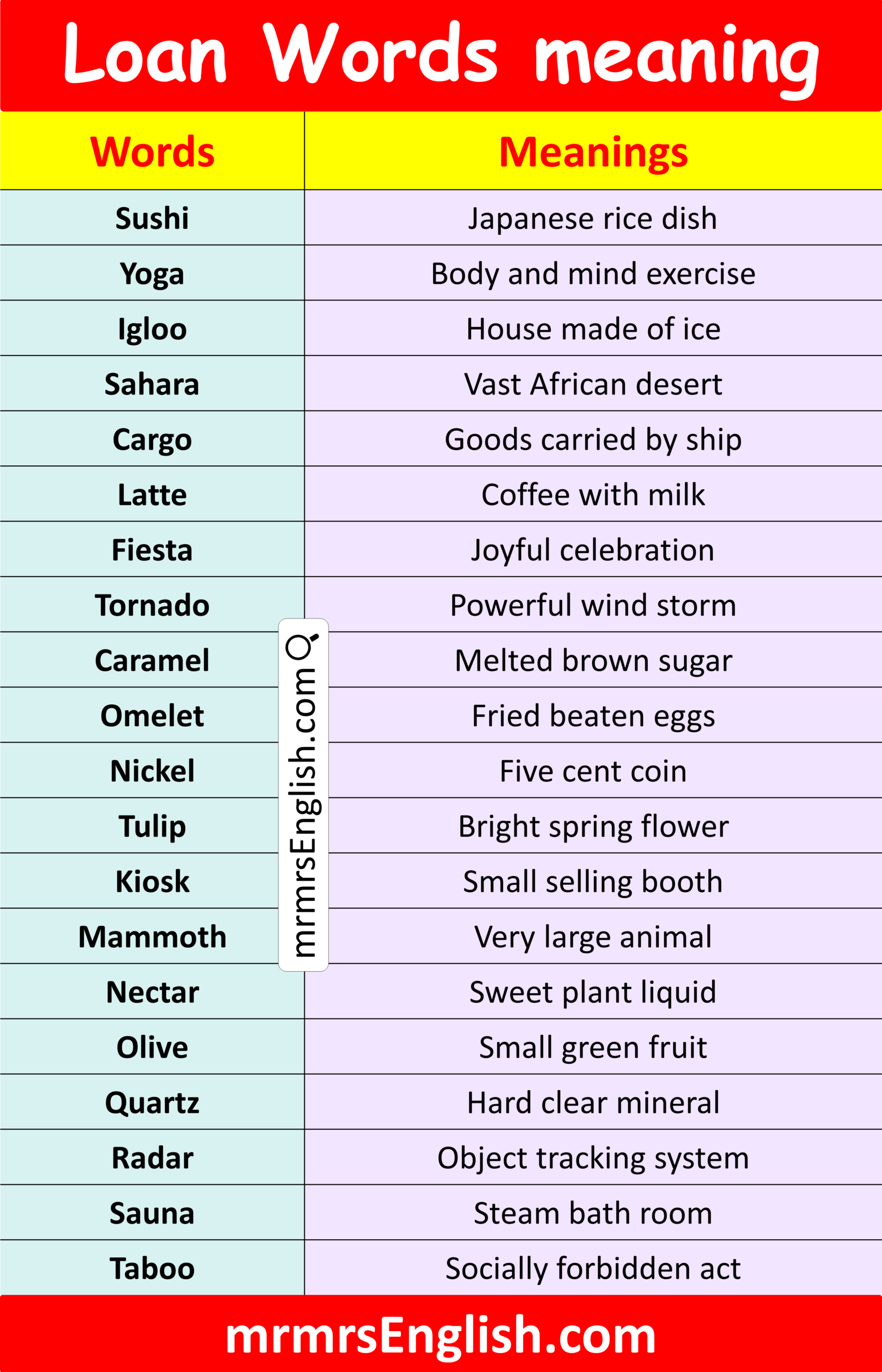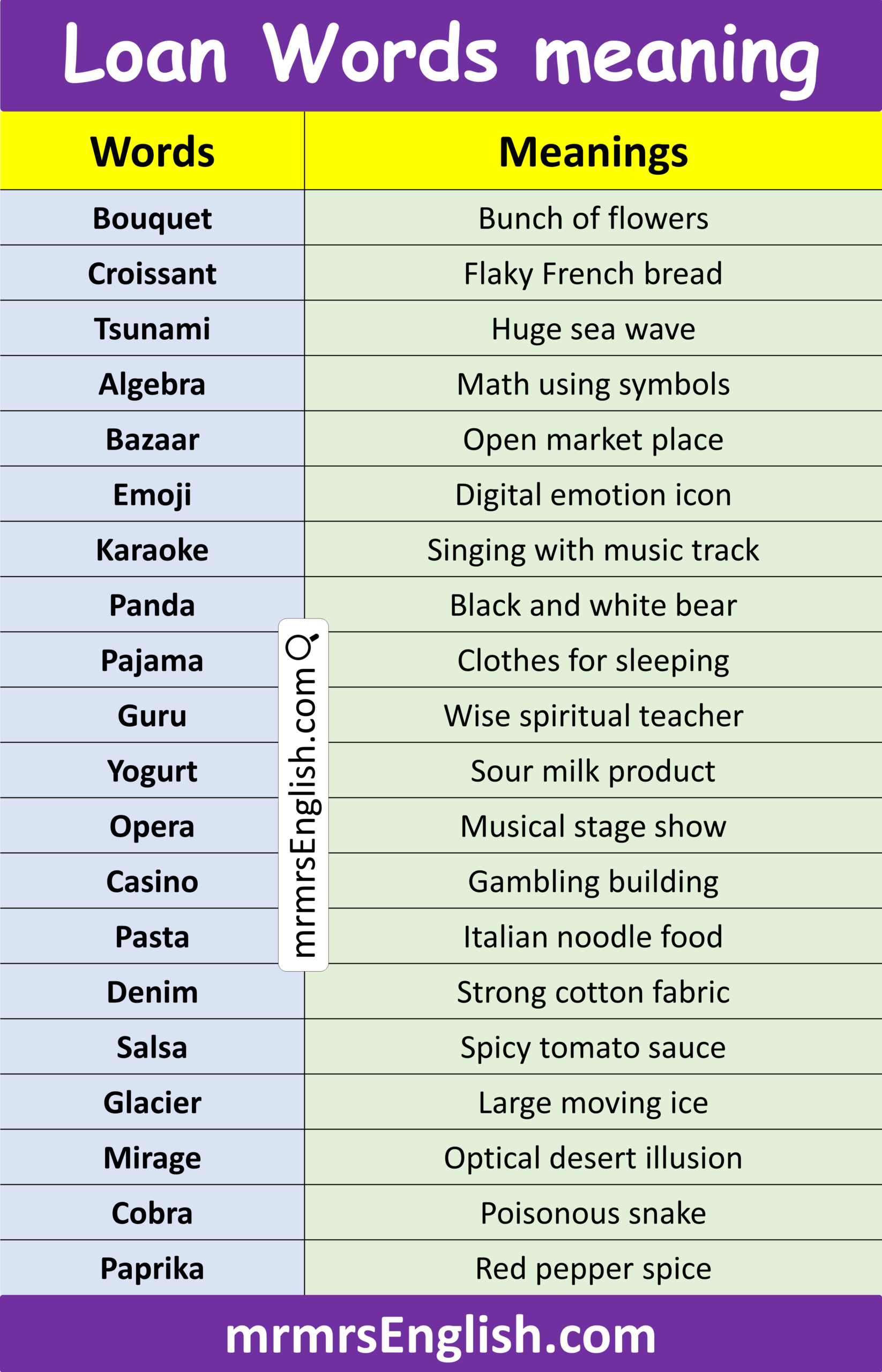 100 Loan Words with Meanings in EnglishWords Meanings Bouquet Bunch of flowers Croissant Flaky French bread Tsunami Huge sea wave Algebra Math using symbols Bazaar Open market place Emoji Digital emotion icon Karaoke Singing with music track Panda Black and white bear Pajama Clothes for sleeping Guru Wise spiritual teacher Yogurt Sour milk product Opera Musical stage show Casino Gambling building Pasta Italian noodle food Denim Strong cotton fabric Salsa Spicy tomato sauce Glacier Large moving ice Mirage Optical desert illusion Cobra Poisonous snake Paprika Red pepper spice