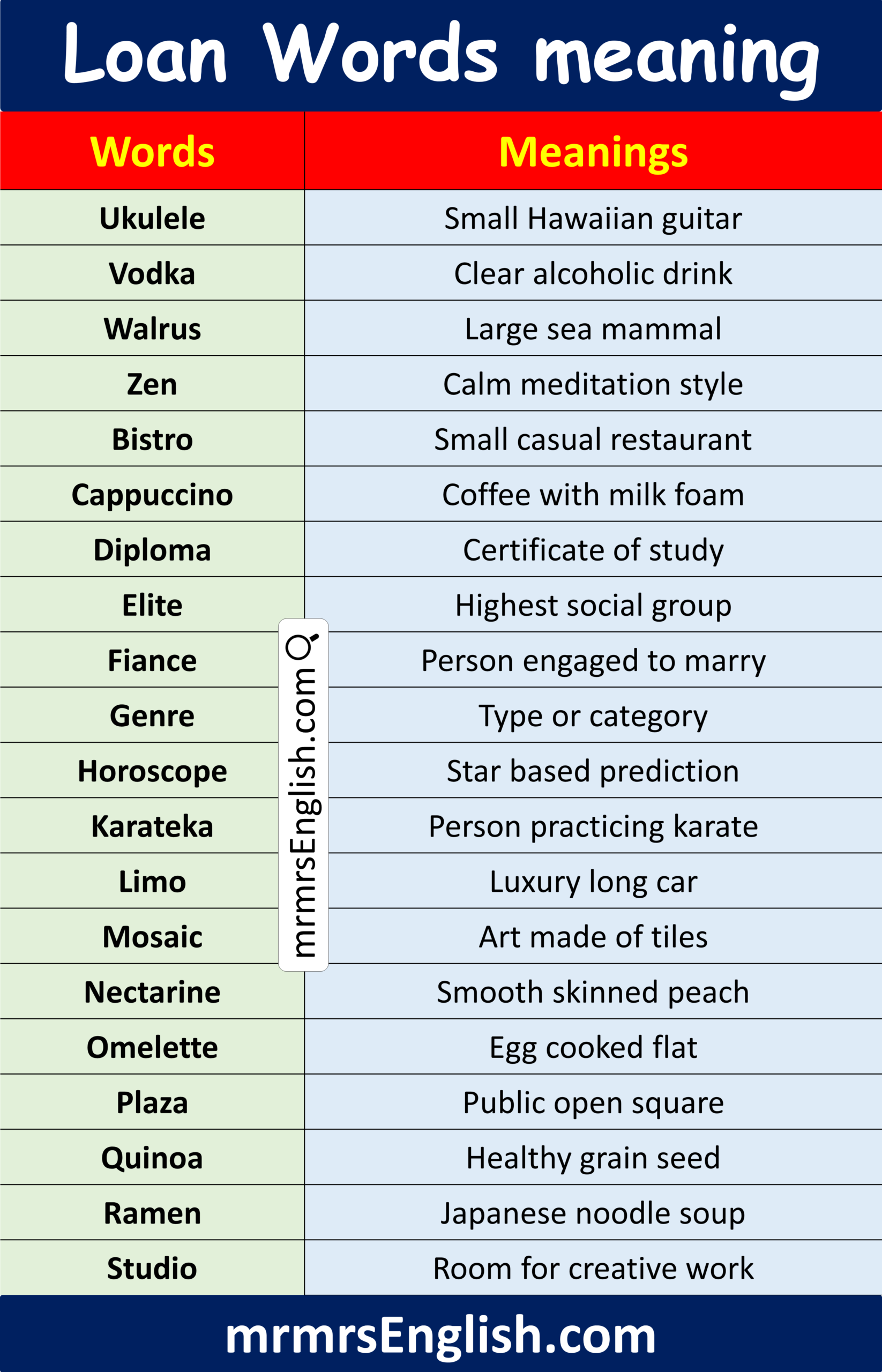 Common Loan Words in English with PicturesWord Meaning Ukulele Small Hawaiian guitar Vodka Clear alcoholic drink Walrus Large sea mammal Zen Calm meditation style Bistro Small casual restaurant Cappuccino Coffee with milk foam Diploma Certificate of study Elite Highest social group Fiance Person engaged to marry Genre Type or category Horoscope Star based prediction Karateka Person practicing karate Limo Luxury long car Mosaic Art made of tiles Nectarine Smooth skinned peach Omelette Egg cooked flat Plaza Public open square Quinoa Healthy grain seed Ramen Japanese noodle soup Studio Room for creative work