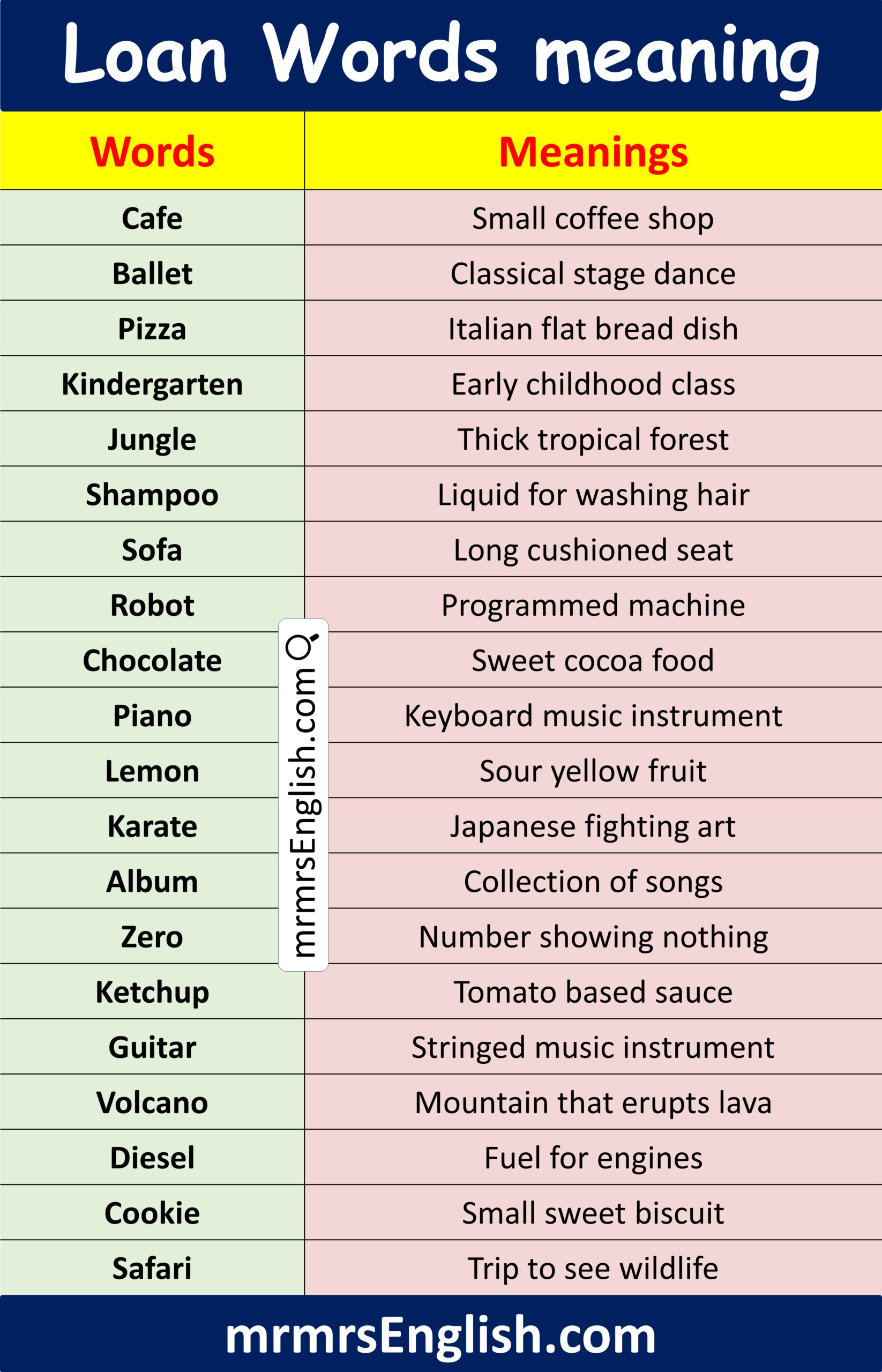 List of Loan Words in English with MeaningsWords Meanings Cafe Small coffee shop Ballet Classical stage dance Pizza Italian flat bread dish Kindergarten Early childhood class Jungle Thick tropical forest Shampoo Liquid for washing hair Sofa Long cushioned seat Robot Programmed machine Chocolate Sweet cocoa food Piano Keyboard music instrument Lemon Sour yellow fruit Karate Japanese fighting art Album Collection of songs Zero Number showing nothing Ketchup Tomato based sauce Guitar Stringed music instrument Volcano Mountain that erupts lava Diesel Fuel for engines Cookie Small sweet biscuit Safari Trip to see wildlife
