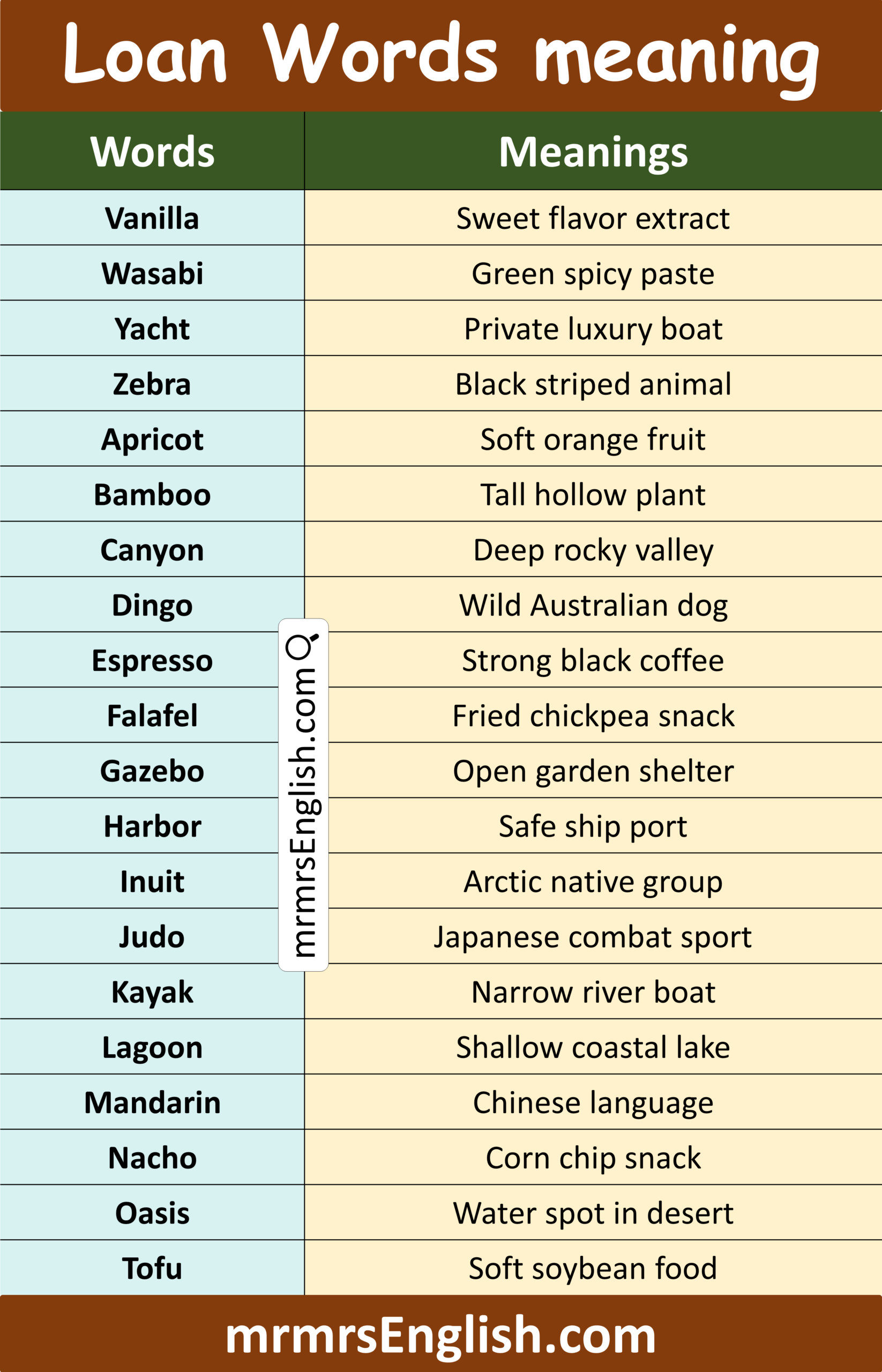 Simple Loan Words with Meanings and PicturesWord Meaning Vanilla Sweet flavor extract Wasabi Green spicy paste Yacht Private luxury boat Zebra Black striped animal Apricot Soft orange fruit Bamboo Tall hollow plant Canyon Deep rocky valley Dingo Wild Australian dog Espresso Strong black coffee Falafel Fried chickpea snack Gazebo Open garden shelter Harbor Safe ship port Inuit Arctic native group Judo Japanese combat sport Kayak Narrow river boat Lagoon Shallow coastal lake Mandarin Chinese language Nacho Corn chip snack Oasis Water spot in desert Tofu Soft soybean food