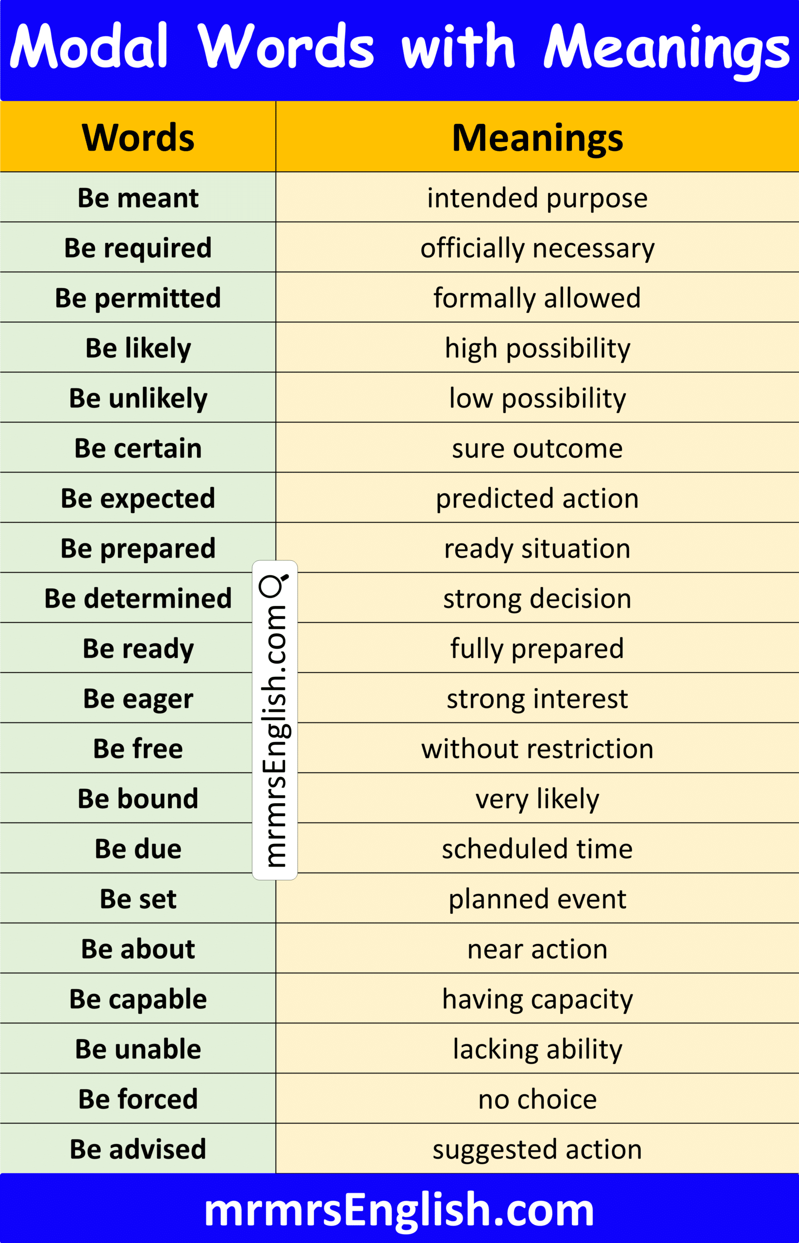 100 Modal Words with Meanings in English
