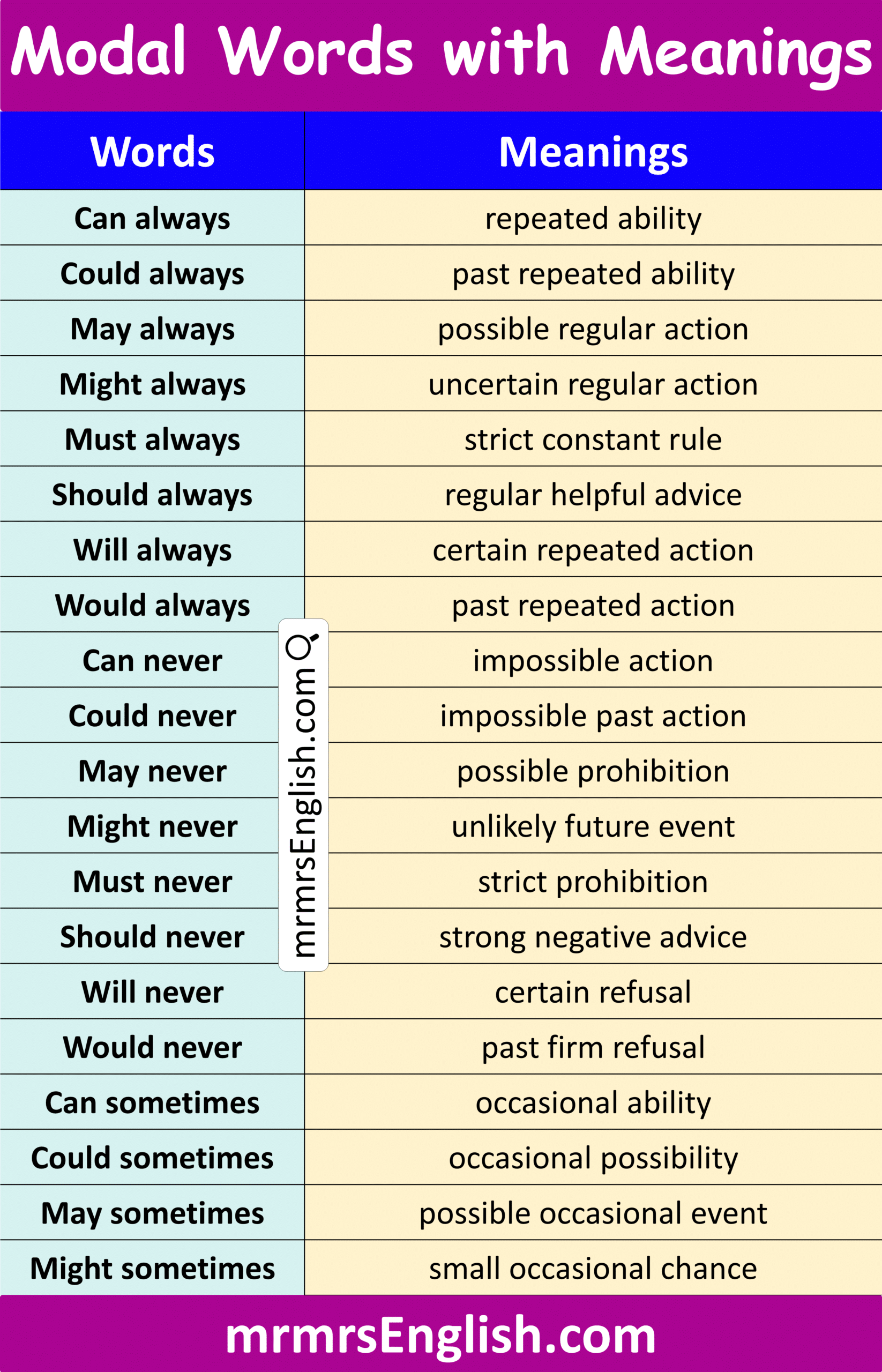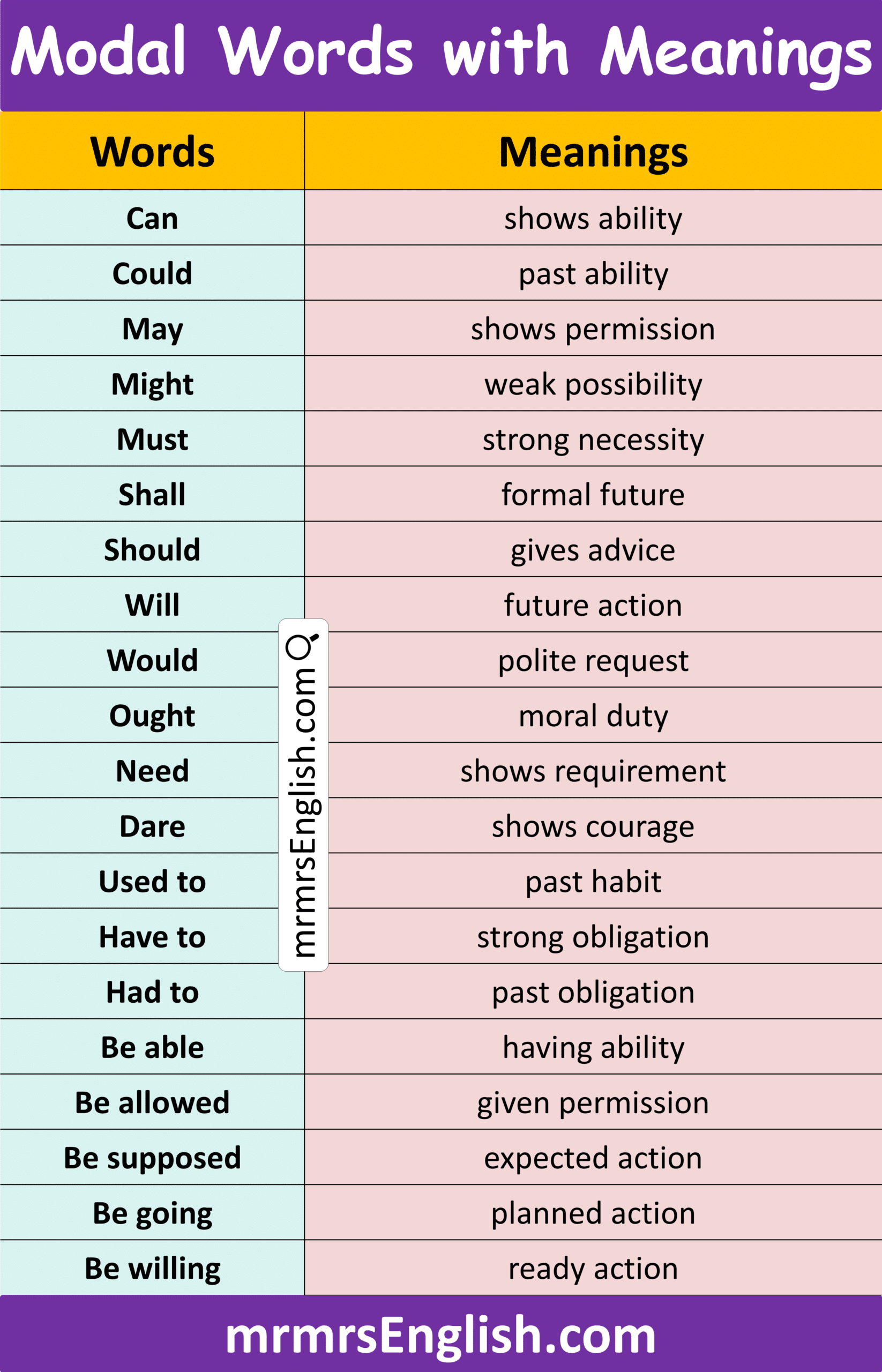 Common Modal Word and meaning with Pictures