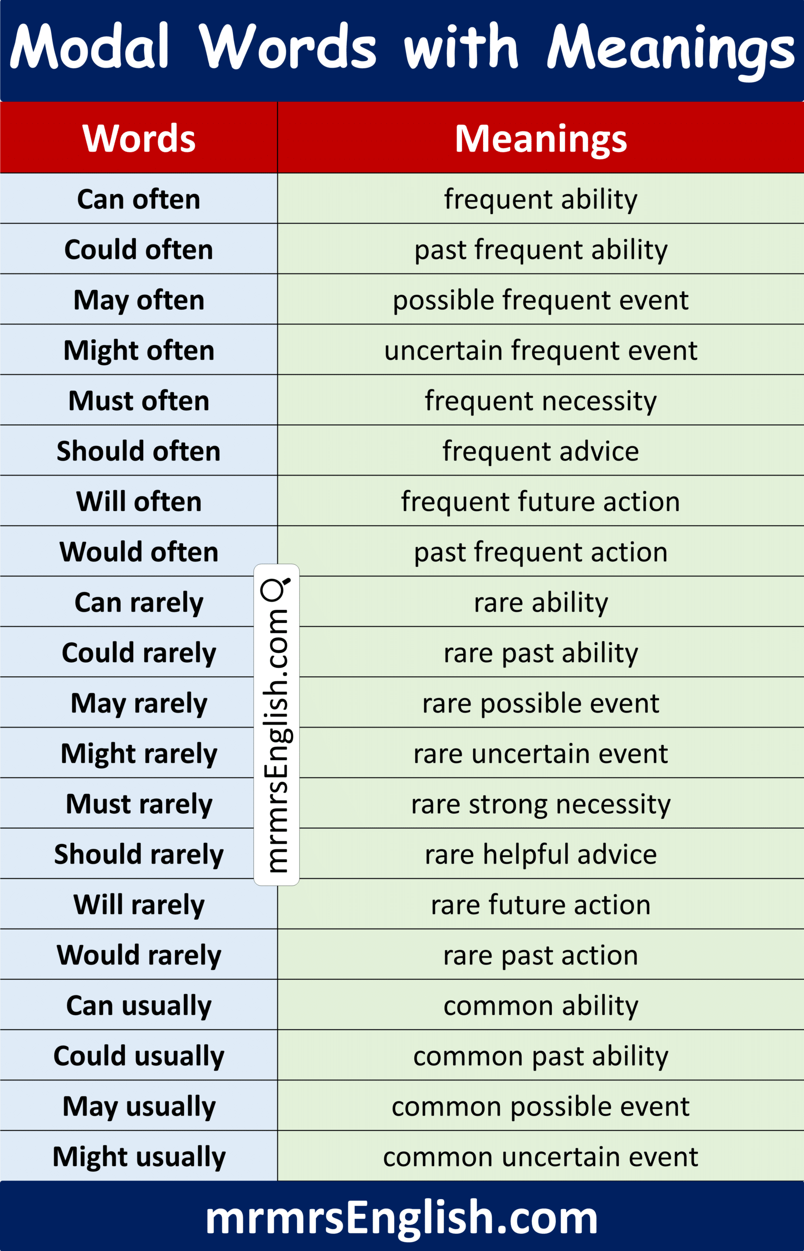 Useful Modal Words with Meanings in English