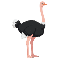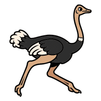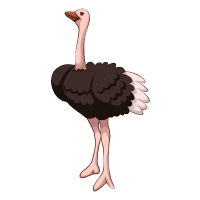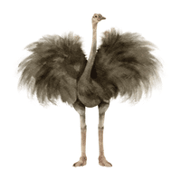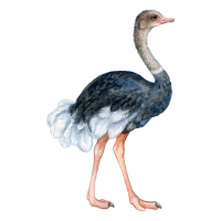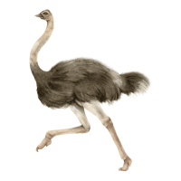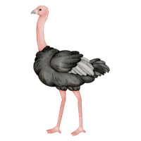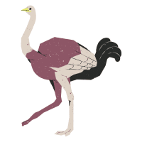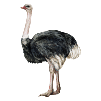 Large ostrich breed; strong, tall, heavy body, fast runner, social, hardy, commonly farmed for meat, skin, and decorative feathers.