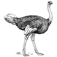 Ostrich found mainly in southern Africa; large, strong, dark-feathered, fast runner, calm temperament, often farmed for meat and feathers.